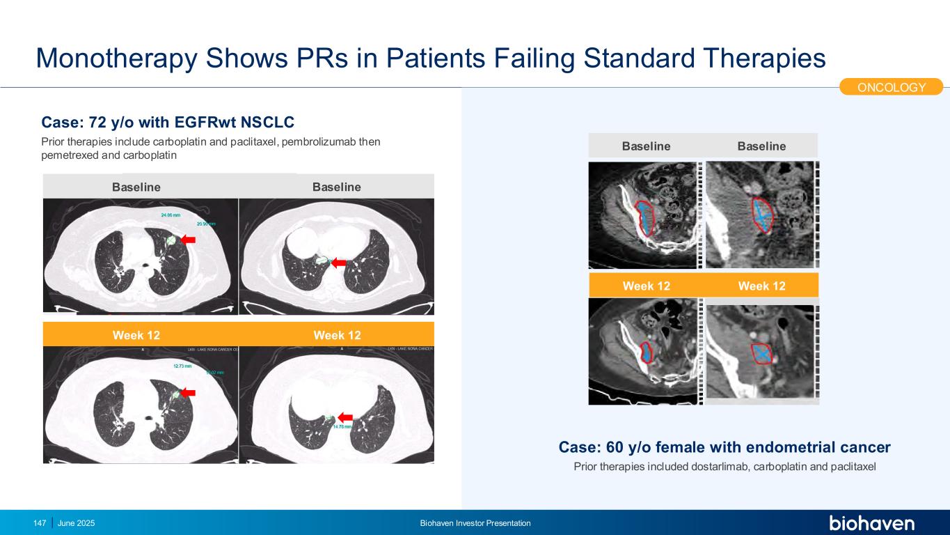 - Monotherapy Shows PRs in Patients Failing Standard Therapies  June 2025 Biohaven Investor Presentation147 Case: 60 y/o female with endometrial cancer  Prior therapies included dostarlimab, carboplatin and paclitaxel  ONCOLOGY Case: 72 y/o with EGFRwt NSCLC  Prior therapies include carboplatin and paclitaxel, pembrolizumab then  pemetrexed and carboplatin Week 12 Baseline Week 12 Baseline BaselineBaseline Week 12Week 12