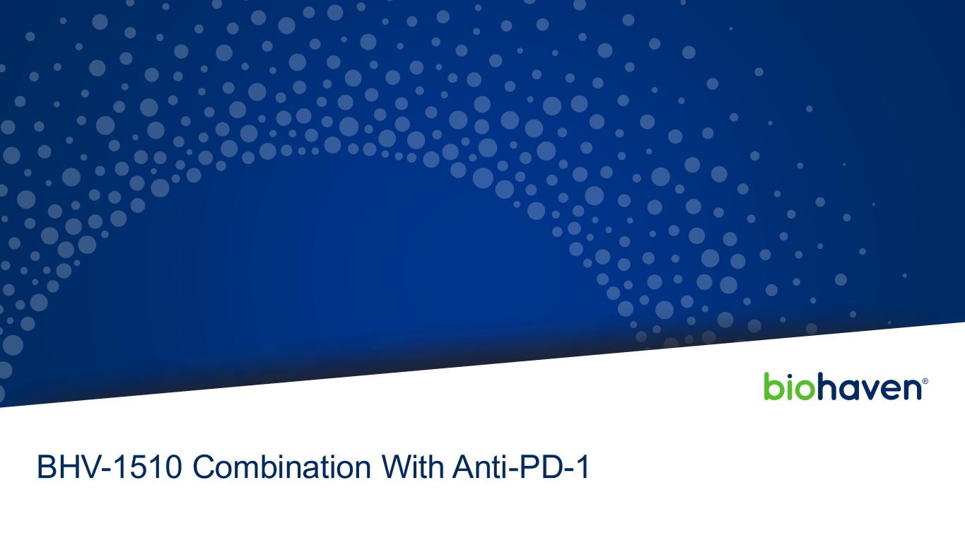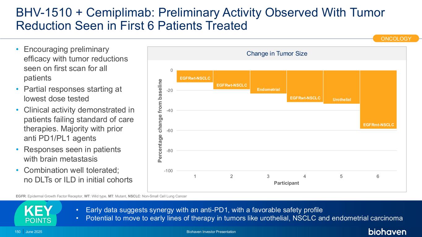 Change in Tumor Size  BHV-1510 + Cemiplimab: Preliminary Activity Observed With Tumor  Reduction Seen in First 6 Patients Treated • Encouraging preliminary  efficacy with tumor reductions  seen on first scan for all  patients  • Partial responses starting at  lowest dose tested  • Clinical activity demonstrated in  patients failing standard of care  therapies. Majority with prior  anti PD1/PL1 agents  • Responses seen in patients  with brain metastasis • Combination well tolerated; no DLTs or ILD in initial cohorts Biohaven Investor Presentation150 ONCOLOGY EGFRwt-NSCLC EGFRwt-NSCLC Endometrial EGFRwt-NSCLC Urothelial EGFRmt-NSCLC -100 -80 -60 -40 -20 0 P e rc e n ta g e  c h a n g e  f ro m  b a s e li n e EGFR: Epidermal Growth Factor Receptor, WT: Wild type, MT: Mutant, NSCLC: Non-Small Cell Lung Cancer • Early data suggests synergy with an anti-PD1, with a favorable safety profile  • Potential to move to early lines of therapy in tumors like urothelial, NSCLC and endometrial carcinoma KEY  POINTS June 2025 Participant 1 2 3 4 5 6