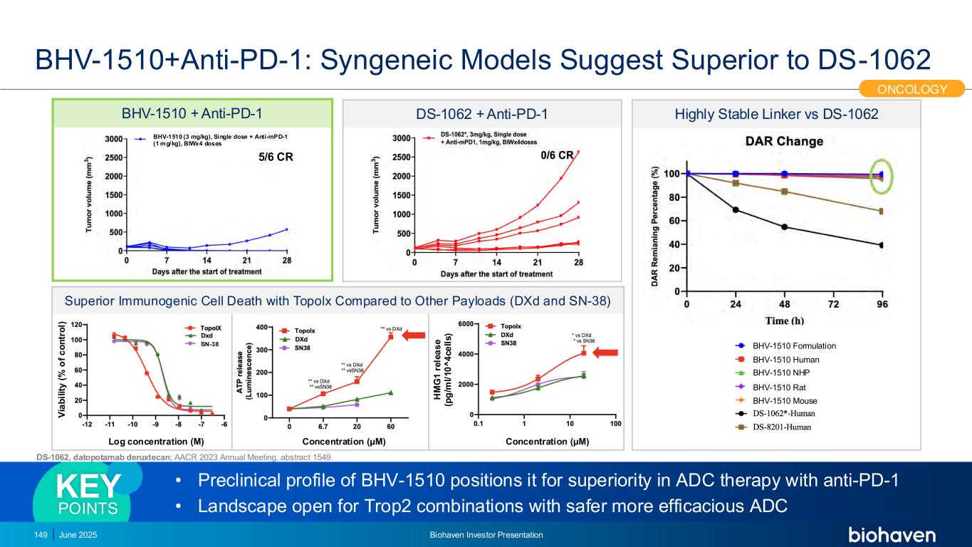SN-38 ** vs DXd ** vs SN-38 Concentration (µM) H M G 1  r e le a s e (p g /m l/ 1 0 ^ 4 c e ll s ) Concentration (µM) A T P  r e le a s e (L u m in e s c e n c e ) SN-38 ** vs DXd ** vs SN-38 ** vs DXd ** vs SN-38 ** vs DXd BHV-1510+Anti-PD-1: Syngeneic Models Suggest Superior to DS-1062 June 2025 Biohaven Investor Presentation149 DS-1062, datopotamab deruxtecan; AACR 2023 Annual Meeting, abstract 1549. V ia b il it y  ( %  o f  c o n tr o l) Log concentration (M) SN-38 BHV-1510 + Anti-PD-1 DS-1062 + Anti-PD-1 BHV-1510 (3 mg/kg), Single dose + Anti-mPD-1 (1 mg/kg), BIWx4 doses • Preclinical profile of BHV-1510 positions it for superiority in ADC therapy with anti-PD-1 • Landscape open for Trop2 combinations with safer more efficacious ADC KEY  POINTS ONCOLOGY Highly Stable Linker vs DS-1062 Superior Immunogenic Cell Death with Topolx Compared to Other Payloads (DXd and SN-38) 5/6 CR BHV-1510 Formulation BHV-1510 Human BHV-1510 NHP BHV-1510 Rat BHV-1510 Mouse