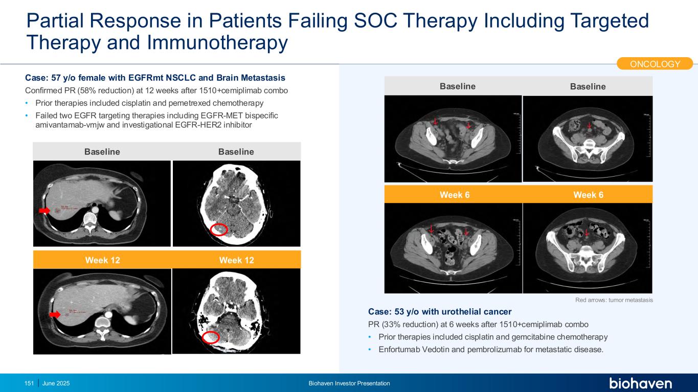 Partial Response in Patients Failing SOC Therapy Including Targeted  Therapy and Immunotherapy June 2025 Biohaven Investor Presentation151 Red arrows: tumor metastasis Week 6 Baseline Week 6 Baseline Case: 53 y/o with urothelial cancer  PR (33% reduction) at 6 weeks after 1510+cemiplimab combo • Prior therapies included cisplatin and gemcitabine chemotherapy • Enfortumab Vedotin and pembrolizumab for metastatic disease.  ONCOLOGY Case: 57 y/o female with EGFRmt NSCLC and Brain Metastasis Confirmed PR (58% reduction) at 12 weeks after 1510+cemiplimab combo • Prior therapies included cisplatin and pemetrexed chemotherapy • Failed two EGFR targeting therapies including EGFR-MET bispecific  amivantamab-vmjw and investigational EGFR-HER2 inhibitor Week 12 Baseline Week 12 Baseline