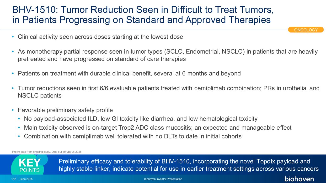 BHV-1510: Tumor Reduction Seen in Difficult to Treat Tumors,  in Patients Progressing on Standard and Approved Therapies • Clinical activity seen across doses starting at the lowest dose • As monotherapy partial response seen in tumor types (SCLC, Endometrial, NSCLC) in patients that are heavily  pretreated and have progressed on standard of care therapies • Patients on treatment with durable clinical benefit, several at 6 months and beyond • Tumor reductions seen in first 6/6 evaluable patients treated with cemiplimab combination; PRs in urothelial and  NSCLC patients  • Favorable preliminary safety profile  • No payload-associated ILD, low GI toxicity like diarrhea, and low hematological toxicity • Main toxicity observed is on-target Trop2 ADC class mucositis; an expected and manageable effect • Combination with cemiplimab well tolerated with no DLTs to date in initial cohorts June 2025 Biohaven Investor Presentation152 ONCOLOGY Preliminary efficacy and tolerability of BHV-1510, incorporating the novel TopoIx payload and  highly stable linker, indicate potential for use in earlier treatment settings across various cancers KEY  POINTS Prelim data from ongoing study. Data cut off May 2, 2025