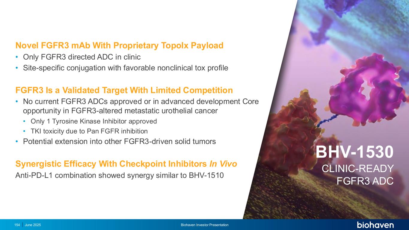 Novel FGFR3 mAb With Proprietary TopoIx Payload • Only FGFR3 directed ADC in clinic • Site-specific conjugation with favorable nonclinical tox profile FGFR3 Is a Validated Target With Limited Competition • No current FGFR3 ADCs approved or in advanced development Core  opportunity in FGFR3-altered metastatic urothelial cancer  • Only 1 Tyrosine Kinase Inhibitor approved  • TKI toxicity due to Pan FGFR inhibition  • Potential extension into other FGFR3-driven solid tumors Synergistic Efficacy With Checkpoint Inhibitors In Vivo Anti-PD-L1 combination showed synergy similar to BHV-1510 June 2025 Biohaven Investor Presentation154 BHV-1530 CLINIC-READY FGFR3 ADC