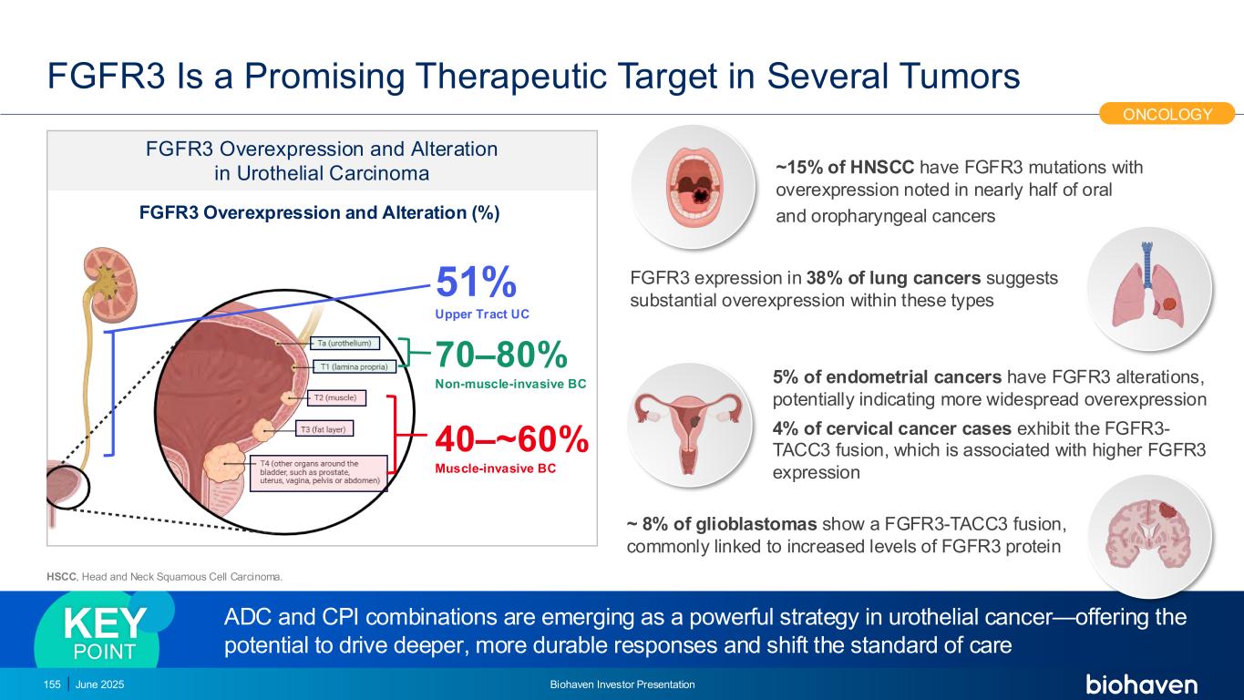 FGFR3 Is a Promising Therapeutic Target in Several Tumors June 2025 Biohaven Investor Presentation155 ONCOLOGY 5% of endometrial cancers have FGFR3 alterations,  potentially indicating more widespread overexpression 4% of cervical cancer cases exhibit the FGFR3- TACC3 fusion, which is associated with higher FGFR3  expression FGFR3 expression in 38% of lung cancers suggests  substantial overexpression within these types FGFR3 Overexpression and Alteration  in Urothelial Carcinoma FGFR3 Overexpression and Alteration (%)  51% Upper Tract UC 40–~60% Muscle-invasive BC 70–80% Non-muscle-invasive BC ~15% of HNSCC have FGFR3 mutations with  overexpression noted in nearly half of oral  and oropharyngeal cancers ADC and CPI combinations are emerging as a powerful strategy in urothelial cancer—offering the  potential to drive deeper, more durable responses and shift the standard of care  KEY  POINT ~ 8% of glioblastomas show a FGFR3-TACC3 fusion,  commonly linked to increased levels of FGFR3 protein HSCC, Head and Neck Squamous Cell Carcinoma.