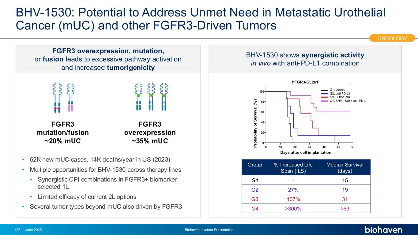 BHV-1530: Potential to Address Unmet Need in Metastatic Urothelial  Cancer (mUC) and other FGFR3-Driven Tumors June 2025 Biohaven Investor Presentation156 P ro b a b il it y  o f  S u rv iv a l  (% ) Days after cell implantation BHV-1530 shows synergistic activity  in vivo with anti-PD-L1 combination G1. vehicle  G2. anti-PD-L1  G3. BHV-1530  G4. BHV-1530 + anti-PD-L1 hFGR3-GL261 Group % Increased Life  Span (ILS) Median Survival  (days) G1 - 15 G2 27% 19 G3 107% 31 G4 >300% >63 • 62K new mUC cases, 14K deaths/year in US (2023) • Multiple opportunities for BHV-1530 across therapy lines • Synergistic CPI combinations in FGFR3+ biomarker- selected 1L • Limited efficacy of current 2L options • Several tumor types beyond mUC also driven by FGFR3 FGFR3  mutation/fusion ~20% mUC FGFR3  overexpression  ~35% mUC FGFR3 overexpression, mutation,  or fusion leads to excessive pathway activation  and increased tumorigenicity ONCOLOGY