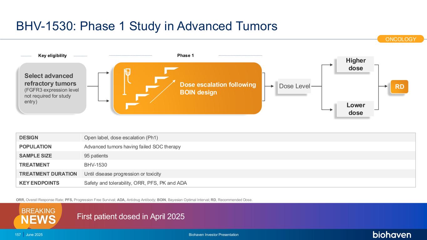 BHV-1530: Phase 1 Study in Advanced Tumors June 2025 Biohaven Investor Presentation157 DESIGN Open label, dose escalation (Ph1)  POPULATION Advanced tumors having failed SOC therapy SAMPLE SIZE 95 patients TREATMENT BHV-1530  TREATMENT DURATION Until disease progression or toxicity   KEY ENDPOINTS Safety and tolerability, ORR, PFS, PK and ADA ORR, Overall Response Rate; PFS, Progression Free Survival; ADA, Antidrug Antibody; BOIN, Bayesian Optimal Interval; RD, Recommended Dose. RD Lower  dose Key eligibility Phase 1 Select advanced  refractory tumors (FGFR3 expression level  not required for study  entry) Dose escalation following  BOIN design Higher  dose First patient dosed in April 2025NEWS BREAKING Dose Level ONCOLOGY