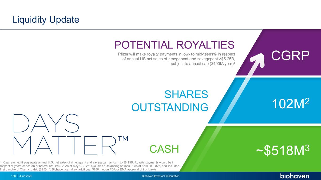 Liquidity Update CASH SHARES  OUTSTANDING POTENTIAL ROYALTIES Pfizer will make royalty payments in low- to mid-teens% in respect  of annual US net sales of rimegepant and zavegepant >$5.25B,  subject to annual cap ($400M/year)1 ~$518M3 102M2 CGRP June 2025 Biohaven Investor Presentation158 1. Cap reached if aggregate annual U.S. net sales of rimegepant and zavegepant amount to $8.15B. Royalty payments would be in  respect of years ended on or before 12/31/40. 2. As of May 9, 2025; excludes outstanding options. 3 As of April 30, 2025, and  includes  first tranche of Oberland deb ($250m); Biohaven can draw additional $150m upon FDA or EMA approval of troriluzole