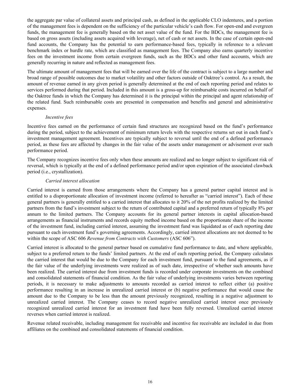 the aggregate par value of collateral assets and principal cash, as defined in the applicable CLO indentures, and a portion of the management fees is dependent on the sufficiency of the particular vehicle’s cash flow. For open-end and evergreen funds, the management fee is generally based on the net asset value of the fund. For the BDCs, the management fee is based on gross assets (including assets acquired with leverage), net of cash or net assets. In the case of certain open-end fund accounts, the Company has the potential to earn performance-based fees, typically in reference to a relevant benchmark index or hurdle rate, which are classified as management fees. The Company also earns quarterly incentive fees on the investment income from certain evergreen funds, such as the BDCs and other fund accounts, which are generally recurring in nature and reflected as management fees. The ultimate amount of management fees that will be earned over the life of the contract is subject to a large number and broad range of possible outcomes due to market volatility and other factors outside of Oaktree’s control. As a result, the amount of revenue earned in any given period is generally determined at the end of each reporting period and relates to services performed during that period. Included in this amount is a gross-up for reimbursable costs incurred on behalf of the Oaktree funds in which the Company has determined it is the principal within the principal and agent relationship of the related fund. Such reimbursable costs are presented in compensation and benefits and general and administrative expenses. Incentive fees Incentive fees earned on the performance of certain fund structures are recognized based on the fund’s performance during the period, subject to the achievement of minimum return levels with the respective returns set out in each fund’s investment management agreement. Incentives are typically subject to reversal until the end of a defined performance period, as these fees are affected by changes in the fair value of the assets under management or advisement over such performance period. The Company recognizes incentive fees only when these amounts are realized and no longer subject to significant risk of reversal, which is typically at the end of a defined performance period and/or upon expiration of the associated clawback period (i.e., crystallization). Carried interest allocation Carried interest is earned from those arrangements where the Company has a general partner capital interest and is entitled to a disproportionate allocation of investment income (referred to hereafter as “carried interest”). Each of these general partners is generally entitled to a carried interest that allocates to it 20% of the net profits realized by the limited partners from the fund’s investment subject to the return of contributed capital and a preferred return of typically 8% per annum to the limited partners. The Company accounts for its general partner interests in capital allocation-based arrangements as financial instruments and records equity method income based on the proportionate share of the income of the investment fund, including carried interest, assuming the investment fund was liquidated as of each reporting date pursuant to each investment fund’s governing agreements. Accordingly, carried interest allocations are not deemed to be within the scope of ASC 606 Revenue from Contracts with Customers (ASC 606”). Carried interest is allocated to the general partner based on cumulative fund performance to date, and where applicable, subject to a preferred return to the funds’ limited partners. At the end of each reporting period, the Company calculates the carried interest that would be due to the Company for each investment fund, pursuant to the fund agreements, as if the fair value of the underlying investments were realized as of such date, irrespective of whether such amounts have been realized. The carried interest due from investment funds is recorded under corporate investments on the combined and consolidated statements of financial condition. As the fair value of underlying investments varies between reporting periods, it is necessary to make adjustments to amounts recorded as carried interest to reflect either (a) positive performance resulting in an increase in unrealized carried interest or (b) negative performance that would cause the amount due to the Company to be less than the amount previously recognized, resulting in a negative adjustment to unrealized carried interest. The Company ceases to record negative unrealized carried interest once previously recognized unrealized carried interest for an investment fund have been fully reversed. Unrealized carried interest reverses when carried interest is realized. Revenue related receivable, including management fee receivable and incentive fee receivable are included in due from affiliates on the combined and consolidated statements of financial condition. 16