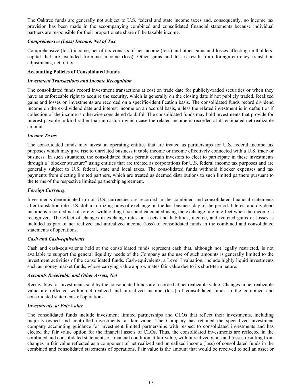 The Oaktree funds are generally not subject to U.S. federal and state income taxes and, consequently, no income tax provision has been made in the accompanying combined and consolidated financial statements because individual partners are responsible for their proportionate share of the taxable income. Comprehensive (Loss) Income, Net of Tax Comprehensive (loss) income, net of tax consists of net income (loss) and other gains and losses affecting unitholders’ capital that are excluded from net income (loss). Other gains and losses result from foreign-currency translation adjustments, net of tax. Accounting Policies of Consolidated Funds Investment Transactions and Income Recognition The consolidated funds record investment transactions at cost on trade date for publicly-traded securities or when they have an enforceable right to acquire the security, which is generally on the closing date if not publicly traded. Realized gains and losses on investments are recorded on a specific-identification basis. The consolidated funds record dividend income on the ex-dividend date and interest income on an accrual basis, unless the related investment is in default or if collection of the income is otherwise considered doubtful. The consolidated funds may hold investments that provide for interest payable in-kind rather than in cash, in which case the related income is recorded at its estimated net realizable amount. Income Taxes The consolidated funds may invest in operating entities that are treated as partnerships for U.S. federal income tax purposes which may give rise to unrelated business taxable income or income effectively connected with a U.S. trade or business. In such situations, the consolidated funds permit certain investors to elect to participate in these investments through a “blocker structure” using entities that are treated as corporations for U.S. federal income tax purposes and are generally subject to U.S. federal, state and local taxes. The consolidated funds withhold blocker expenses and tax payments from electing limited partners, which are treated as deemed distributions to such limited partners pursuant to the terms of the respective limited partnership agreement. Foreign Currency Investments denominated in non-U.S. currencies are recorded in the combined and consolidated financial statements after translation into U.S. dollars utilizing rates of exchange on the last business day of the period. Interest and dividend income is recorded net of foreign withholding taxes and calculated using the exchange rate in effect when the income is recognized. The effect of changes in exchange rates on assets and liabilities, income, and realized gains or losses is included as part of net realized and unrealized income (loss) of consolidated funds in the combined and consolidated statements of operations. Cash and Cash-equivalents Cash and cash-equivalents held at the consolidated funds represent cash that, although not legally restricted, is not available to support the general liquidity needs of the Company as the use of such amounts is generally limited to the investment activities of the consolidated funds. Cash-equivalents, a Level I valuation, include highly liquid investments such as money market funds, whose carrying value approximates fair value due to its short-term nature. Accounts Receivable and Other Assets, Net Receivables for investments sold by the consolidated funds are recorded at net realizable value. Changes in net realizable value are reflected within net realized and unrealized income (loss) of consolidated funds in the combined and consolidated statements of operations. Investments, at Fair Value The consolidated funds include investment limited partnerships and CLOs that reflect their investments, including majority-owned and controlled investments, at fair value. The Company has retained the specialized investment company accounting guidance for investment limited partnerships with respect to consolidated investments and has elected the fair value option for the financial assets of CLOs. Thus, the consolidated investments are reflected in the combined and consolidated statements of financial condition at fair value, with unrealized gains and losses resulting from changes in fair value reflected as a component of net realized and unrealized income (loss) of consolidated funds in the combined and consolidated statements of operations. Fair value is the amount that would be received to sell an asset or 19