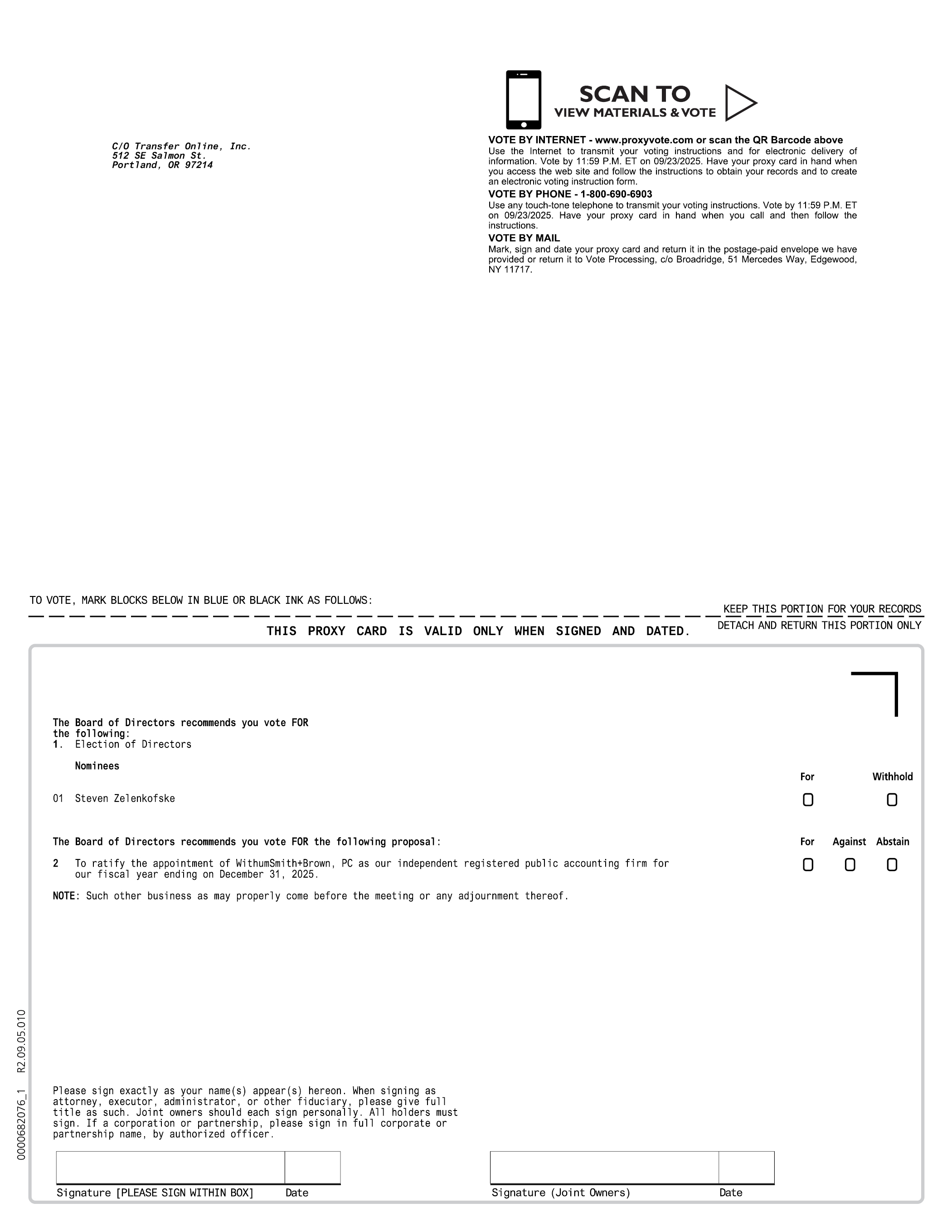 C/O Transfer Online, Inc. 512 SE Salmon St. Portland, OR 97214 SCAN TO VIEW MATERIALS & VOTE VOTE BY INTERNET - www.proxyvote.com or scan the QR Barcode above Use the Internet to transmit your voting instructions and for electronic delivery of information. Vote by 11:59 P.M. ET on 09/23/2025. Have your proxy card in hand when you access the web site and follow the instructions to obtain your records and to create an electronic voting instruction form. VOTE BY PHONE - 1-800-690-6903 Use any touch-tone telephone to transmit your voting instructions. Vote by 11:59 P.M. ET on 09/23/2025. Have your proxy card in hand when you call and then follow the instructions. VOTE BY MAIL Mark, sign and date your proxy card and return it in the postage-paid envelope we have provided or return it to Vote Processing, c/o Broadridge, 51 Mercedes Way, Edgewood, NY 11717. TO VOTE, MARK BLOCKS BELOW IN BLUE OR BLACK INK AS FOLLOWS: KEEP THIS PORTION FOR YOUR RECORDS DETACH AND RETURN THIS PORTION ONLY THIS PROXY CARD IS VALID ONLY WHEN SIGNED AND DATED. The Board of Directors recommends you vote FOR the following: 1. Election of Directors Nominees 01 Steven Zelenkofske The Board of Directors recommends you vote FOR the following proposal: 2 To ratify the appointment of WithumSmith+Brown, PC as our independent registered public accounting firm for our fiscal year ending on December 31, 2025. NOTE: Such other business as may properly come before the meeting or any adjournment thereof. For Withhold For Against Abstain Please sign exactly as your name(s) appear(s) hereon. When signing as attorney, executor, administrator, or other fiduciary, please give full title as such. Joint owners should each sign personally. All holders must sign. If a corporation or partnership, please sign in full corporate or partnership name, by authorized officer. Signature [PLEASE SIGN WITHIN BOX] Date Signature (Joint Owners) Date 0000682076_1 R2.09.05.010
