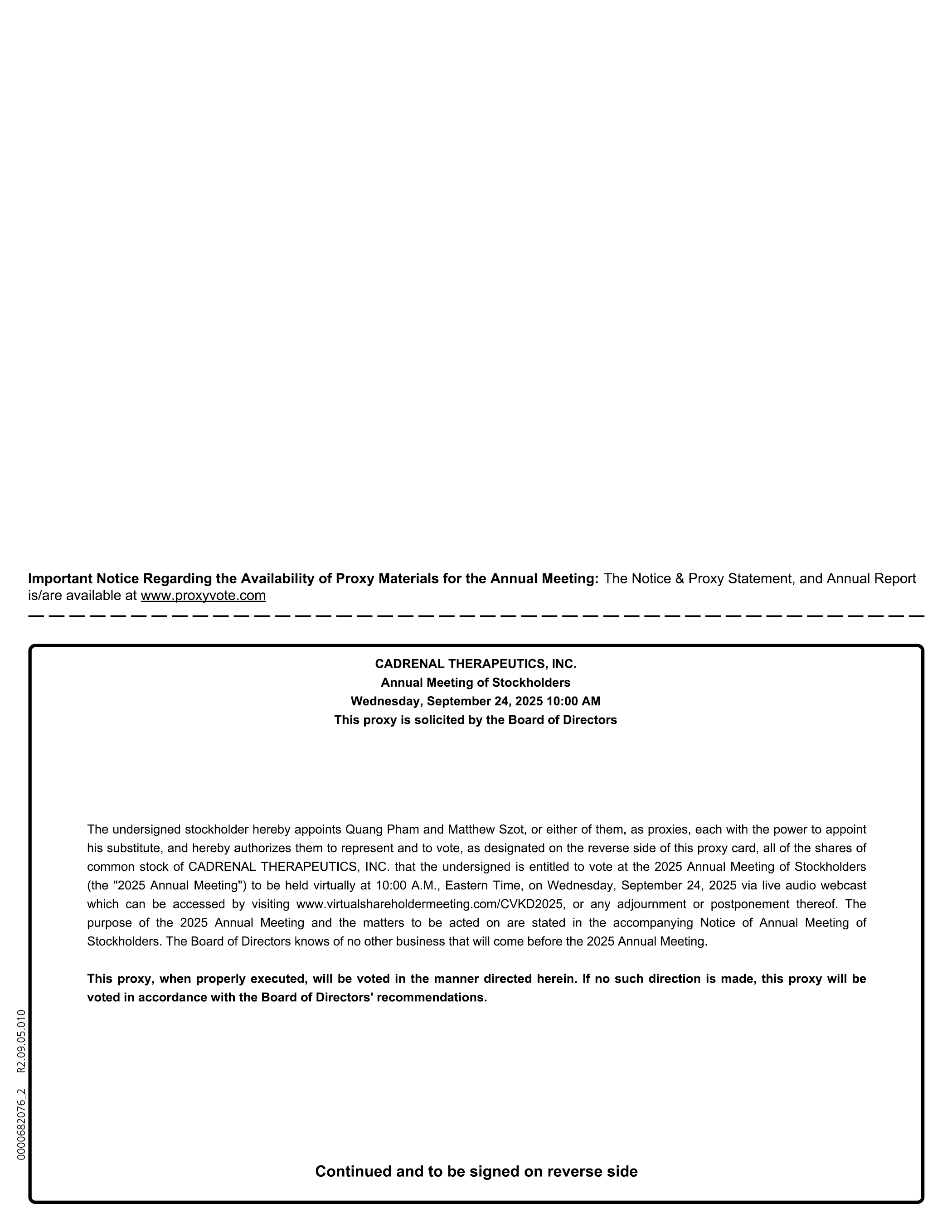 Important Notice Regarding the Availability of Proxy Materials for the Annual Meeting: The Notice & Proxy Statement, and Annual Report is/are available at www.proxyvote.com CADRENAL THERAPEUTICS, INC. Annual Meeting of Stockholders Wednesday, September 24, 2025 10:00 AM This proxy is solicited by the Board of Directors The undersigned stockholder hereby appoints Quang Pham and Matthew Szot, or either of them, as proxies, each with the power to appoint his substitute, and hereby authorizes them to represent and to vote, as designated on the reverse side of this proxy card, all of the shares of common stock of CADRENAL THERAPEUTICS, INC. that the undersigned is entitled to vote at the 2025 Annual Meeting of Stockholders (the “2025 Annual Meeting”) to be held virtually at 10:00 A.M., Eastern Time, on Wednesday, September 24, 2025 via live audio webcast which can be accessed by visiting www.virtualshareholdermeeting.com/CVKD2025, or any adjournment or postponement thereof. The purpose of the 2025 Annual Meeting and the matters to be acted on are stated in the accompanying Notice of Annual Meeting of Stockholders. The Board of Directors knows of no other business that will come before the 2025 Annual Meeting. This proxy, when properly executed, will be voted in the manner directed herein. If no such direction is made, this proxy will be voted in accordance with the Board of Directors’ recommendations. Continued and to be signed on reverse side 0000682076_2 R2.09.05.010