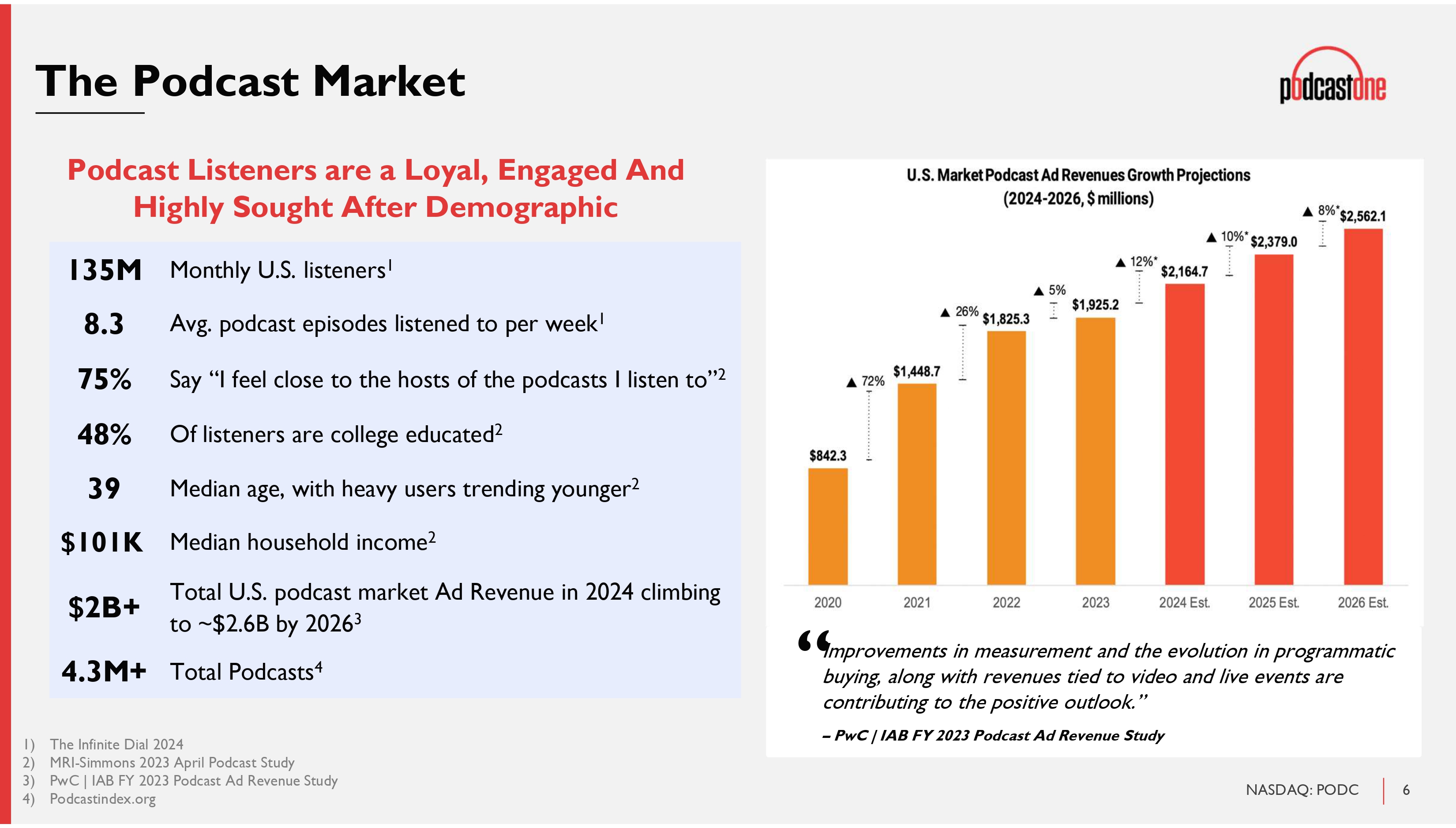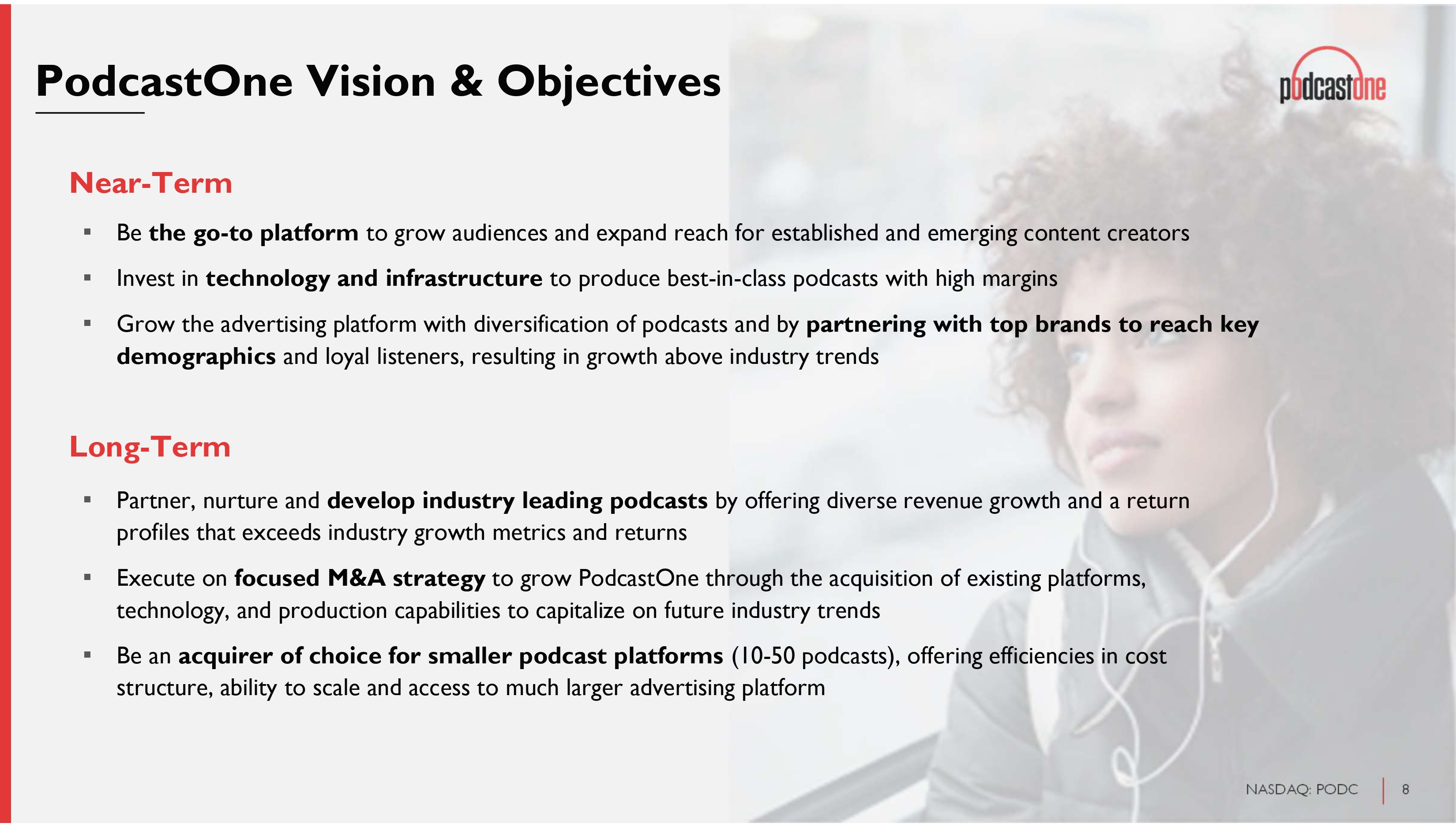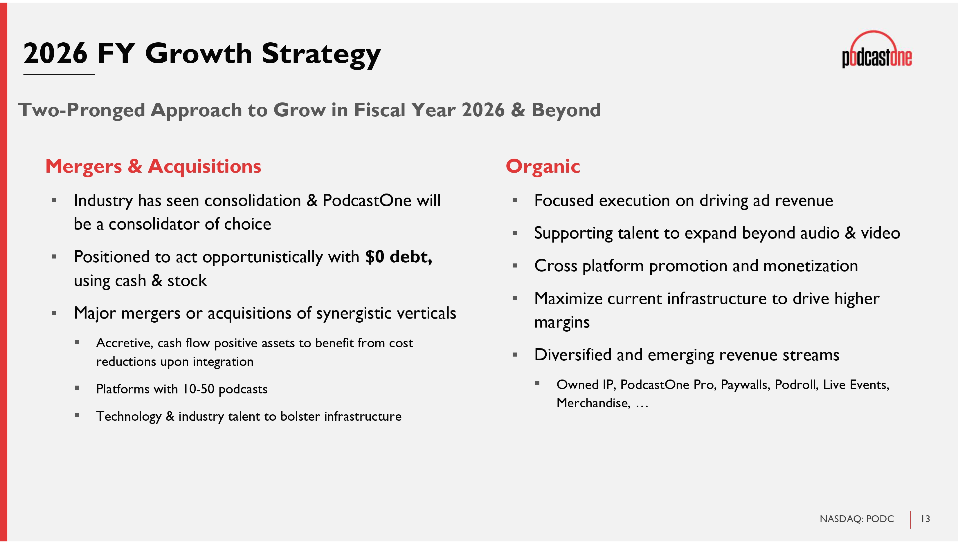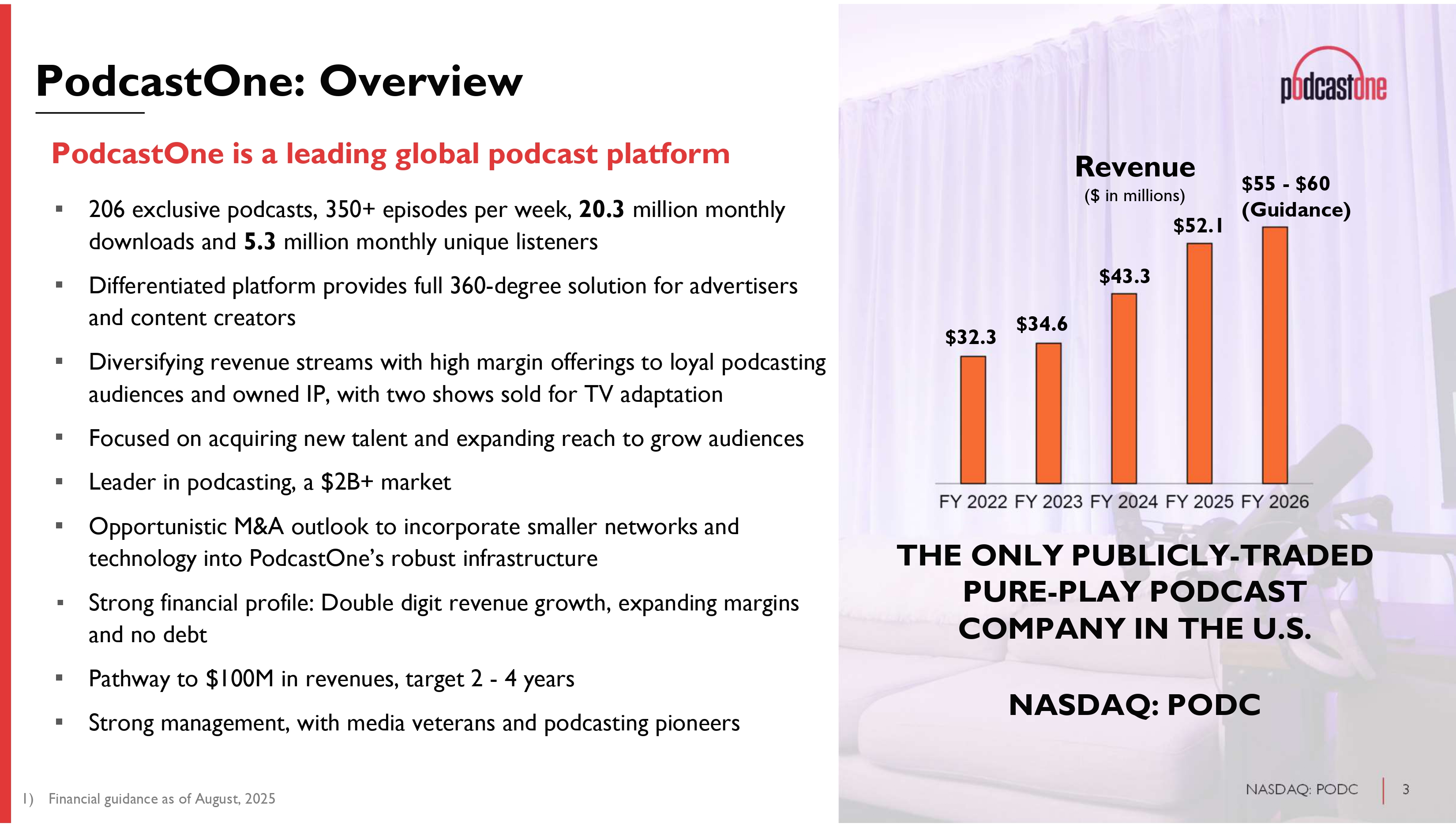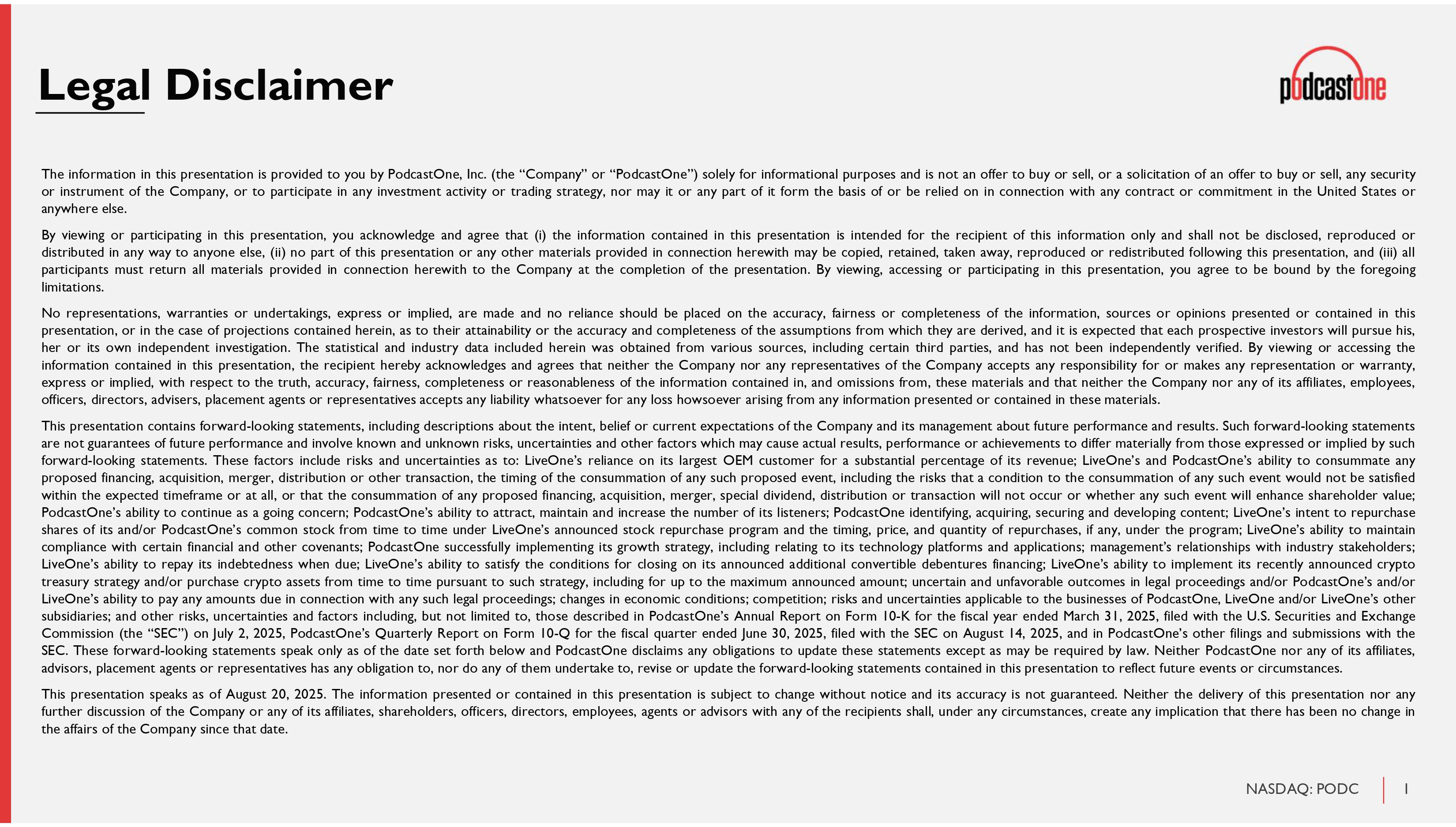 1 NASDAQ: PODC Legal Disclaimer The information in this presentation is provided to you by PodcastOne, Inc . (the “Company” or “PodcastOne”) solely for informational purposes and is not an offer to buy or sell, or a solicitation of an offer to buy or sell, any security or instrument of the Company, or to participate in any investment activity or trading strategy, nor may it or any part of it form the basis of or be relied on in connection with any contract or commitment in the United States or anywhere else . By viewing or participating in this presentation, you acknowledge and agree that (i) the information contained in this presentation is intended for the recipient of this information only and shall not be disclosed, reproduced or distributed in any way to anyone else, (ii) no part of this presentation or any other materials provided in connection herewith may be copied, retained, taken away, reproduced or redistributed following this presentation, and (iii) all participants must return all materials provided in connection herewith to the Company at the completion of the presentation . By viewing, accessing or participating in this presentation, you agree to be bound by the foregoing limitations . No representations, warranties or undertakings, express or implied, are made and no reliance should be placed on the accuracy, fairness or completeness of the information, sources or opinions presented or contained in this presentation, or in the case of projections contained herein, as to their attainability or the accuracy and completeness of the assumptions from which they are derived, and it is expected that each prospective investors will pursue his, her or its own independent investigation . The statistical and industry data included herein was obtained from various sources, including certain third parties, and has not been independently verified . By viewing or accessing the information contained in this presentation, the recipient hereby acknowledges and agrees that neither the Company nor any representatives of the Company accepts any responsibility for or makes any representation or warranty, express or implied, with respect to the truth, accuracy, fairness, completeness or reasonableness of the information contained in, and omissions from, these materials and that neither the Company nor any of its affiliates, employees, officers, directors, advisers, placement agents or representatives accepts any liability whatsoever for any loss howsoever arising from any information presented or contained in these materials . This presentation contains forward - looking statements, including descriptions about the intent, belief or current expectations of the Company and its management about future performance and results . Such forward - looking statements are not guarantees of future performance and involve known and unknown risks, uncertainties and other factors which may cause actual results, performance or achievements to differ materially from those expressed or implied by such forward - looking statements . These factors include risks and uncertainties as to : LiveOne’s reliance on its largest OEM customer for a substantial percentage of its revenue ; LiveOne’s and PodcastOne’s ability to consummate any proposed financing, acquisition, merger, distribution or other transaction, the timing of the consummation of any such proposed event, including the risks that a condition to the consummation of any such event would not be satisfied within the expected timeframe or at all, or that the consummation of any proposed financing, acquisition, merger, special dividend, distribution or transaction will not occur or whether any such event will enhance shareholder value ; PodcastOne’s ability to continue as a going concern ; PodcastOne’s ability to attract, maintain and increase the number of its listeners ; PodcastOne identifying, acquiring, securing and developing content ; LiveOne’s intent to repurchase shares of its and/or PodcastOne’s common stock from time to time under LiveOne’s announced stock repurchase program and the timing, price, and quantity of repurchases, if any, under the program ; LiveOne’s ability to maintain compliance with certain financial and other covenants ; PodcastOne successfully implementing its growth strategy, including relating to its technology platforms and applications ; management’s relationships with industry stakeholders ; LiveOne’s ability to repay its indebtedness when due ; LiveOne’s ability to satisfy the conditions for closing on its announced additional convertible debentures financing ; LiveOne’s ability to implement its recently announced crypto treasury strategy and/or purchase crypto assets from time to time pursuant to such strategy, including for up to the maximum announced amount ; uncertain and unfavorable outcomes in legal proceedings and/or PodcastOne’s and/or LiveOne’s ability to pay any amounts due in connection with any such legal proceedings ; changes in economic conditions ; competition ; risks and uncertainties applicable to the businesses of PodcastOne, LiveOne and/or LiveOne’s other subsidiaries ; and other risks, uncertainties and factors including, but not limited to, those described in PodcastOne’s Annual Report on Form 10 - K for the fiscal year ended March 31 , 2025 , filed with the U . S . Securities and Exchange Commission (the “SEC”) on July 2 , 2025 , PodcastOne’s Quarterly Report on Form 10 - Q for the fiscal quarter ended June 30 , 2025 , filed with the SEC on August 14 , 2025 , and in PodcastOne’s other filings and submissions with the SEC . These forward - looking statements speak only as of the date set forth below and PodcastOne disclaims any obligations to update these statements except as may be required by law . Neither PodcastOne nor any of its affiliates, advisors, placement agents or representatives has any obligation to, nor do any of them undertake to, revise or upd