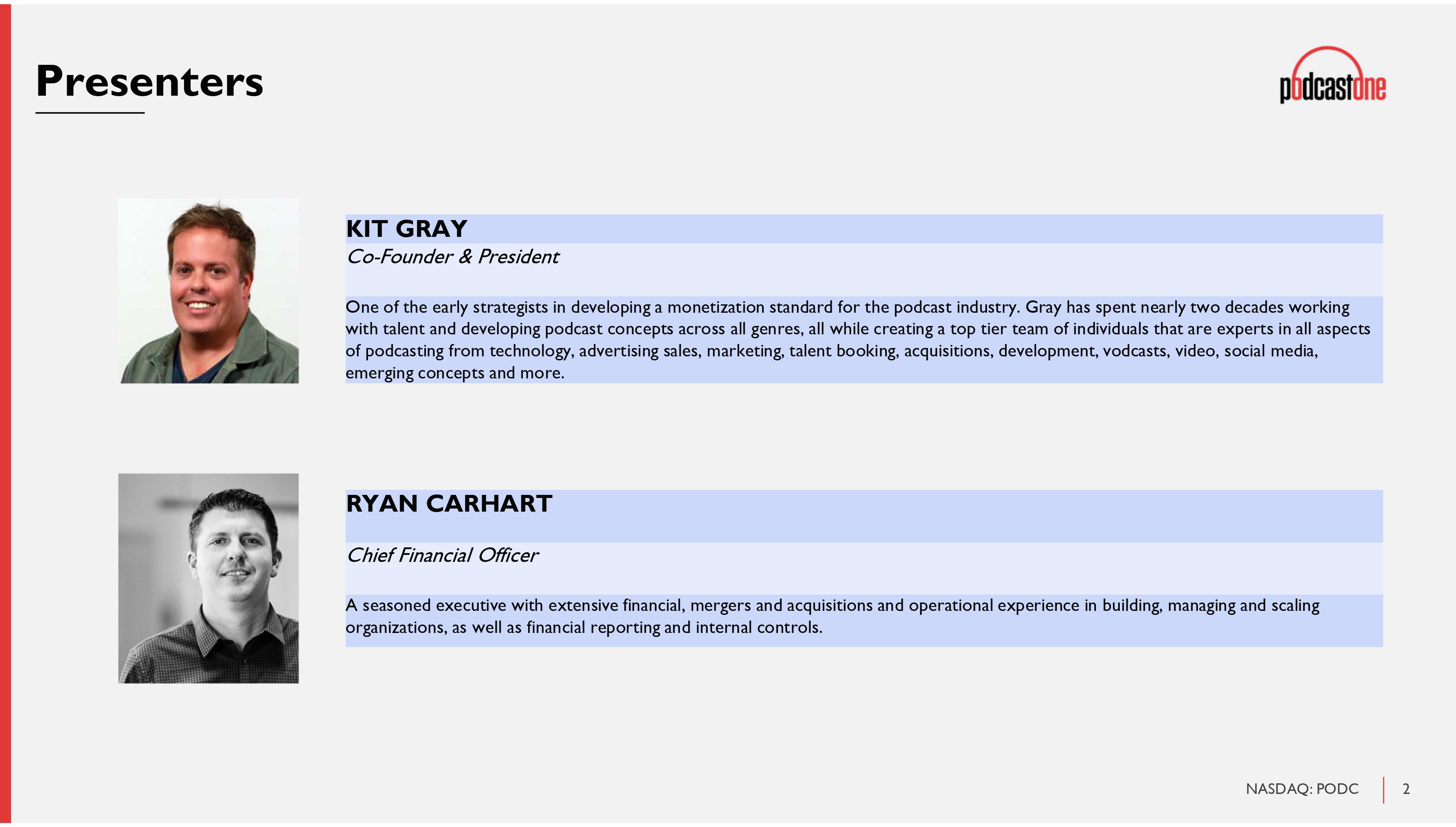 2 NASDAQ: PODC Presenters RYAN CARHART Chief Financial Officer A seasoned executive with extensive financial, mergers and acquisitions and operational experience in building, managing and sca ling organizations, as well as financial reporting and internal controls. KIT GRAY Co - Founder & President One of the early strategists in developing a monetization standard for the podcast industry. Gray has spent nearly two decade s w orking with talent and developing podcast concepts across all genres, all while creating a top tier team of individuals that are exp ert s in all aspects of podcasting from technology, advertising sales, marketing, talent booking, acquisitions, development, vodcasts, video, soci al media, emerging concepts and more.