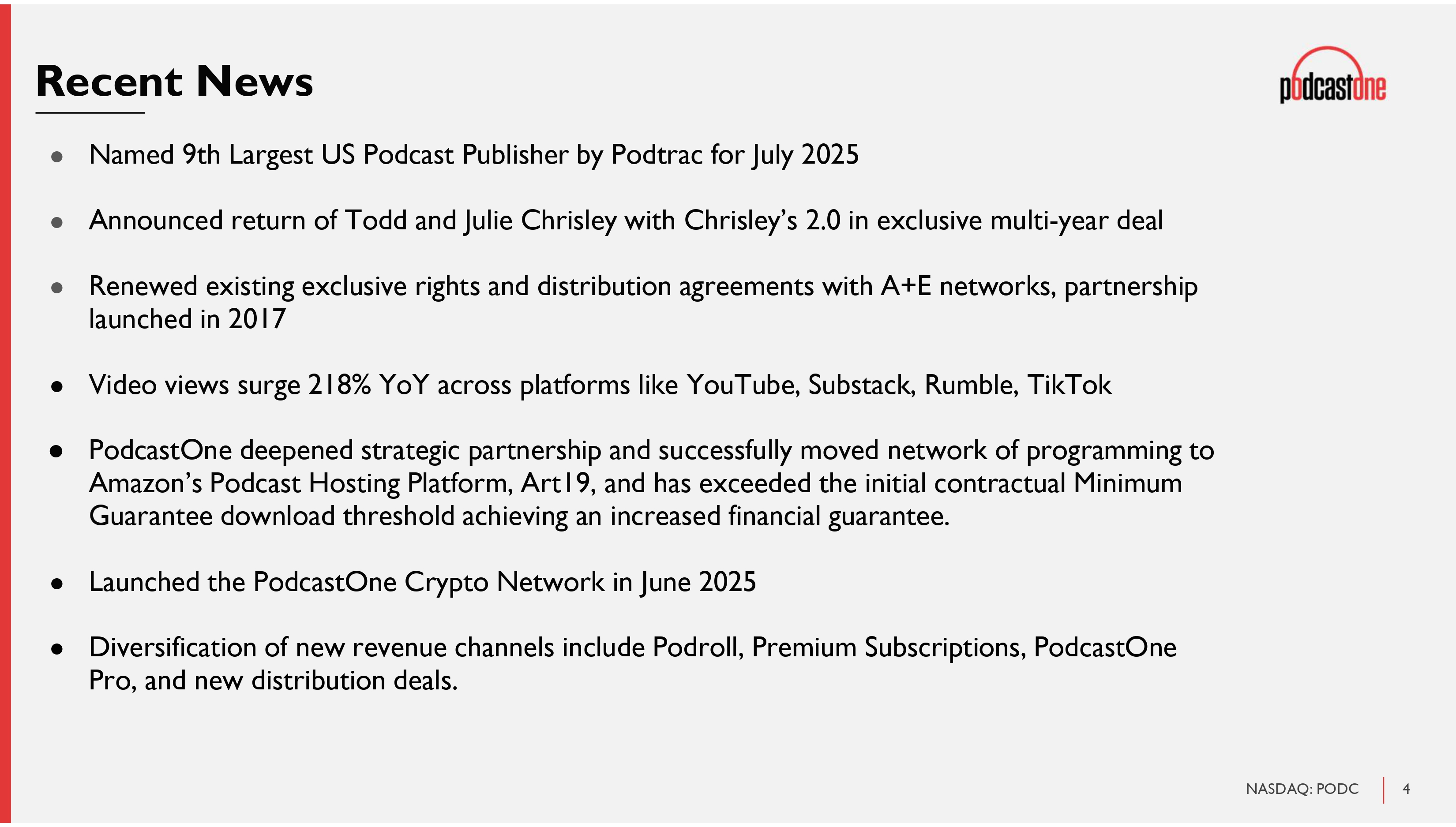 3 NASDAQ: PODC PodcastOne: Overview ▪ 206 exclusive podcas ts, 350+ episodes per week, 20.3 million monthly downloads and 5.3 million monthly unique listeners ▪ Differentiated platform provides full 360 - degree soluti on for advertisers and content creators ▪ Diversifying revenue streams with high margin offerings to loyal podcasting audiences and owned IP, with two shows sold for TV adaptation ▪ Focused on acquiring new talent and expanding reach to grow audiences ▪ Leader in podcasting, a $2B+ market ▪ Opportunistic M&A outlook to incorporate smaller networks and technology into PodcastOne’s robust infrastructure ▪ Strong financial profile: Double digit revenue growth, expanding margins and no debt ▪ Pathway to $100M in revenues, target 2 - 4 years ▪ Strong management, with media veterans and podcasting pioneers THE ONLY PUBLICLY - TRADED PURE - PLAY PODCAST COMPANY IN THE U.S. NASDAQ: PODC Revenue ($ in millions) $32.3 $34.6 $43.3 $52.1 PodcastOne is a leading global podcast platform 1) Financial guidance as of August, 2025 $55 - $60 (Guidance)