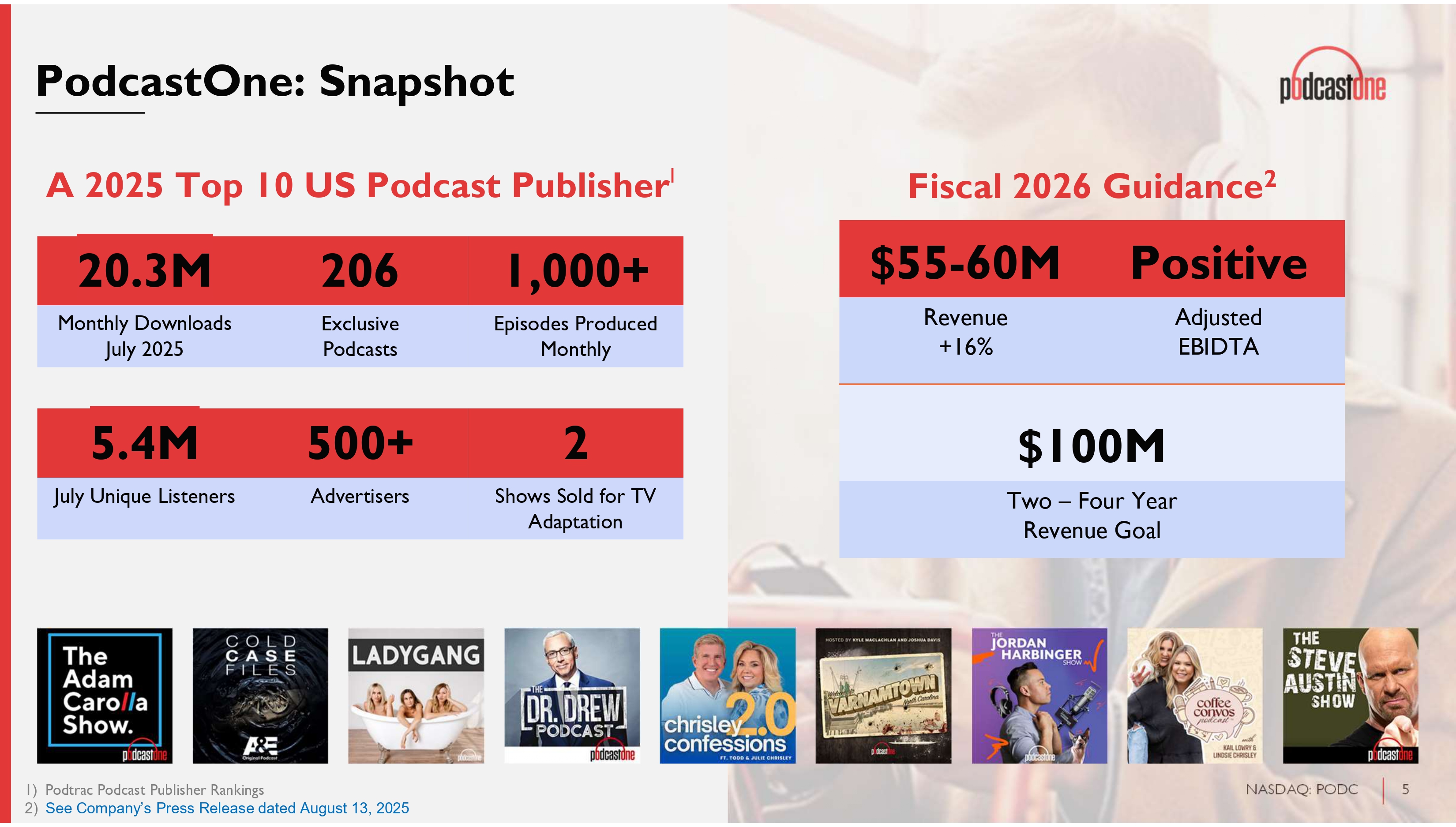 4 NASDAQ: PODC Recent News ● Named 9th Largest US Podcast Publisher by Podtrac for July 2025 ● Announced return of Todd and Julie Chrisley with Chrisley’s 2.0 in exclusive multi - year deal ● Renewed existing exclusive rights and distribution agreements with A+E networks, partnership launched in 2017 ● Video views surge 218% YoY across platforms like YouTube, Substack, Rumble, TikTok ● PodcastOne deepened strategic partnership and successfully moved network of programming to Amazon’s Podcast Hosting Platform, Art19, and has exceeded the initial contractual Minimum Guarantee download threshold achieving an increased financial guarantee. ● Launched the PodcastOne Crypto Network in June 2025 ● Diversification of new revenue channels include Podroll, Premium Subscriptions, PodcastOne Pro, and new distribution deals.