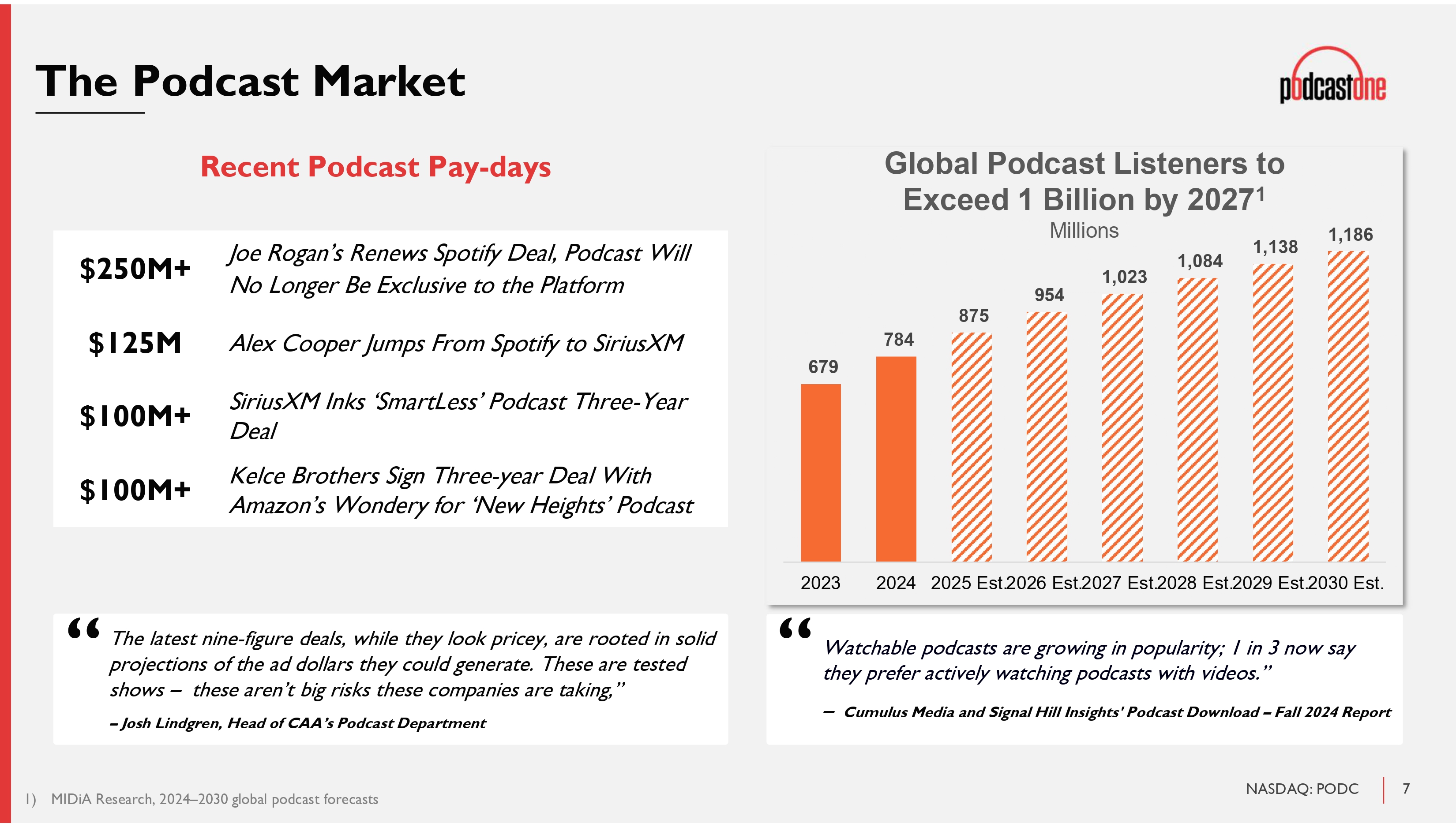 7 NASDAQ: PODC 1) MIDiA Research, 2024 – 2030 global podcast forecasts The Podcast Market The latest nine - figure deals, while they look pricey, are rooted in solid projections of the ad dollars they could generate. These are tested shows – these aren’t big risks these companies are taking,” – Josh Lindgren, Head of CAA’s Podcast Department “ Joe Rogan’s Renews Spotify Deal, Podcast Will No Longer Be Exclusive to the Platform $250M+ Alex Cooper Jumps From Spotify to SiriusXM $125M SiriusXM Inks ‘SmartLess’ Podcast Three - Year Deal $100M+ Kelce Brothers Sign Three - year Deal With Amazon’s Wondery for ‘New Heights’ Podcast $100M+ Recent Podcast Pay - days Watchable podcasts are growing in popularity; 1 in 3 now say they prefer actively watching podcasts with videos.” – Cumulus Media and Signal Hill Insights' Podcast Download – Fall 2024 Report “ 679 784 875 954 1,023 1,084 1,138 1,186 2023 2024 2025 Est. 2026 Est. 2027 Est. 2028 Est. 2029 Est. 2030 Est. Global Podcast Listeners to Exceed 1 Billion by 2027 1 Millions