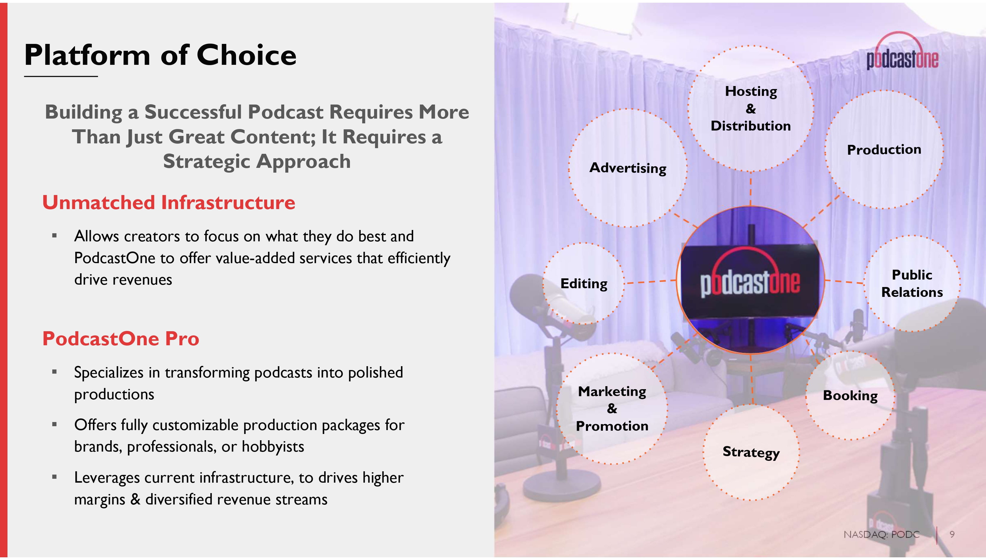 8 NASDAQ: PODC PodcastOne Vision & Objectives Near - Term ▪ Be the go - to platform to grow audiences and expand reach for established and emerging content creators ▪ Invest in technology and infrastructure to produce best - in - class podcasts with high margins ▪ Grow the advertising platform with diversification of podcasts and by partnering with top brands to reach key demographics and loyal listeners, resulting in growth above industry trends Long - Term ▪ Partner, nurture and develop industry leading podcasts by offering diverse revenue growth and a return profiles that exceeds industry growth metrics and returns ▪ Execute on focused M&A strategy to grow PodcastOne through the acquisition of existing platforms, technology, and production capabilities to capitalize on future industry trends ▪ Be an acquirer of choice for smaller podcast platforms (10 - 50 podcasts), offering efficiencies in cost structure, ability to scale and access to much larger advertising platform