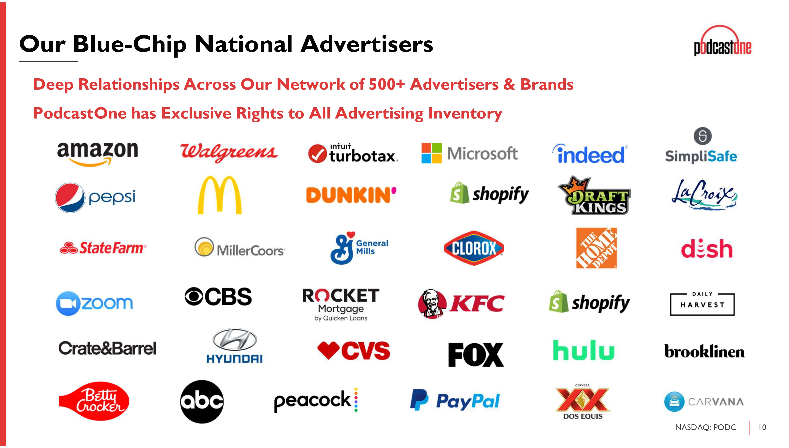 10 NASDAQ: PODC Our Blue - Chip National Advertisers Deep Relationships Across Our Network of 500+ Advertisers & Brands PodcastOne has Exclusive Rights to All Advertising Inventory
