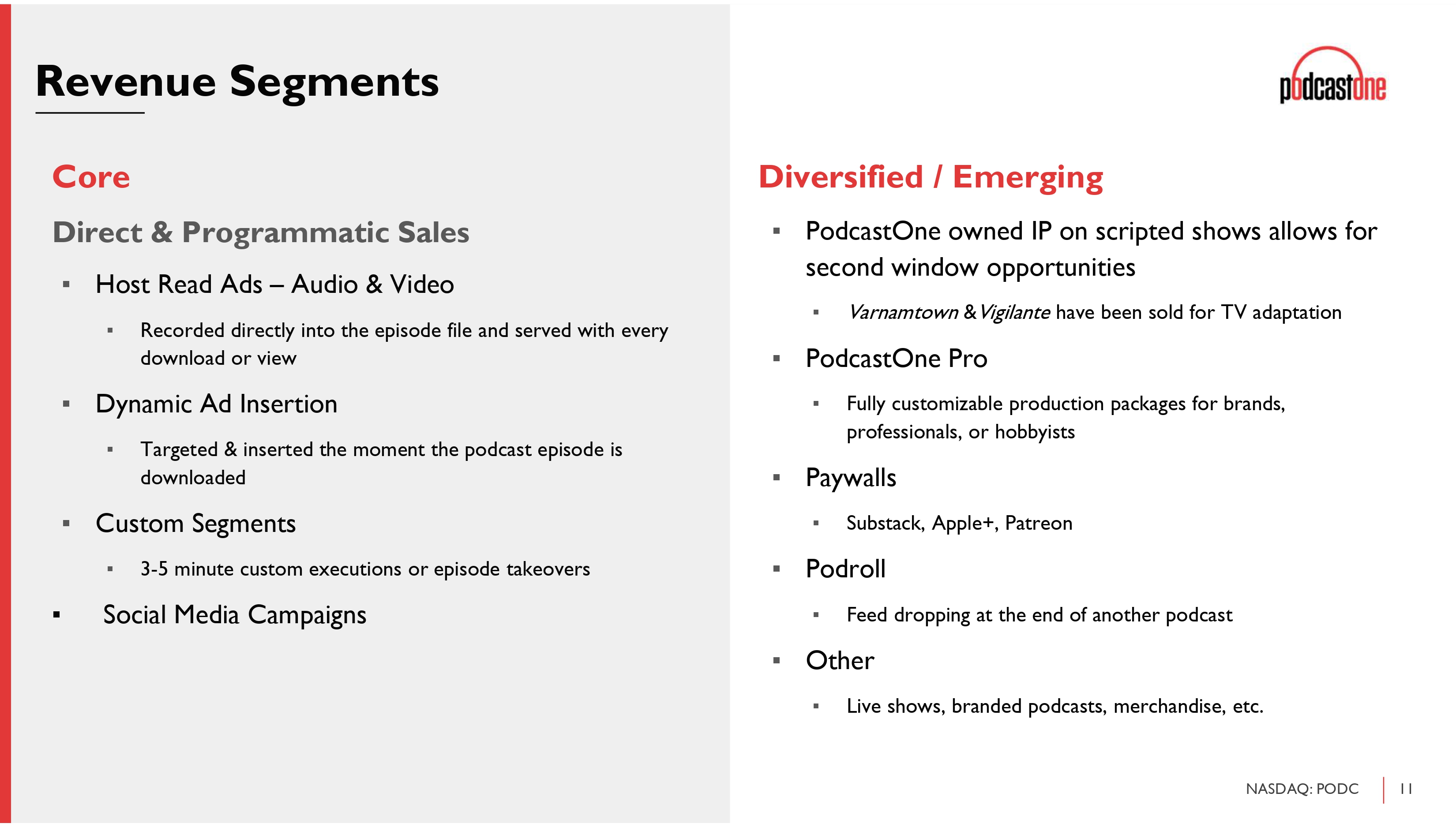 11 NASDAQ: PODC Revenue Segments Core Direct & Programmatic Sales ▪ Host Read Ads – Audio & Video ▪ Recorded directly into the episode file and served with every download or view ▪ Dynamic Ad Insertion ▪ Targeted & inserted the moment the podcast episode is downloaded ▪ Custom Segments ▪ 3 - 5 minute custom executions or episode takeovers ▪ Social Media Campaigns Diversified / Emerging ▪ PodcastOne owned IP on scripted shows allows for second window opportunities ▪ Varnamtown & Vigilante have been sold for TV adaptation ▪ PodcastOne Pro ▪ Fully customizable production packages for brands, professionals, or hobbyists ▪ Paywalls ▪ Substack, Apple+, Patreon ▪ Podroll ▪ Feed dropping at the end of another podcast ▪ Other ▪ Live shows, branded podcasts, merchandise, etc.