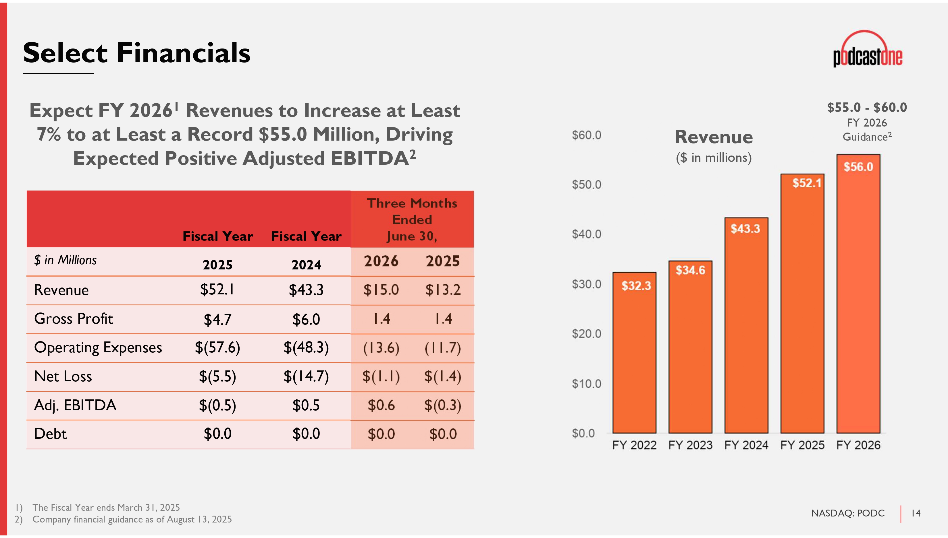 13 NASDAQ: PODC 2026 FY Growth Strategy Organic ▪ Focused execution on driving ad revenue ▪ Supporting talent to expand beyond audio & video ▪ Cross platform promotion and monetization ▪ Maximize current infrastructure to drive higher margins ▪ Diversified and emerging revenue streams ▪ Owned IP, PodcastOne Pro, Paywalls, Podroll, Live Events, Merchandise, … Mergers & Acquisitions ▪ Industry has seen consolidation & PodcastOne will be a consolidator of choice ▪ Positioned to act opportunistically with $0 debt, using cash & stock ▪ Major mergers or acquisitions of synergistic verticals ▪ Accretive, cash flow positive assets to benefit from cost reductions upon integration ▪ Platforms with 10 - 50 podcasts ▪ Technology & industry talent to bolster infrastructure Two - Pronged Approach to Grow in Fiscal Year 2026 & Beyond