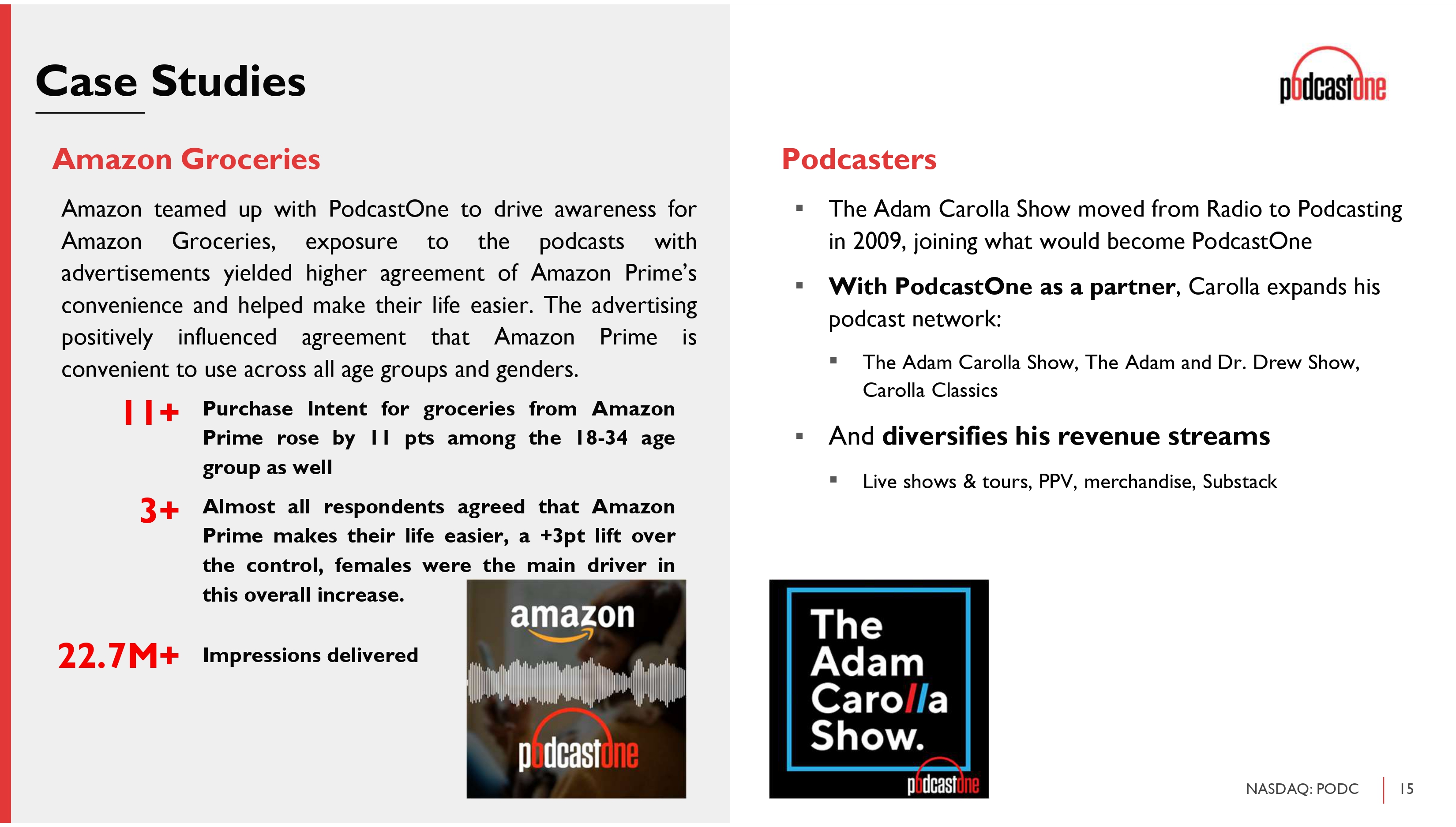 15 NASDAQ: PODC Case Studies Amazon Groceries Amazon teamed up with PodcastOne to drive awareness for Amazon Groceries, exposure to the podcasts with advertisements yielded higher agreement of Amazon Prime’s convenience and helped make their life easier . The advertising positively influenced agreement that Amazon Prime is convenient to use across all age groups and genders . Purchase Intent for groceries from Amazon Prime rose by 11 pts among the 18 - 34 age group as well 11+ Almost all respondents agreed that Amazon Prime makes their life easier, a + 3 pt lift over the control, females were the main driver in this overall increase . 3+ Impressions delivered 22.7M+ Podcasters ▪ The Adam Carolla Show moved from Radio to Podcasting in 2009, joining what would become PodcastOne ▪ With PodcastOne as a partner , Carolla expands his podcast network: ▪ The Adam Carolla Show, The Adam and Dr. Drew Show, Carolla Classics ▪ And diversifies his revenue streams ▪ Live shows & tours, PPV, merchandise, Substack