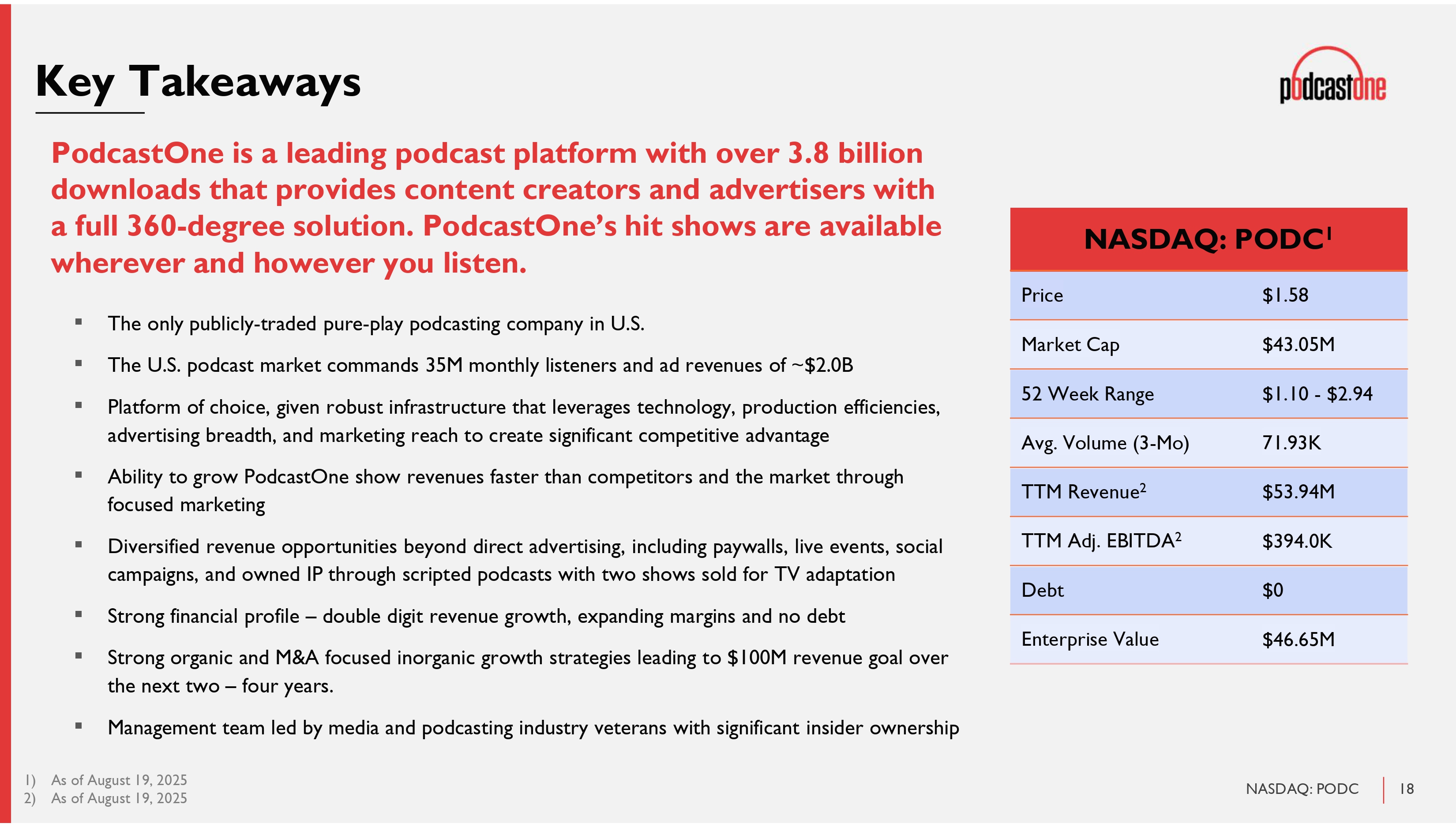 18 NASDAQ: PODC PodcastOne is a leading podcast platform with over 3.8 billion downloads that provides content creators and advertisers with a full 360 - degree solution. PodcastOne’s hit shows are available wherever and however you listen. Key Takeaways ▪ The only publicly - traded pure - play podcasting company in U.S. ▪ The U.S. podcast market commands 35M monthly listeners and ad revenues of ~$2.0B ▪ Platform of choice, given robust infrastructure that leverages technology, production efficiencies, advertising breadth, and marketing reach to create significant competitive advantage ▪ Ability to grow PodcastOne show revenues faster than competitors and the market through focused marketing ▪ Diversified revenue opportunities beyond direct advertising, including paywalls, live events, social campaigns, and owned IP through scripted podcasts with two shows sold for TV adaptation ▪ Strong financial profile – double digit revenue growth, expanding margins and no debt ▪ Strong organic and M&A focused inorganic growth strategies leading to $100M revenue goal over the next two – four years. ▪ Management team led by media and podcasting industry veterans with significant insider ownership NASDAQ: PODC 1 $1.58 Price $43.05M Market Cap $1.10 - $2.94 52 Week Range 71.93K Avg. Volume (3 - Mo) $53.94M TTM Revenue 2 $394.0K TTM Adj. EBITDA 2 $0 Debt $46.65M Enterprise Value 1) As of August 19, 2025 2) As of August 19, 2025