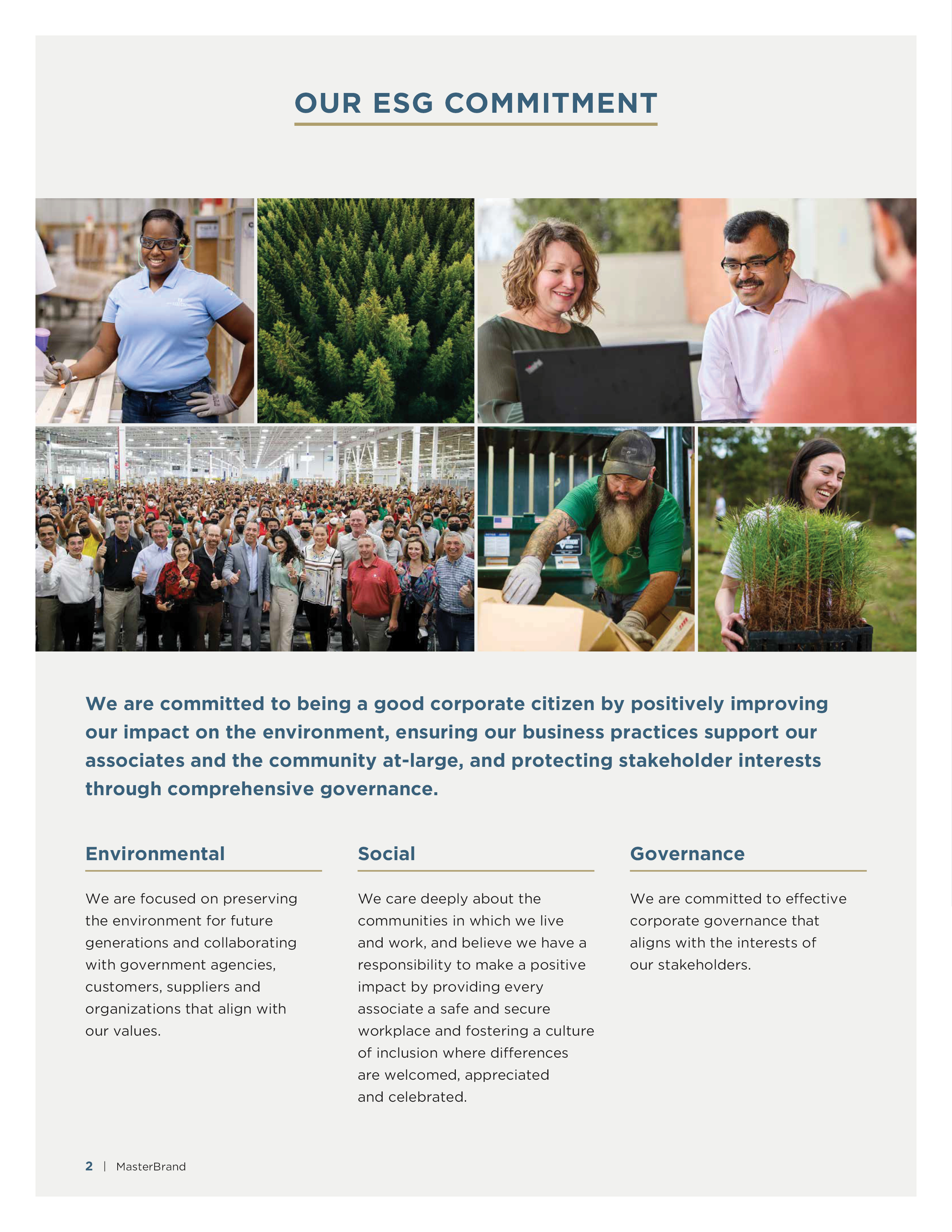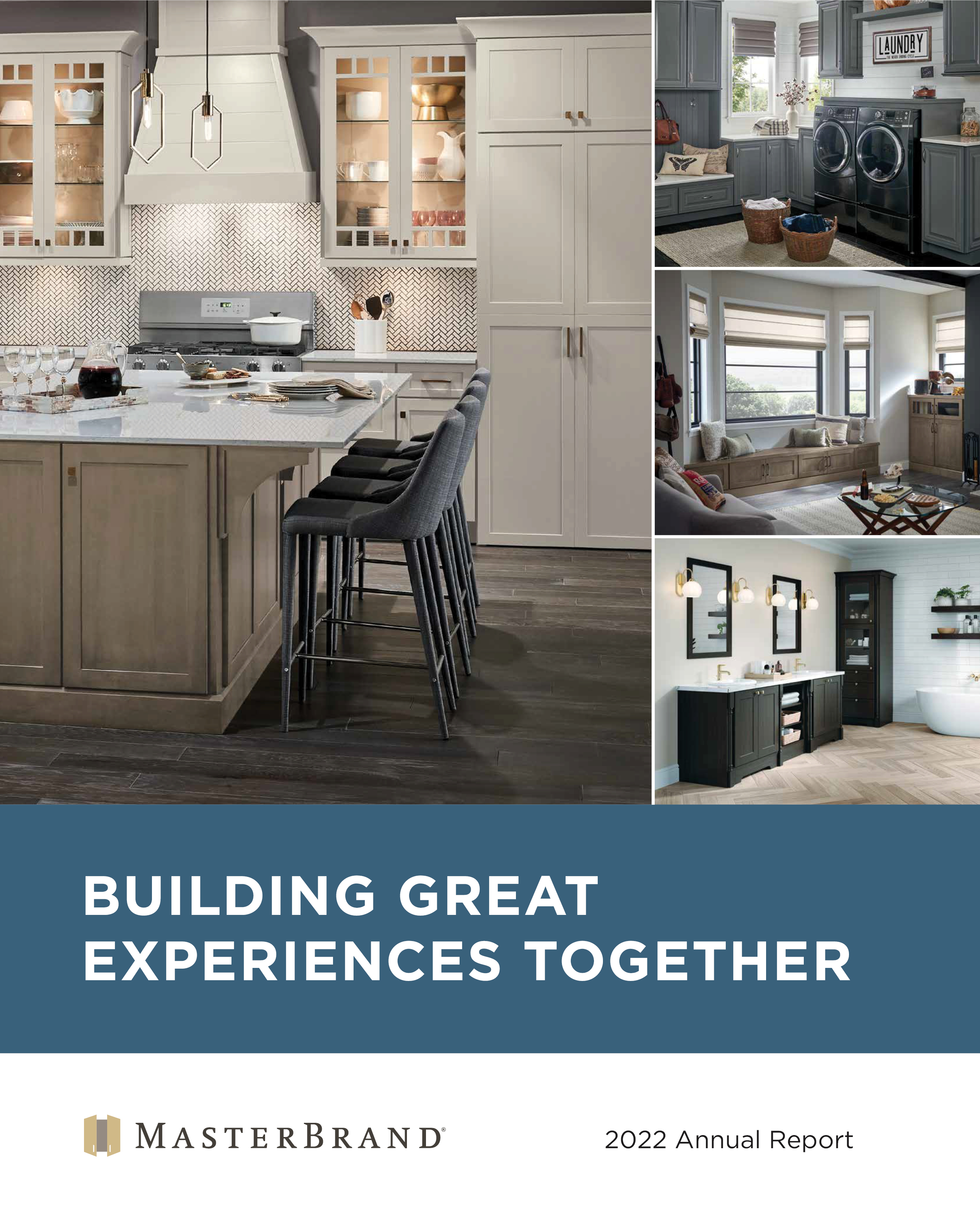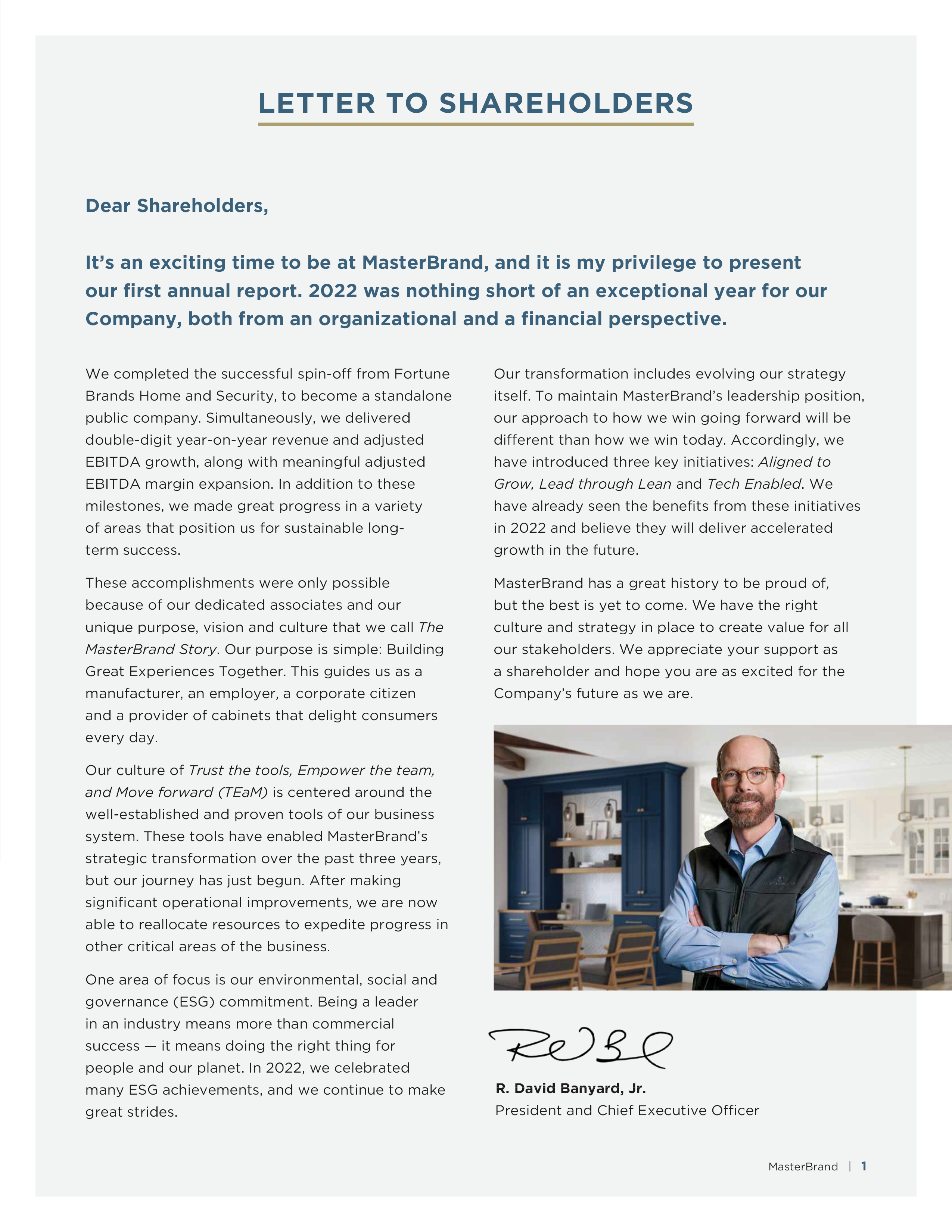 LETTER TO SHAREHOLDERS Dear Shareholders, It’s an exciting time to be at MasterBrand, and it is my privilege to present our first annual report. 2022 was nothing short of an exceptional year for our Company, both from an organizational and a financial perspective. We completed the successful spin-off from Fortune Brands Home and Security, to become a standalone public company. Simultaneously, we delivered double-digit year-on-year revenue and adjusted EBITDA growth, along with meaningful adjusted EBITDA margin expansion. In addition to these milestones, we made great progress in a variety of areas that position us for sustainable longterm success. These accomplishments were only possible because of our dedicated associates and our unique purpose, vision and culture that we call The MasterBrand Story. Our purpose is simple: Building Great Experiences Together. This guides us as a manufacturer, an employer, a corporate citizen and a provider of cabinets that delight consumers every day. Our culture of Trust the tools, Empower the team, and Move forward (TEaM) is centered around the well-established and proven tools of our business system. These tools have enabled MasterBrand’s strategic transformation over the past three years, but our journey has just begun. After making significant operational improvements, we are now able to reallocate resources to expedite progress in other critical areas of the business. One area of focus is our environmental, social and governance (ESG) commitment. Being a leader in an industry means more than commercial success — it means doing the right thing for people and our planet. In 2022, we celebrated many ESG achievements, and we continue to make great strides. Our transformation includes evolving our strategy itself. To maintain MasterBrand’s leadership position, our approach to how we win going forward will be different than how we win today. Accordingly, we have introduced three key initiatives: Aligned to Grow, Lead through Lean and Tech Enabled. We have already seen the benefits from these initiatives in 2022 and believe they will deliver accelerated growth in the future. MasterBrand has a great history to be proud of, but the best is yet to come. We have the right culture and strategy in place to create value for all our stakeholders. We appreciate your support as a shareholder and hope you are as excited for the Company’s future as we are. R. David Banyard, Jr. President and Chief Executive Officer