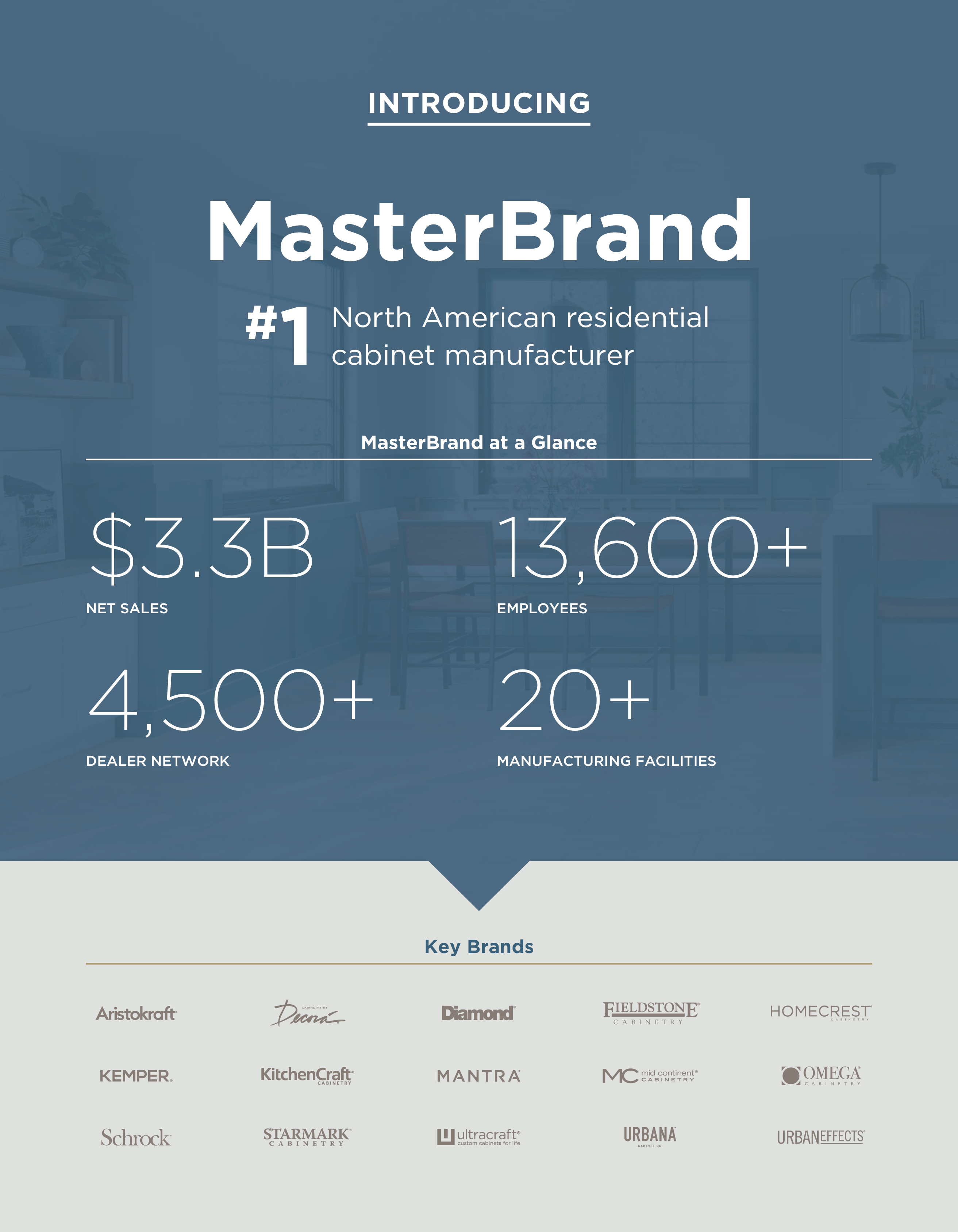INTRODUCING MasterBrand #1 North American residential cabinet manufacturer MasterBrand at a Glance $3.3B NET SALES 13,600+ EMPLOYEES 4,500+ DEALER NETWORK 20+ MANUFACTURING FACILITIES Key Brands
