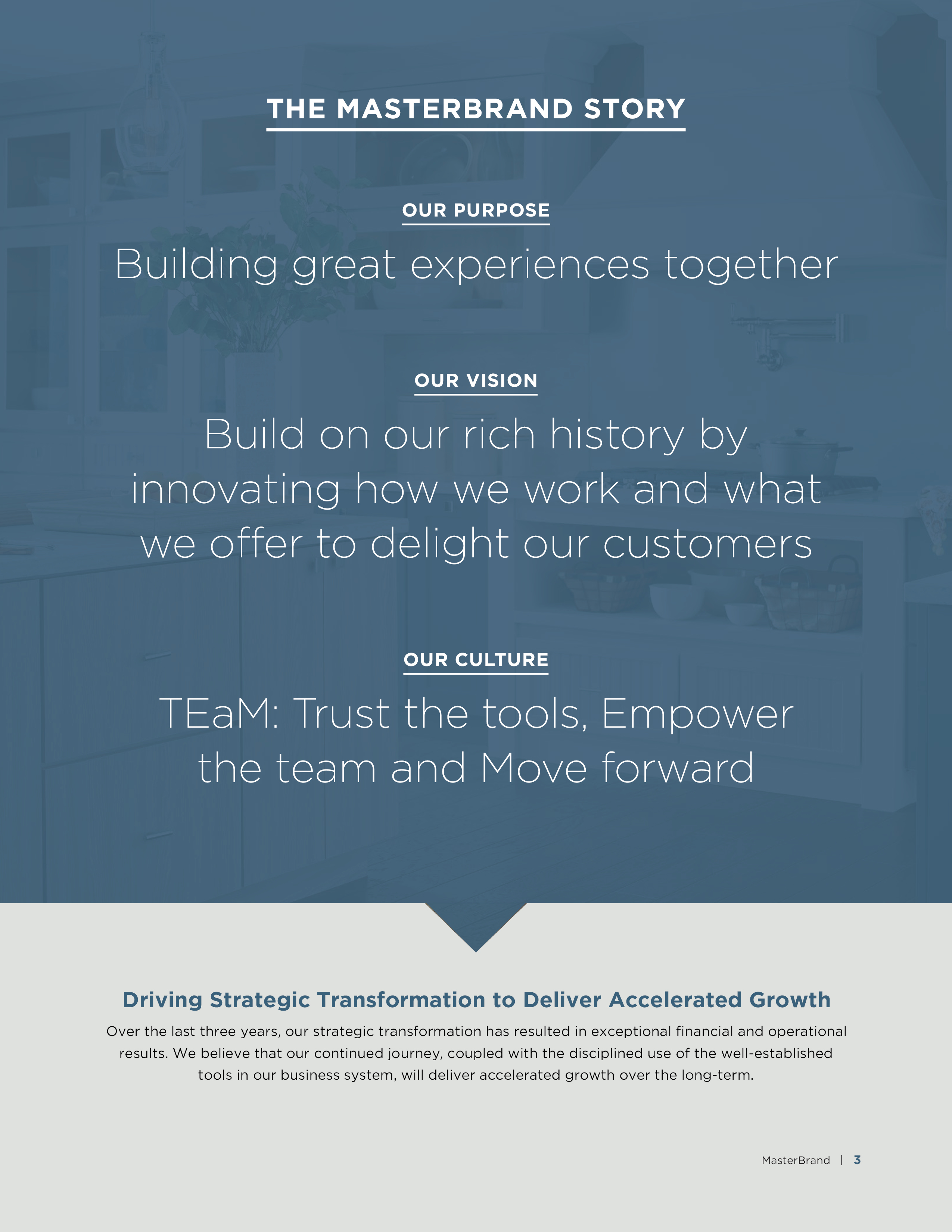THE MASTERBRAND STORY OUR PURPOSE Building great experiences together OUR VISION Build on our rich history by innovating how we work and what we offer to delight our customers OUR CULTURE TEaM: Trust the tools, Empower the team and Move forward Driving Strategic Transformation to Deliver Accelerated Growth Over the last three years, our strategic transformation has resulted in exceptional financial and operational results. We believe that our continued journey, coupled with the disciplined use of the well-established tools in our business system, will deliver accelerated growth over the long-term.