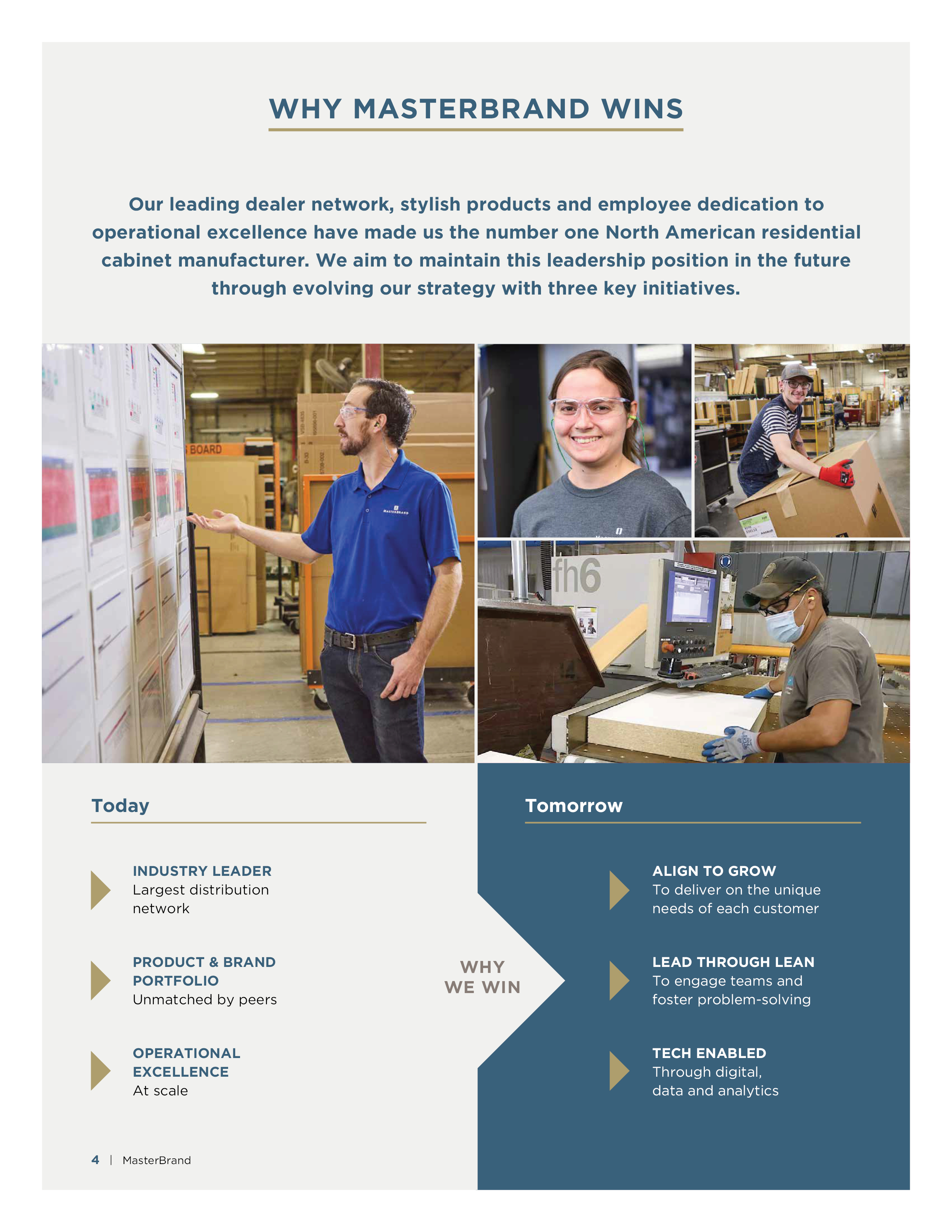 WHY MASTERBRAND WINS Our leading dealer network, stylish products and employee dedication to operational excellence have made us the number one North American residential cabinet manufacturer. We aim to maintain this leadership position in the future through evolving our strategy with three key initiatives. Today INDUSTRY LEADER Largest distribution network PRODUCT & BRAND PORTFOLIO Unmatched by peers OPERATIONAL EXCELLENCE At scale WHY WE WIN Tomorrow ALIGN TO GROW To deliver on the unique needs of each customer LEAD THROUGH LEAN To engage teams and foster problem-solving TECH ENABLED Through digital, data and analytics