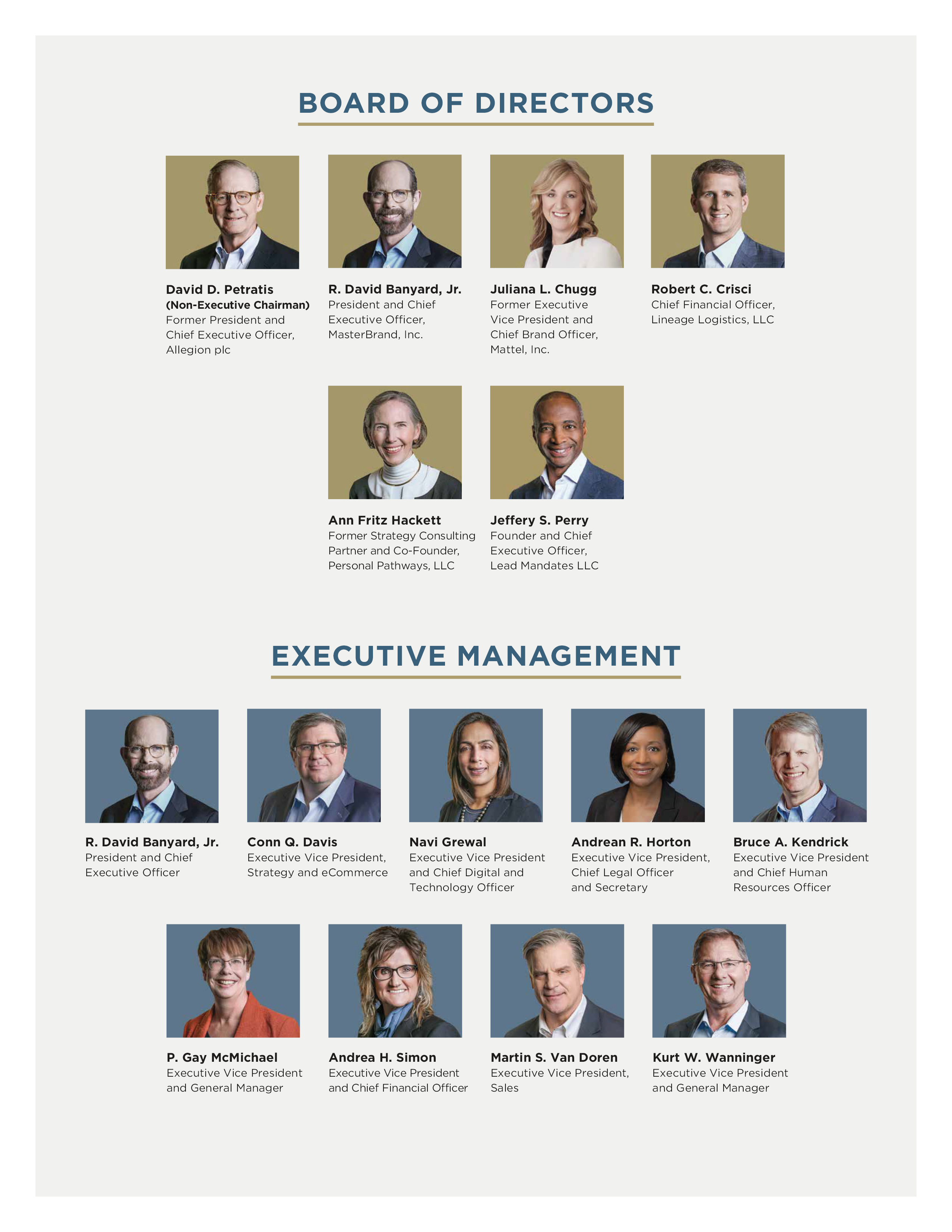 BOARD OF DIRECTORS David D. Petratis (Non-Executive Chairman) Former President and Chief Executive Officer, Allegion plc R. David Banyard, Jr. President and Chief Executive Officer, MasterBrand, Inc. Juliana L. Chugg Former Executive Vice President and Chief Brand Officer, Mattel, Inc. Robert C. Crisci Chief Financial Officer, Lineage Logistics, LLC Ann Fritz Hackett Former Strategy Consulting Partner and Co-Founder, Personal Pathways, LLC Jeffery S. Perry Founder and Chief Executive Officer, Lead Mandates LLC EXECUTIVE MANAGEMENT R. David Banyard, Jr. President and Chief Executive Officer Conn Q. Davis Executive Vice President, Strategy and eCommerce Navi Grewal Executive Vice President and Chief Digital and Technology Officer Andrean R. Horton Executive Vice President, Chief Legal Officer and Secretary Bruce A. Kendrick Executive Vice President and Chief Human Resources Officer P. Gay McMichael Executive Vice President and General Manager Andrea H. Simon Executive Vice President and Chief Financial Officer Martin S. Van Doren Executive Vice President, Sales Kurt W. Wanninger Executive Vice President and General Manager
