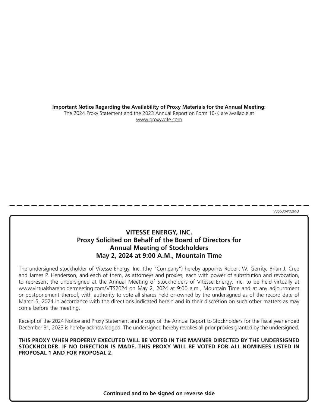 V35630-P02663 Important Notice Regarding the Availability of Proxy Materials for the Annual Meeting: The 2024 Proxy Statement and the 2023 Annual Report on Form 10-K are available at www.proxyvote.com VITESSE ENERGY, INC. Proxy Solicited on Behalf of the Board of Directors for Annual Meeting of Stockholders May 2, 2024 at 9:00 A.M., Mountain Time The undersigned stockholder of Vitesse Energy, Inc. (the "Company") hereby appoints Robert W. Gerrity, Brian J. Cree and James P. Henderson, and each of them, as attorneys and proxies, each with power of substitution and revocation, to represent the undersigned at the Annual Meeting of Stockholders of Vitesse Energy, Inc. to be held virtually at www.virtualshareholdermeeting.com/VTS2024 on May 2, 2024 at 9:00 a.m., Mountain Time and at any adjournment or postponement thereof, with authority to vote all shares held or owned by the undersigned as of the record date of March 5, 2024 in accordance with the directions indicated herein and in their discretion on such other matters as may come before the meeting. Receipt of the 2024 Notice and Proxy Statement and a copy of the Annual Report to Stockholders for the fiscal year ended December 31, 2023 is hereby acknowledged. The undersigned hereby revokes all prior proxies granted by the undersigned. THIS PROXY WHEN PROPERLY EXECUTED WILL BE VOTED IN THE MANNER DIRECTED BY THE UNDERSIGNED STOCKHOLDER. IF NO DIRECTION IS MADE, THIS PROXY WILL BE VOTED FOR ALL NOMINEES LISTED IN PROPOSAL 1 AND FOR PROPOSAL 2. Continued and to be signed on reverse side