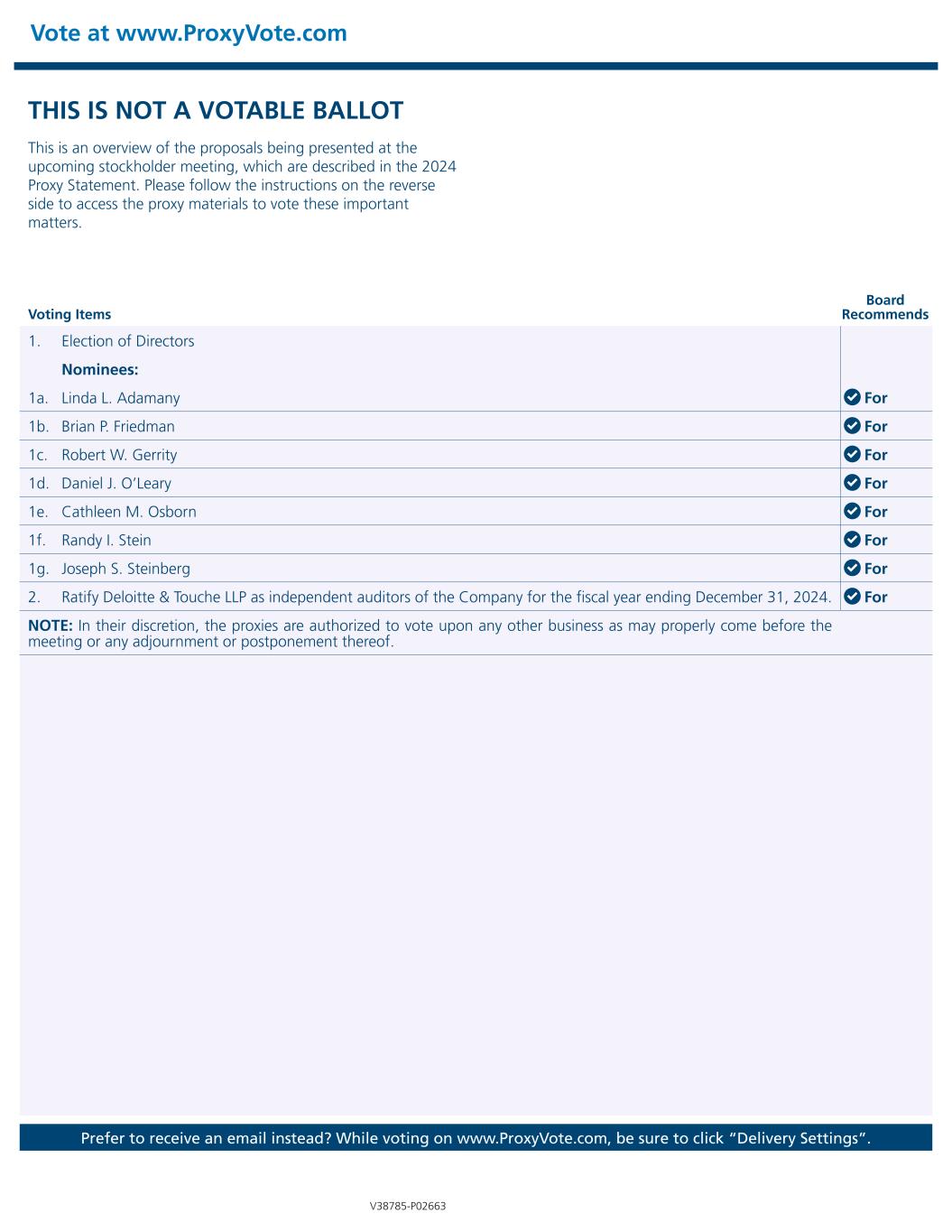 Vote at www.ProxyVote.com Prefer to receive an email instead? While voting on www.ProxyVote.com, be sure to click “Delivery Settings”. Voting Items Board Recommends V38785-P02663 THIS IS NOT A VOTABLE BALLOT This is an overview of the proposals being presented at the upcoming stockholder meeting, which are described in the 2024 Proxy Statement. Please follow the instructions on the reverse side to access the proxy materials to vote these important matters. 1. Election of Directors Nominees: 1a. Linda L. Adamany For 1b. Brian P. Friedman For 1c. Robert W. Gerrity For 1d. Daniel J. O’Leary For 1e. Cathleen M. Osborn For 1f. Randy I. Stein For 1g. Joseph S. Steinberg For 2. Ratify Deloitte & Touche LLP as independent auditors of the Company for the fiscal year ending December 31, 2024. For NOTE: In their discretion, the proxies are authorized to vote upon any other business as may properly come before the meeting or any adjournment or postponement thereof.