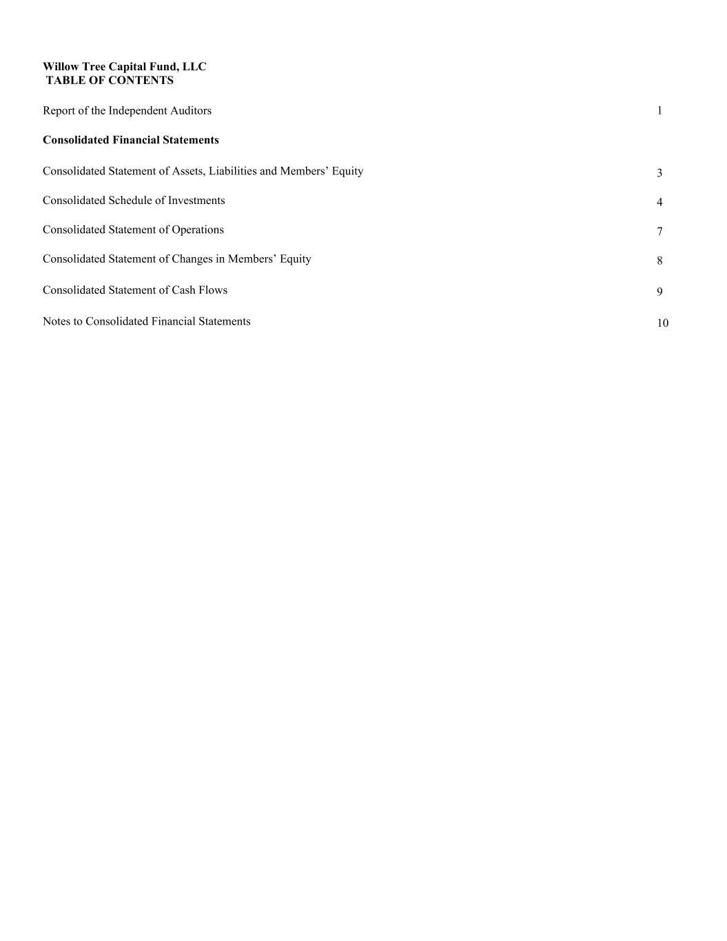 Willow Tree Capital Fund, LLC TABLE OF CONTENTS Report of the Independent Auditors Consolidated Financial Statements Consolidated Statement of Assets, Liabilities and Members’ Equity 3 Consolidated Schedule of Investments 4 Consolidated Statement of Operations 7 Consolidated Statement of Changes in Members’ Equity 8 Consolidated Statement of Cash Flows 9 Notes to Consolidated Financial Statements 10 1