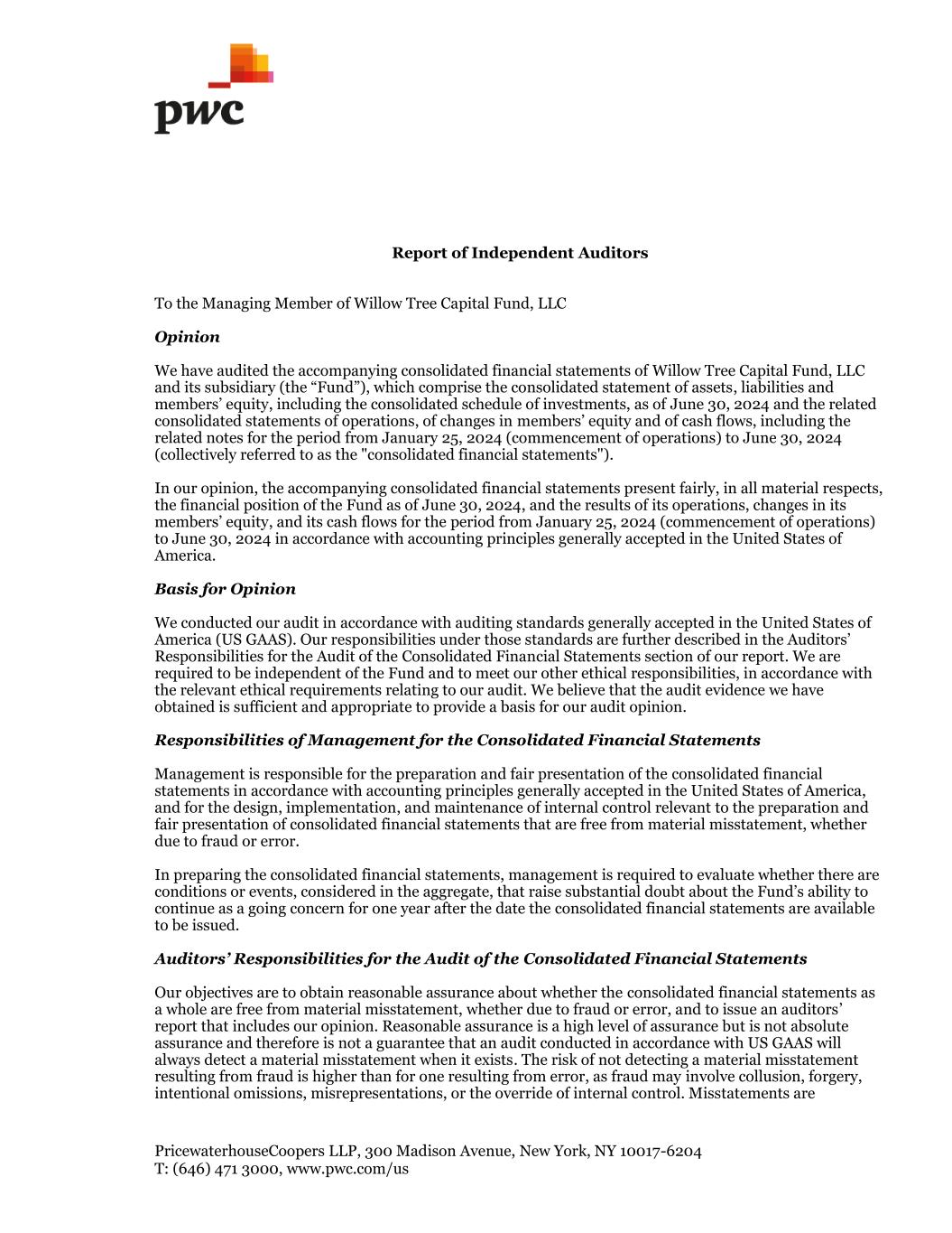 PricewaterhouseCoopers LLP, 300 Madison Avenue, New York, NY 10017-6204 T: (646) 471 3000, www.pwc.com/us Report of Independent Auditors To the Managing Member of Willow Tree Capital Fund, LLC Opinion We have audited the accompanying consolidated financial statements of Willow Tree Capital Fund, LLC and its subsidiary (the “Fund”), which comprise the consolidated statement of assets, liabilities and members’ equity, including the consolidated schedule of investments, as of June 30, 2024 and the related consolidated statements of operations, of changes in members’ equity and of cash flows, including the related notes for the period from January 25, 2024 (commencement of operations) to June 30, 2024 (collectively referred to as the "consolidated financial statements"). In our opinion, the accompanying consolidated financial statements present fairly, in all material respects, the financial position of the Fund as of June 30, 2024, and the results of its operations, changes in its members’ equity, and its cash flows for the period from January 25, 2024 (commencement of operations) to June 30, 2024 in accordance with accounting principles generally accepted in the United States of America. Basis for Opinion We conducted our audit in accordance with auditing standards generally accepted in the United States of America (US GAAS). Our responsibilities under those standards are further described in the Auditors’ Responsibilities for the Audit of the Consolidated Financial Statements section of our report. We are required to be independent of the Fund and to meet our other ethical responsibilities, in accordance with the relevant ethical requirements relating to our audit. We believe that the audit evidence we have obtained is sufficient and appropriate to provide a basis for our audit opinion. Responsibilities of Management for the Consolidated Financial Statements Management is responsible for the preparation and fair presentation of the consolidated financial statements in accordance with accounting principles generally accepted in the United States of America, and for the design, implementation, and maintenance of internal control relevant to the preparation and fair presentation of consolidated financial statements that are free from material misstatement, whether due to fraud or error. In preparing the consolidated financial statements, management is required to evaluate whether there are conditions or events, considered in the aggregate, that raise substantial doubt about the Fund’s ability to continue as a going concern for one year after the date the consolidated financial statements are available to be issued. Auditors’ Responsibilities for the Audit of the Consolidated Financial Statements Our objectives are to obtain reasonable assurance about whether the consolidated financial statements as a whole are free from material misstatement, whether due to fraud or error, and to issue an auditors’ report that includes our opinion. Reasonable assurance is a high level of assurance but is not absolute assurance and therefore is not a guarantee that an audit conducted in accordance with US GAAS will always detect a material misstatement when it exists. The risk of not detecting a material misstatement resulting from fraud is higher than for one resulting from error, as fraud may involve collusion, forgery, intentional omissions, misrepresentations, or the override of internal control. Misstatements are