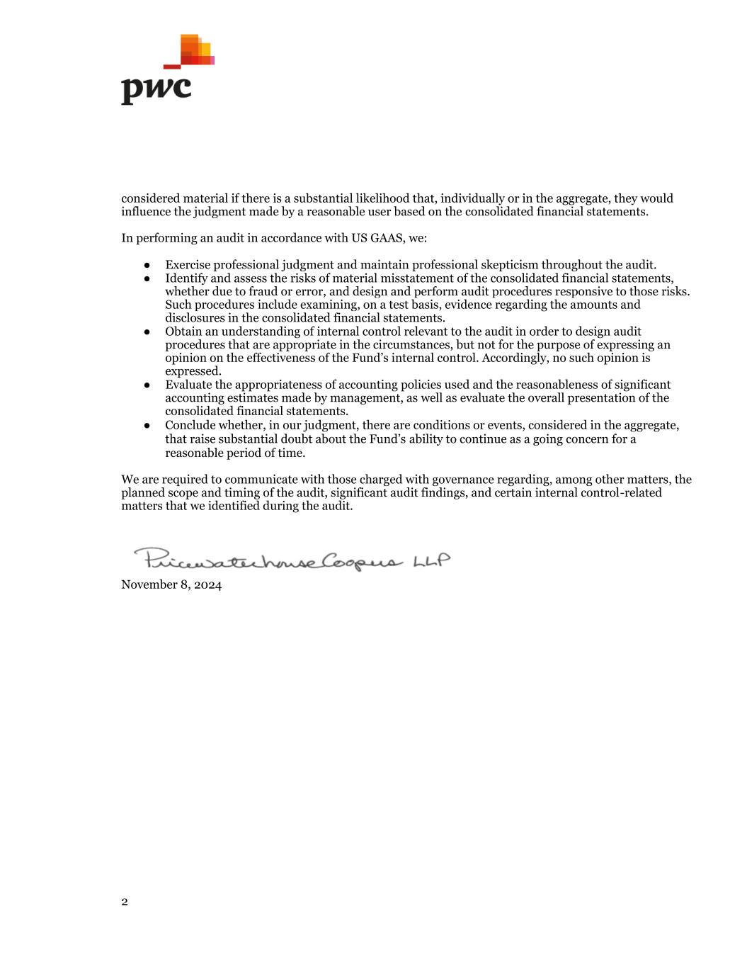 2 considered material if there is a substantial likelihood that, individually or in the aggregate, they would influence the judgment made by a reasonable user based on the consolidated financial statements. In performing an audit in accordance with US GAAS, we: ● Exercise professional judgment and maintain professional skepticism throughout the audit. ● Identify and assess the risks of material misstatement of the consolidated financial statements, whether due to fraud or error, and design and perform audit procedures responsive to those risks. Such procedures include examining, on a test basis, evidence regarding the amounts and disclosures in the consolidated financial statements. ● Obtain an understanding of internal control relevant to the audit in order to design audit procedures that are appropriate in the circumstances, but not for the purpose of expressing an opinion on the effectiveness of the Fund’s internal control. Accordingly, no such opinion is expressed. ● Evaluate the appropriateness of accounting policies used and the reasonableness of significant accounting estimates made by management, as well as evaluate the overall presentation of the consolidated financial statements. ● Conclude whether, in our judgment, there are conditions or events, considered in the aggregate, that raise substantial doubt about the Fund’s ability to continue as a going concern for a reasonable period of time. We are required to communicate with those charged with governance regarding, among other matters, the planned scope and timing of the audit, significant audit findings, and certain internal control-related matters that we identified during the audit. November 8, 2024