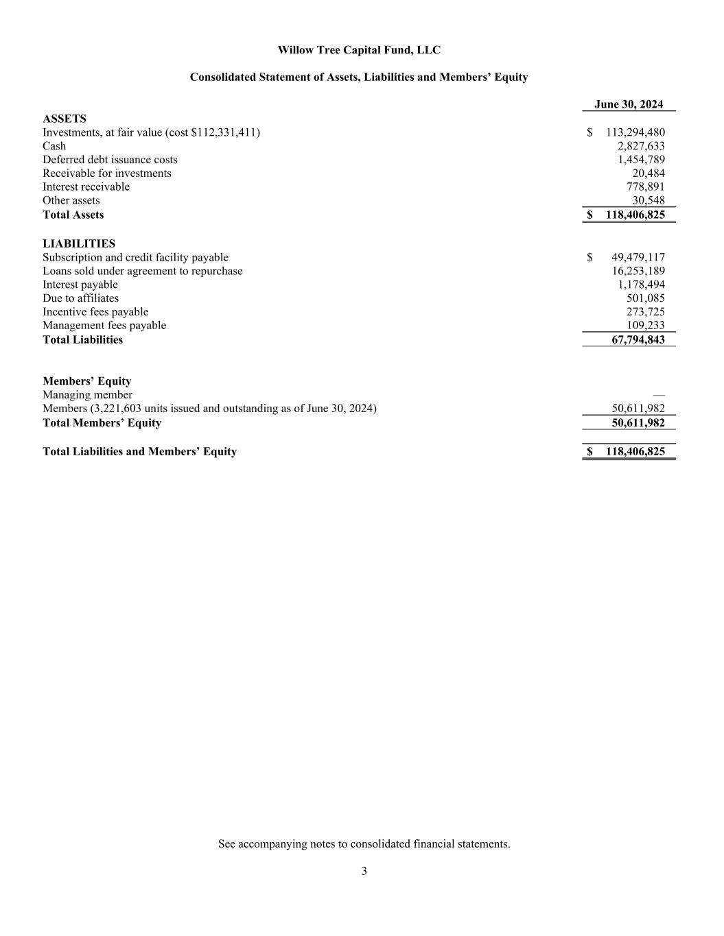 See accompanying notes to consolidated financial statements. 3 Willow Tree Capital Fund, LLC Consolidated Statement of Assets, Liabilities and Members’ Equity June 30, 2024 ASSETS Investments, at fair value (cost $112,331,411) $ 113,294,480 Cash 2,827,633 Deferred debt issuance costs 1,454,789 Receivable for investments 20,484 Interest receivable 778,891 Other assets 30,548 Total Assets $ 118,406,825 LIABILITIES Subscription and credit facility payable $ 49,479,117 Loans sold under agreement to repurchase 16,253,189 Interest payable 1,178,494 Due to affiliates 501,085 Incentive fees payable 273,725 Management fees payable 109,233 Total Liabilities 67,794,843 Members’ Equity Managing member — Members (3,221,603 units issued and outstanding as of June 30, 2024) 50,611,982 Total Members’ Equity 50,611,982 Total Liabilities and Members’ Equity $ 118,406,825