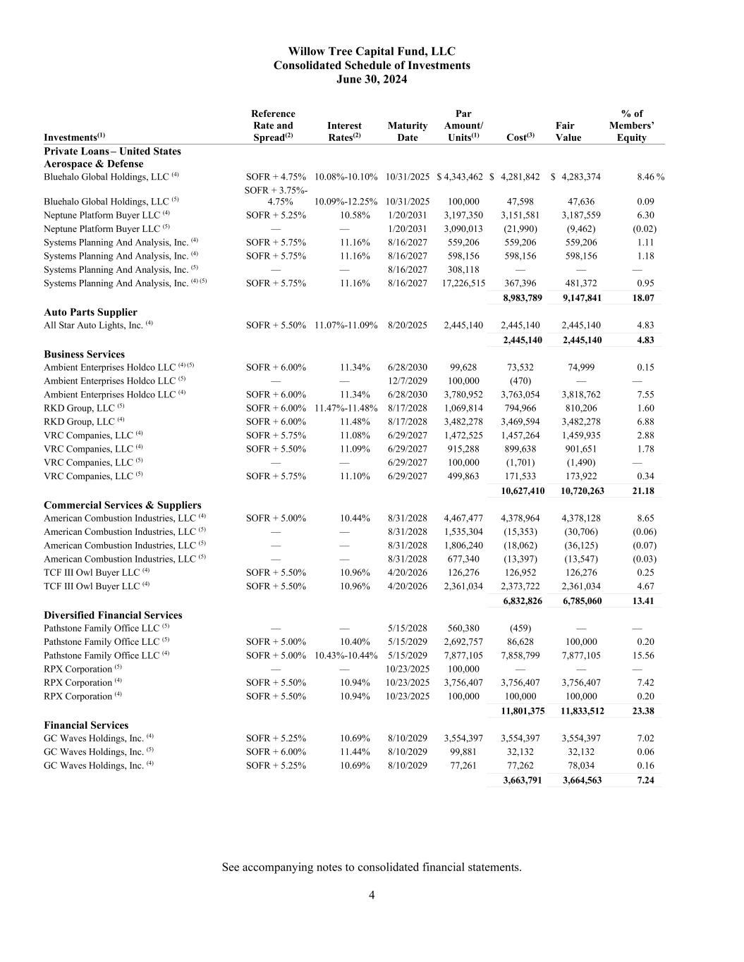 Willow Tree Capital Fund, LLC Consolidated Schedule of Investments June 30, 2024 See accompanying notes to consolidated financial statements. 4 Investments(1) Reference Rate and Spread(2) Interest Rates(2) Maturity Date Par Amount/ Units(1) Cost(3) Fair Value % of Members’ Equity Private Loans – United States Aerospace & Defense Bluehalo Global Holdings, LLC (4) SOFR + 4.75% 10.08%-10.10% 10/31/2025 $ 4,343,462 $ 4,281,842 $ 4,283,374 8.46 % Bluehalo Global Holdings, LLC (5) SOFR + 3.75%- 4.75% 10.09%-12.25% 10/31/2025 100,000 47,598 47,636 0.09 Neptune Platform Buyer LLC (4) SOFR + 5.25% 10.58% 1/20/2031 3,197,350 3,151,581 3,187,559 6.30 Neptune Platform Buyer LLC (5) — — 1/20/2031 3,090,013 (21,990) (9,462) (0.02) Systems Planning And Analysis, Inc. (4) SOFR + 5.75% 11.16% 8/16/2027 559,206 559,206 559,206 1.11 Systems Planning And Analysis, Inc. (4) SOFR + 5.75% 11.16% 8/16/2027 598,156 598,156 598,156 1.18 Systems Planning And Analysis, Inc. (5) — — 8/16/2027 308,118 — — — Systems Planning And Analysis, Inc. (4) (5) SOFR + 5.75% 11.16% 8/16/2027 17,226,515 367,396 481,372 0.95 _____________________________________________________________________________________________ ____________________________________________________________________________________ ______________________________________________________________________________________________________ 8,983,789 9,147,841 18.07 _____________________________________________________________________________________________ ____________________________________________________________________________________ ______________________________________________________________________________________________________ Auto Parts Supplier All Star Auto Lights, Inc. (4) SOFR + 5.50% 11.07%-11.09% 8/20/2025 2,445,140 2,445,140 2,445,140 4.83 _____________________________________________________________________________________________ ____________________________________________________________________________________ ______________________________________________________________________________________________________ 2,445,140 2,445,140 4.83 _____________________________________________________________________________________________ ____________________________________________________________________________________ ______________________________________________________________________________________________________ Business Services Ambient Enterprises Holdco LLC (4) (5) SOFR + 6.00% 11.34% 6/28/2030 99,628 73,532 74,999 0.15 Ambient Enterprises Holdco LLC (5) — — 12/7/2029 100,000 (470) — — Ambient Enterprises Holdco LLC (4) SOFR + 6.00% 11.34% 6/28/2030 3,780,952 3,763,054 3,818,762 7.55 RKD Group, LLC (5) SOFR + 6.00% 11.47%-11.48% 8/17/2028 1,069,814 794,966 810,206 1.60 RKD Group, LLC (4) SOFR + 6.00% 11.48% 8/17/2028 3,482,278 3,469,594 3,482,278 6.88 VRC Companies, LLC (4) SOFR + 5.75% 11.08% 6/29/2027 1,472,525 1,457,264 1,459,935 2.88 VRC Companies, LLC (4) SOFR + 5.50% 11.09% 6/29/2027 915,288 899,638 901,651 1.78 VRC Companies, LLC (5) — — 6/29/2027 100,000 (1,701) (1,490) — VRC Companies, LLC (5) SOFR + 5.75% 11.10% 6/29/2027 499,863 171,533 173,922 0.34 _____________________________________________________________________________________________ ____________________________________________________________________________________ ______________________________________________________________________________________________________ 10,627,410 10,720,263 21.18 _____________________________________________________________________________________________ ____________________________________________________________________________________ ______________________________________________________________________________________________________ Commercial Services & Suppliers American Combustion Industries, LLC (4) SOFR + 5.00% 10.44% 8/31/2028 4,467,477 4,378,964 4,378,128 8.65 American Combustion Industries, LLC (5) — — 8/31/2028 1,535,304 (15,353) (30,706) (0.06) American Combustion Industries, LLC (5) — — 8/31/2028 1,806,240 (18,062) (36,125) (0.07) American Combustion Industries, LLC (5) — — 8/31/2028 677,340 (13,397) (13,547) (0.03) TCF III Owl Buyer LLC (4) SOFR + 5.50% 10.96% 4/20/2026 126,276 126,952 126,276 0.25 TCF III Owl Buyer LLC (4) SOFR + 5.50% 10.96% 4/20/2026 2,361,034 2,373,722 2,361,034 4.67 _____________________________________________________________________________________________ ____________________________________________________________________________________ ______________________________________________________________________________________________________ 6,832,826 6,785,060 13.41 _____________________________________________________________________________________________ ____________________________________________________________________________________ ______________________________________________________________________________________________________ Diversified Financial Services Pathstone Family Office LLC (5) — — 5/15/2028 560,380 (459) — — Pathstone Family Office LLC (5) SOFR + 5.00% 10.40% 5/15/2029 2,692,757 86,628 100,000 0.20 Pathstone Family Office LLC (4) SOFR + 5.00% 10.43%-10.44% 5/15/2029 7,877,105 7,858,799 7,877,105 15.56 RPX Corporation (5) — — 10/23/2025 100,000 — — — RPX Corporation (4) SOFR + 5.50% 10.94% 10/23/2025 3,756,407 3,756,407 3,756,407 7.42 RPX Corporation (4) SOFR + 5.50% 10.94% 10/23/2025 100,000 100,000 100,000 0.20 _____________________________________________________________________________________________ ____________________________________________________________________________________ ______________________________________________________________________________________________________ 11,801,375 11,833,512 23.38 _____________________________________________________________________________________________ ____________________________________________________________________________________ _______________