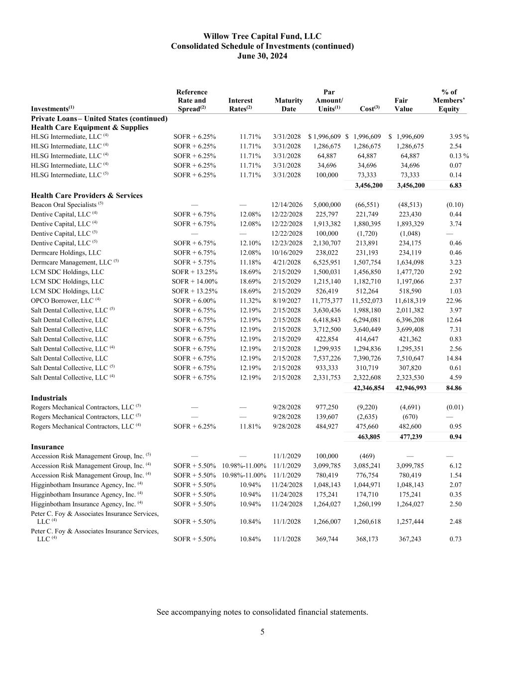 Willow Tree Capital Fund, LLC Consolidated Schedule of Investments (continued) June 30, 2024 See accompanying notes to consolidated financial statements. 5 Investments(1) Reference Rate and Spread(2) Interest Rates(2) Maturity Date Par Amount/ Units(1) Cost(3) Fair Value % of Members’ Equity Private Loans – United States (continued) Health Care Equipment & Supplies HLSG Intermediate, LLC (4) SOFR + 6.25% 11.71% 3/31/2028 $ 1,996,609 $ 1,996,609 $ 1,996,609 3.95 % HLSG Intermediate, LLC (4) SOFR + 6.25% 11.71% 3/31/2028 1,286,675 1,286,675 1,286,675 2.54 HLSG Intermediate, LLC (4) SOFR + 6.25% 11.71% 3/31/2028 64,887 64,887 64,887 0.13 % HLSG Intermediate, LLC (4) SOFR + 6.25% 11.71% 3/31/2028 34,696 34,696 34,696 0.07 HLSG Intermediate, LLC (5) SOFR + 6.25% 11.71% 3/31/2028 100,000 73,333 73,333 0.14 _____________________________________________________________________________________________ ____________________________________________________________________________________ ______________________________________________________________________________________________________ 3,456,200 3,456,200 6.83 _____________________________________________________________________________________________ ____________________________________________________________________________________ ______________________________________________________________________________________________________ Health Care Providers & Services Beacon Oral Specialists (5) — — 12/14/2026 5,000,000 (66,551) (48,513) (0.10) Dentive Capital, LLC (4) SOFR + 6.75% 12.08% 12/22/2028 225,797 221,749 223,430 0.44 Dentive Capital, LLC (4) SOFR + 6.75% 12.08% 12/22/2028 1,913,382 1,880,395 1,893,329 3.74 Dentive Capital, LLC (5) — — 12/22/2028 100,000 (1,720) (1,048) — Dentive Capital, LLC (5) SOFR + 6.75% 12.10% 12/23/2028 2,130,707 213,891 234,175 0.46 Dermcare Holdings, LLC SOFR + 6.75% 12.08% 10/16/2029 238,022 231,193 234,119 0.46 Dermcare Management, LLC (5) SOFR + 5.75% 11.18% 4/21/2028 6,525,951 1,507,754 1,634,098 3.23 LCM SDC Holdings, LLC SOFR + 13.25% 18.69% 2/15/2029 1,500,031 1,456,850 1,477,720 2.92 LCM SDC Holdings, LLC SOFR + 14.00% 18.69% 2/15/2029 1,215,140 1,182,710 1,197,066 2.37 LCM SDC Holdings, LLC SOFR + 13.25% 18.69% 2/15/2029 526,419 512,264 518,590 1.03 OPCO Borrower, LLC (4) SOFR + 6.00% 11.32% 8/19/2027 11,775,377 11,552,073 11,618,319 22.96 Salt Dental Collective, LLC (5) SOFR + 6.75% 12.19% 2/15/2028 3,630,436 1,988,180 2,011,382 3.97 Salt Dental Collective, LLC SOFR + 6.75% 12.19% 2/15/2028 6,418,843 6,294,081 6,396,208 12.64 Salt Dental Collective, LLC SOFR + 6.75% 12.19% 2/15/2028 3,712,500 3,640,449 3,699,408 7.31 Salt Dental Collective, LLC SOFR + 6.75% 12.19% 2/15/2029 422,854 414,647 421,362 0.83 Salt Dental Collective, LLC (4) SOFR + 6.75% 12.19% 2/15/2028 1,299,935 1,294,836 1,295,351 2.56 Salt Dental Collective, LLC SOFR + 6.75% 12.19% 2/15/2028 7,537,226 7,390,726 7,510,647 14.84 Salt Dental Collective, LLC (5) SOFR + 6.75% 12.19% 2/15/2028 933,333 310,719 307,820 0.61 Salt Dental Collective, LLC (4) SOFR + 6.75% 12.19% 2/15/2028 2,331,753 2,322,608 2,323,530 4.59 _____________________________________________________________________________________________ ____________________________________________________________________________________ ______________________________________________________________________________________________________ 42,346,854 42,946,993 84.86 _____________________________________________________________________________________________ ____________________________________________________________________________________ ______________________________________________________________________________________________________ Industrials Rogers Mechanical Contractors, LLC (5) — — 9/28/2028 977,250 (9,220) (4,691) (0.01) Rogers Mechanical Contractors, LLC (5) — — 9/28/2028 139,607 (2,635) (670) — Rogers Mechanical Contractors, LLC (4) SOFR + 6.25% 11.81% 9/28/2028 484,927 475,660 482,600 0.95 _____________________________________________________________________________________________ ____________________________________________________________________________________ ______________________________________________________________________________________________________ 463,805 477,239 0.94 _____________________________________________________________________________________________ ____________________________________________________________________________________ ______________________________________________________________________________________________________ Insurance Accession Risk Management Group, Inc. (5) — — 11/1/2029 100,000 (469) — — Accession Risk Management Group, Inc. (4) SOFR + 5.50% 10.98%-11.00% 11/1/2029 3,099,785 3,085,241 3,099,785 6.12 Accession Risk Management Group, Inc. (4) SOFR + 5.50% 10.98%-11.00% 11/1/2029 780,419 776,754 780,419 1.54 Higginbotham Insurance Agency, Inc. (4) SOFR + 5.50% 10.94% 11/24/2028 1,048,143 1,044,971 1,048,143 2.07 Higginbotham Insurance Agency, Inc. (4) SOFR + 5.50% 10.94% 11/24/2028 175,241 174,710 175,241 0.35 Higginbotham Insurance Agency, Inc. (4) SOFR + 5.50% 10.94% 11/24/2028 1,264,027 1,260,199 1,264,027 2.50 Peter C. Foy & Associates Insurance Services, LLC (4) SOFR + 5.50% 10.84% 11/1/2028 1,266,007 1,260,618 1,257,444 2.48 Peter C. Foy & Associates Insurance Services, LLC (4) SOFR + 5.50% 10.84% 11/1/2028 369,744 368,173 367,243 0.73