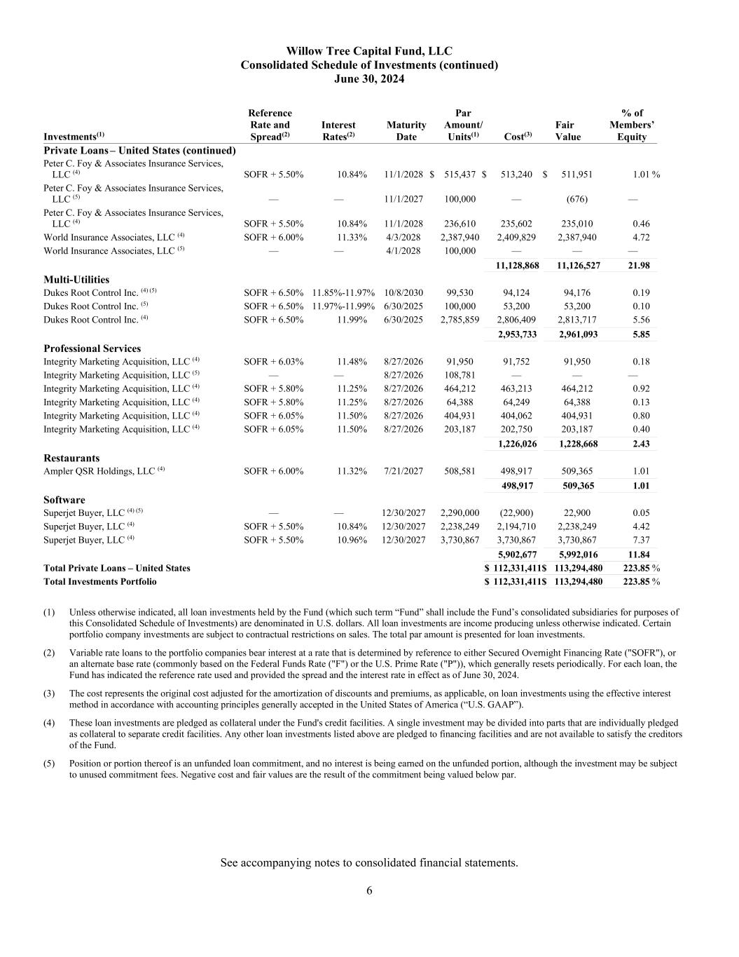 Willow Tree Capital Fund, LLC Consolidated Schedule of Investments (continued) June 30, 2024 See accompanying notes to consolidated financial statements. 6 Investments(1) Reference Rate and Spread(2) Interest Rates(2) Maturity Date Par Amount/ Units(1) Cost(3) Fair Value % of Members’ Equity Private Loans – United States (continued) Peter C. Foy & Associates Insurance Services, LLC (4) SOFR + 5.50% 10.84% 11/1/2028 $ 515,437 $ 513,240 $ 511,951 1.01 % Peter C. Foy & Associates Insurance Services, LLC (5) — — 11/1/2027 100,000 — (676) — Peter C. Foy & Associates Insurance Services, LLC (4) SOFR + 5.50% 10.84% 11/1/2028 236,610 235,602 235,010 0.46 World Insurance Associates, LLC (4) SOFR + 6.00% 11.33% 4/3/2028 2,387,940 2,409,829 2,387,940 4.72 World Insurance Associates, LLC (5) — — 4/1/2028 100,000 — — — _____________________________________________________________________________________________ ____________________________________________________________________________________ ______________________________________________________________________________________________________ 11,128,868 11,126,527 21.98 _____________________________________________________________________________________________ ____________________________________________________________________________________ ______________________________________________________________________________________________________ Multi-Utilities Dukes Root Control Inc. (4) (5) SOFR + 6.50% 11.85%-11.97% 10/8/2030 99,530 94,124 94,176 0.19 Dukes Root Control Inc. (5) SOFR + 6.50% 11.97%-11.99% 6/30/2025 100,000 53,200 53,200 0.10 Dukes Root Control Inc. (4) SOFR + 6.50% 11.99% 6/30/2025 2,785,859 2,806,409 2,813,717 5.56 _____________________________________________________________________________________________ ____________________________________________________________________________________ ______________________________________________________________________________________________________ 2,953,733 2,961,093 5.85 _____________________________________________________________________________________________ ____________________________________________________________________________________ ______________________________________________________________________________________________________ Professional Services Integrity Marketing Acquisition, LLC (4) SOFR + 6.03% 11.48% 8/27/2026 91,950 91,752 91,950 0.18 Integrity Marketing Acquisition, LLC (5) — — 8/27/2026 108,781 — — — Integrity Marketing Acquisition, LLC (4) SOFR + 5.80% 11.25% 8/27/2026 464,212 463,213 464,212 0.92 Integrity Marketing Acquisition, LLC (4) SOFR + 5.80% 11.25% 8/27/2026 64,388 64,249 64,388 0.13 Integrity Marketing Acquisition, LLC (4) SOFR + 6.05% 11.50% 8/27/2026 404,931 404,062 404,931 0.80 Integrity Marketing Acquisition, LLC (4) SOFR + 6.05% 11.50% 8/27/2026 203,187 202,750 203,187 0.40 _____________________________________________________________________________________________ ____________________________________________________________________________________ ______________________________________________________________________________________________________ 1,226,026 1,228,668 2.43 _____________________________________________________________________________________________ ____________________________________________________________________________________ ______________________________________________________________________________________________________ Restaurants Ampler QSR Holdings, LLC (4) SOFR + 6.00% 11.32% 7/21/2027 508,581 498,917 509,365 1.01 _____________________________________________________________________________________________ ____________________________________________________________________________________ ______________________________________________________________________________________________________ 498,917 509,365 1.01 _____________________________________________________________________________________________ ____________________________________________________________________________________ ______________________________________________________________________________________________________ Software Superjet Buyer, LLC (4) (5) — — 12/30/2027 2,290,000 (22,900) 22,900 0.05 Superjet Buyer, LLC (4) SOFR + 5.50% 10.84% 12/30/2027 2,238,249 2,194,710 2,238,249 4.42 Superjet Buyer, LLC (4) SOFR + 5.50% 10.96% 12/30/2027 3,730,867 3,730,867 3,730,867 7.37 _____________________________________________________________________________________________ ____________________________________________________________________________________ ______________________________________________________________________________________________________ 5,902,677 5,992,016 11.84 _____________________________________________________________________________________________ ____________________________________________________________________________________ ______________________________________________________________________________________________________ Total Private Loans – United States $ 112,331,411 $ 113,294,480 223.85 % _____________________________________________________________________________________________ ____________________________________________________________________________________ ______________________________________________________________________________________________________ Total Investments Portfolio $ 112,331,411 $ 113,294,480 223.85 % _____________________________________________________________________________________________ ____________________________________________________________________________________ ______________________________________________________________________________________________________ (1) Unless otherwise indicated, all loan investments held by the Fund (which such term “Fund” shall include the Fund’s consolidated subsidiaries for purposes of this Consolidated Schedule of Investments) are denominated in U.S. dollars. All loan i