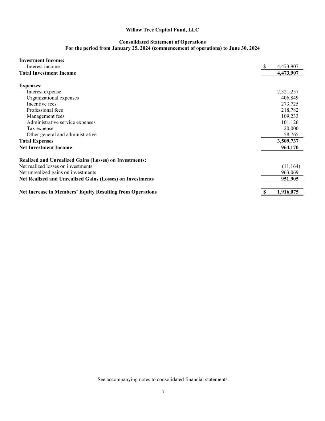 See accompanying notes to consolidated financial statements. 7 Willow Tree Capital Fund, LLC Consolidated Statement of Operations For the period from January 25, 2024 (commencement of operations) to June 30, 2024 Investment Income: Interest income $ 4,473,907 Total Investment Income 4,473,907 Expenses: Interest expense 2,321,257 Organizational expenses 406,849 Incentive fees 273,725 Professional fees 218,782 Management fees 109,233 Administrative service expenses 101,126 Tax expense 20,000 Other general and administrative 58,765 Total Expenses 3,509,737 Net Investment Income 964,170 Realized and Unrealized Gains (Losses) on Investments: Net realized losses on investments (11,164) Net unrealized gains on investments 963,069 Net Realized and Unrealized Gains (Losses) on Investments 951,905 Net Increase in Members’ Equity Resulting from Operations $ 1,916,075