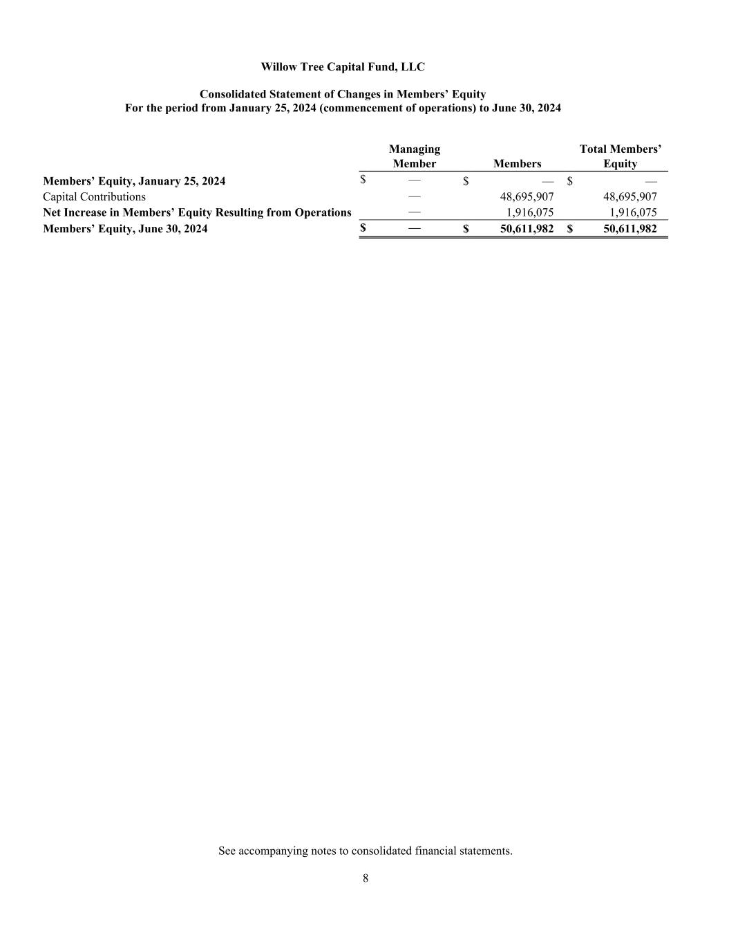 See accompanying notes to consolidated financial statements. 8 Willow Tree Capital Fund, LLC Consolidated Statement of Changes in Members’ Equity For the period from January 25, 2024 (commencement of operations) to June 30, 2024 Managing Member Members Total Members’ Equity Members’ Equity, January 25, 2024 $ — $ — $ — Capital Contributions — 48,695,907 48,695,907 Net Increase in Members’ Equity Resulting from Operations — 1,916,075 1,916,075 Members’ Equity, June 30, 2024 $ — $ 50,611,982 $ 50,611,982