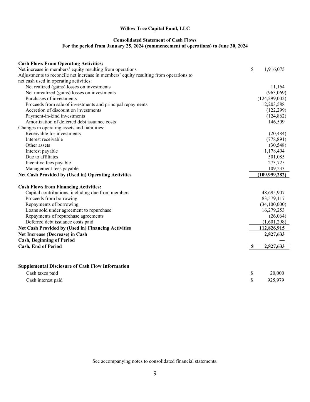 See accompanying notes to consolidated financial statements. 9 Willow Tree Capital Fund, LLC Consolidated Statement of Cash Flows For the period from January 25, 2024 (commencement of operations) to June 30, 2024 Cash Flows From Operating Activities: Net increase in members’ equity resulting from operations $ 1,916,075 Adjustments to reconcile net increase in members’ equity resulting from operations to net cash used in operating activities: Net realized (gains) losses on investments 11,164 Net unrealized (gains) losses on investments (963,069) Purchases of investments (124,299,002) Proceeds from sale of investments and principal repayments 12,203,588 Accretion of discount on investments (122,299) Payment-in-kind investments (124,862) Amortization of deferred debt issuance costs 146,509 Changes in operating assets and liabilities: Receivable for investments (20,484) Interest receivable (778,891) Other assets (30,548) Interest payable 1,178,494 Due to affiliates 501,085 Incentive fees payable 273,725 Management fees payable 109,233 Net Cash Provided by (Used in) Operating Activities (109,999,282) Cash Flows from Financing Activities: Capital contributions, including due from members 48,695,907 Proceeds from borrowing 83,579,117 Repayments of borrowing (34,100,000) Loans sold under agreement to repurchase 16,279,253 Repayments of repurchase agreements (26,064) Deferred debt issuance costs paid (1,601,298) Net Cash Provided by (Used in) Financing Activities 112,826,915 Net Increase (Decrease) in Cash 2,827,633 Cash, Beginning of Period — Cash, End of Period $ 2,827,633 Supplemental Disclosure of Cash Flow Information Cash taxes paid $ 20,000 Cash interest paid $ 925,979
