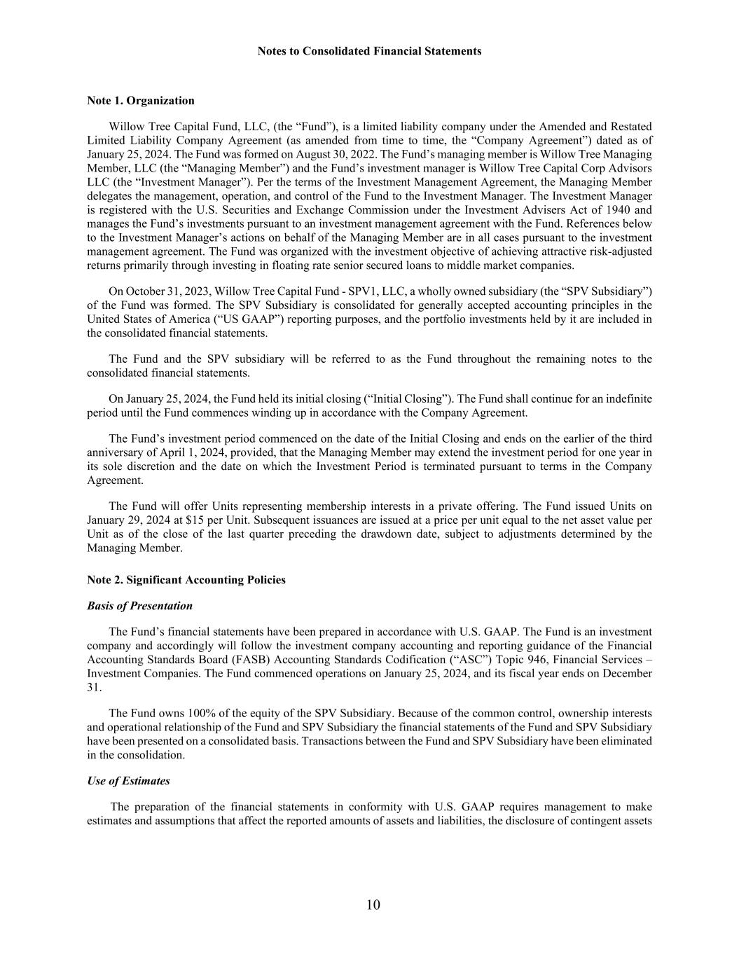 Notes to Consolidated Financial Statements 10 Note 1. Organization Willow Tree Capital Fund, LLC, (the “Fund”), is a limited liability company under the Amended and Restated Limited Liability Company Agreement (as amended from time to time, the “Company Agreement”) dated as of January 25, 2024. The Fund was formed on August 30, 2022. The Fund’s managing member is Willow Tree Managing Member, LLC (the “Managing Member”) and the Fund’s investment manager is Willow Tree Capital Corp Advisors LLC (the “Investment Manager”). Per the terms of the Investment Management Agreement, the Managing Member delegates the management, operation, and control of the Fund to the Investment Manager. The Investment Manager is registered with the U.S. Securities and Exchange Commission under the Investment Advisers Act of 1940 and manages the Fund’s investments pursuant to an investment management agreement with the Fund. References below to the Investment Manager’s actions on behalf of the Managing Member are in all cases pursuant to the investment management agreement. The Fund was organized with the investment objective of achieving attractive risk-adjusted returns primarily through investing in floating rate senior secured loans to middle market companies. On October 31, 2023, Willow Tree Capital Fund - SPV1, LLC, a wholly owned subsidiary (the “SPV Subsidiary”) of the Fund was formed. The SPV Subsidiary is consolidated for generally accepted accounting principles in the United States of America (“US GAAP”) reporting purposes, and the portfolio investments held by it are included in the consolidated financial statements. The Fund and the SPV subsidiary will be referred to as the Fund throughout the remaining notes to the consolidated financial statements. On January 25, 2024, the Fund held its initial closing (“Initial Closing”). The Fund shall continue for an indefinite period until the Fund commences winding up in accordance with the Company Agreement. The Fund’s investment period commenced on the date of the Initial Closing and ends on the earlier of the third anniversary of April 1, 2024, provided, that the Managing Member may extend the investment period for one year in its sole discretion and the date on which the Investment Period is terminated pursuant to terms in the Company Agreement. The Fund will offer Units representing membership interests in a private offering. The Fund issued Units on January 29, 2024 at $15 per Unit. Subsequent issuances are issued at a price per unit equal to the net asset value per Unit as of the close of the last quarter preceding the drawdown date, subject to adjustments determined by the Managing Member. Note 2. Significant Accounting Policies Basis of Presentation The Fund’s financial statements have been prepared in accordance with U.S. GAAP. The Fund is an investment company and accordingly will follow the investment company accounting and reporting guidance of the Financial Accounting Standards Board (FASB) Accounting Standards Codification (“ASC”) Topic 946, Financial Services – Investment Companies. The Fund commenced operations on January 25, 2024, and its fiscal year ends on December 31. The Fund owns 100% of the equity of the SPV Subsidiary. Because of the common control, ownership interests and operational relationship of the Fund and SPV Subsidiary the financial statements of the Fund and SPV Subsidiary have been presented on a consolidated basis. Transactions between the Fund and SPV Subsidiary have been eliminated in the consolidation. Use of Estimates The preparation of the financial statements in conformity with U.S. GAAP requires management to make estimates and assumptions that affect the reported amounts of assets and liabilities, the disclosure of contingent assets