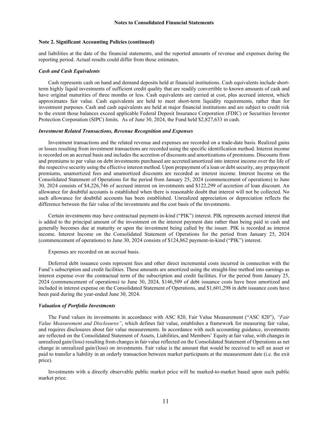Notes to Consolidated Financial Statements 11 Note 2. Significant Accounting Policies (continued) and liabilities at the date of the financial statements, and the reported amounts of revenue and expenses during the reporting period. Actual results could differ from those estimates. Cash and Cash Equivalents Cash represents cash on hand and demand deposits held at financial institutions. Cash equivalents include short- term highly liquid investments of sufficient credit quality that are readily convertible to known amounts of cash and have original maturities of three months or less. Cash equivalents are carried at cost, plus accrued interest, which approximates fair value. Cash equivalents are held to meet short-term liquidity requirements, rather than for investment purposes. Cash and cash equivalents are held at major financial institutions and are subject to credit risk to the extent those balances exceed applicable Federal Deposit Insurance Corporation (FDIC) or Securities Investor Protection Corporation (SIPC) limits. As of June 30, 2024, the Fund held $2,827,633 in cash. Investment Related Transactions, Revenue Recognition and Expenses Investment transactions and the related revenue and expenses are recorded on a trade-date basis. Realized gains or losses resulting from investment transactions are recorded using the specific identification method. Interest income is recorded on an accrual basis and includes the accretion of discounts and amortizations of premiums. Discounts from and premiums to par value on debt investments purchased are accreted/amortized into interest income over the life of the respective security using the effective interest method. Upon prepayment of a loan or debt security, any prepayment premiums, unamortized fees and unamortized discounts are recorded as interest income. Interest Income on the Consolidated Statement of Operations for the period from January 25, 2024 (commencement of operations) to June 30, 2024 consists of $4,226,746 of accrued interest on investments and $122,299 of accretion of loan discount. An allowance for doubtful accounts is established when there is reasonable doubt that interest will not be collected. No such allowance for doubtful accounts has been established. Unrealized appreciation or depreciation reflects the difference between the fair value of the investments and the cost basis of the investments. Certain investments may have contractual payment-in-kind (“PIK”) interest. PIK represents accrued interest that is added to the principal amount of the investment on the interest payment date rather than being paid in cash and generally becomes due at maturity or upon the investment being called by the issuer. PIK is recorded as interest income. Interest Income on the Consolidated Statement of Operations for the period from January 25, 2024 (commencement of operations) to June 30, 2024 consists of $124,862 payment-in-kind (“PIK”) interest. Expenses are recorded on an accrual basis. Deferred debt issuance costs represent fees and other direct incremental costs incurred in connection with the Fund’s subscription and credit facilities. These amounts are amortized using the straight-line method into earnings as interest expense over the contractual term of the subscription and credit facilities. For the period from January 25, 2024 (commencement of operations) to June 30, 2024, $146,509 of debt issuance costs have been amortized and included in interest expense on the Consolidated Statement of Operations, and $1,601,298 in debt issuance costs have been paid during the year-ended June 30, 2024. Valuation of Portfolio Investments The Fund values its investments in accordance with ASC 820, Fair Value Measurement (“ASC 820”), “Fair Value Measurement and Disclosures”, which defines fair value, establishes a framework for measuring fair value, and requires disclosures about fair value measurements. In accordance with such accounting guidance, investments are reflected on the Consolidated Statement of Assets, Liabilities, and Members’ Equity at fair value, with changes in unrealized gain/(loss) resulting from changes in fair value reflected on the Consolidated Statement of Operations as net change in unrealized gain/(loss) on investments. Fair value is the amount that would be received to sell an asset or paid to transfer a liability in an orderly transaction between market participants at the measurement date (i.e. the exit price). Investments with a directly observable public market price will be marked-to-market based upon such public market price.
