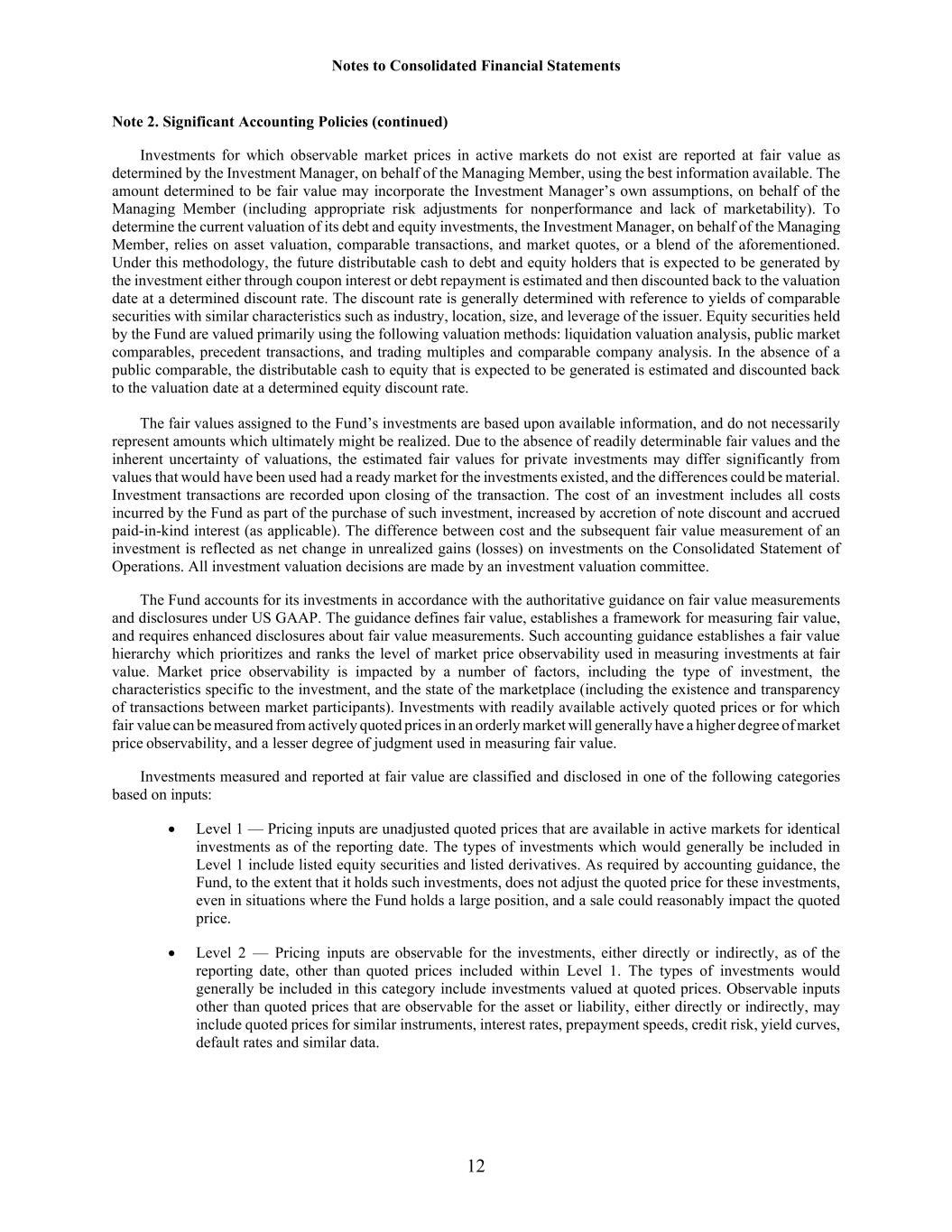 Notes to Consolidated Financial Statements 12 Note 2. Significant Accounting Policies (continued) Investments for which observable market prices in active markets do not exist are reported at fair value as determined by the Investment Manager, on behalf of the Managing Member, using the best information available. The amount determined to be fair value may incorporate the Investment Manager’s own assumptions, on behalf of the Managing Member (including appropriate risk adjustments for nonperformance and lack of marketability). To determine the current valuation of its debt and equity investments, the Investment Manager, on behalf of the Managing Member, relies on asset valuation, comparable transactions, and market quotes, or a blend of the aforementioned. Under this methodology, the future distributable cash to debt and equity holders that is expected to be generated by the investment either through coupon interest or debt repayment is estimated and then discounted back to the valuation date at a determined discount rate. The discount rate is generally determined with reference to yields of comparable securities with similar characteristics such as industry, location, size, and leverage of the issuer. Equity securities held by the Fund are valued primarily using the following valuation methods: liquidation valuation analysis, public market comparables, precedent transactions, and trading multiples and comparable company analysis. In the absence of a public comparable, the distributable cash to equity that is expected to be generated is estimated and discounted back to the valuation date at a determined equity discount rate. The fair values assigned to the Fund’s investments are based upon available information, and do not necessarily represent amounts which ultimately might be realized. Due to the absence of readily determinable fair values and the inherent uncertainty of valuations, the estimated fair values for private investments may differ significantly from values that would have been used had a ready market for the investments existed, and the differences could be material. Investment transactions are recorded upon closing of the transaction. The cost of an investment includes all costs incurred by the Fund as part of the purchase of such investment, increased by accretion of note discount and accrued paid-in-kind interest (as applicable). The difference between cost and the subsequent fair value measurement of an investment is reflected as net change in unrealized gains (losses) on investments on the Consolidated Statement of Operations. All investment valuation decisions are made by an investment valuation committee. The Fund accounts for its investments in accordance with the authoritative guidance on fair value measurements and disclosures under US GAAP. The guidance defines fair value, establishes a framework for measuring fair value, and requires enhanced disclosures about fair value measurements. Such accounting guidance establishes a fair value hierarchy which prioritizes and ranks the level of market price observability used in measuring investments at fair value. Market price observability is impacted by a number of factors, including the type of investment, the characteristics specific to the investment, and the state of the marketplace (including the existence and transparency of transactions between market participants). Investments with readily available actively quoted prices or for which fair value can be measured from actively quoted prices in an orderly market will generally have a higher degree of market price observability, and a lesser degree of judgment used in measuring fair value. Investments measured and reported at fair value are classified and disclosed in one of the following categories based on inputs: • Level 1 — Pricing inputs are unadjusted quoted prices that are available in active markets for identical investments as of the reporting date. The types of investments which would generally be included in Level 1 include listed equity securities and listed derivatives. As required by accounting guidance, the Fund, to the extent that it holds such investments, does not adjust the quoted price for these investments, even in situations where the Fund holds a large position, and a sale could reasonably impact the quoted price. • Level 2 — Pricing inputs are observable for the investments, either directly or indirectly, as of the reporting date, other than quoted prices included within Level 1. The types of investments would generally be included in this category include investments valued at quoted prices. Observable inputs other than quoted prices that are observable for the asset or liability, either directly or indirectly, may include quoted prices for similar instruments, interest rates, prepayment speeds, credit risk, yield curves, default rates and similar data.