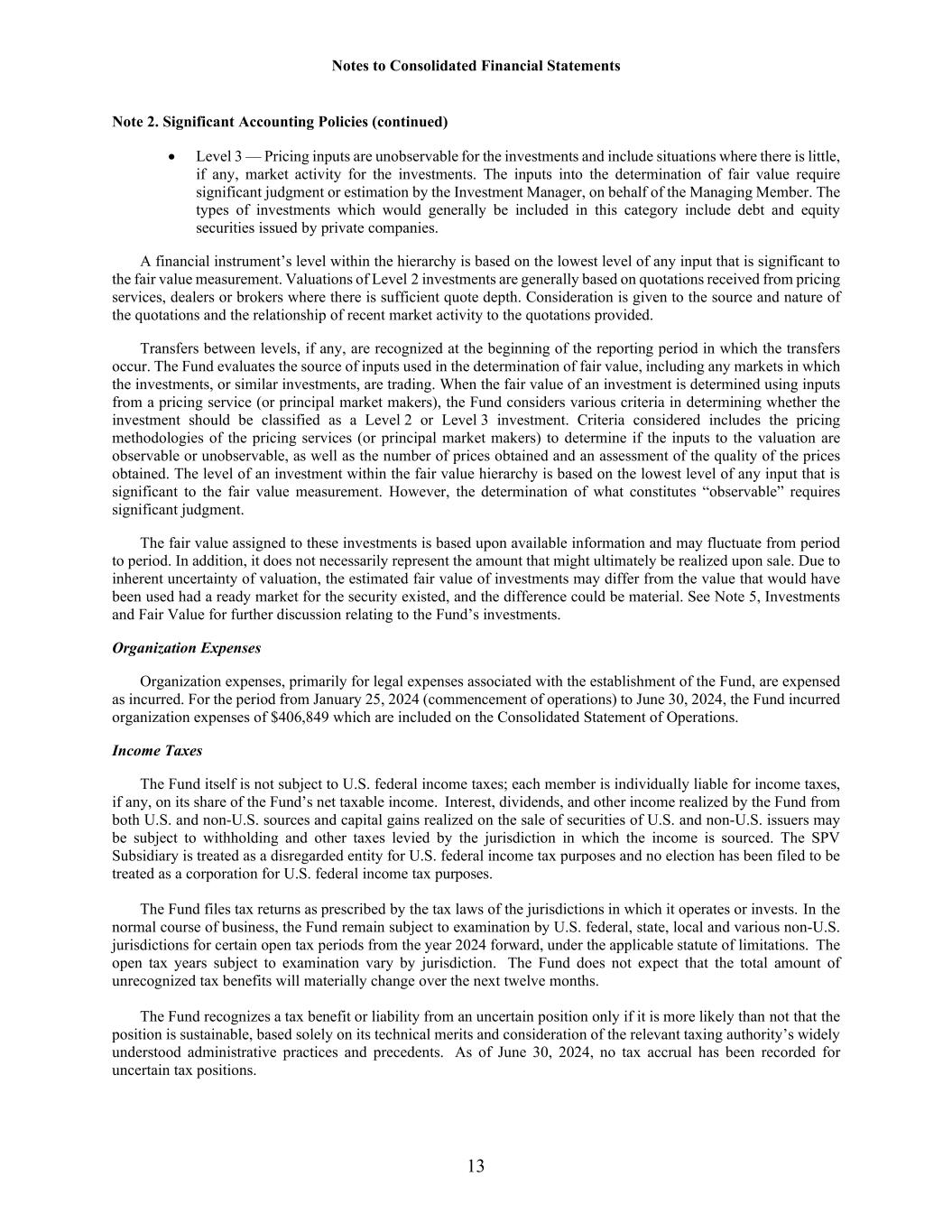 Notes to Consolidated Financial Statements 13 Note 2. Significant Accounting Policies (continued) • Level 3 — Pricing inputs are unobservable for the investments and include situations where there is little, if any, market activity for the investments. The inputs into the determination of fair value require significant judgment or estimation by the Investment Manager, on behalf of the Managing Member. The types of investments which would generally be included in this category include debt and equity securities issued by private companies. A financial instrument’s level within the hierarchy is based on the lowest level of any input that is significant to the fair value measurement. Valuations of Level 2 investments are generally based on quotations received from pricing services, dealers or brokers where there is sufficient quote depth. Consideration is given to the source and nature of the quotations and the relationship of recent market activity to the quotations provided. Transfers between levels, if any, are recognized at the beginning of the reporting period in which the transfers occur. The Fund evaluates the source of inputs used in the determination of fair value, including any markets in which the investments, or similar investments, are trading. When the fair value of an investment is determined using inputs from a pricing service (or principal market makers), the Fund considers various criteria in determining whether the investment should be classified as a Level 2 or Level 3 investment. Criteria considered includes the pricing methodologies of the pricing services (or principal market makers) to determine if the inputs to the valuation are observable or unobservable, as well as the number of prices obtained and an assessment of the quality of the prices obtained. The level of an investment within the fair value hierarchy is based on the lowest level of any input that is significant to the fair value measurement. However, the determination of what constitutes “observable” requires significant judgment. The fair value assigned to these investments is based upon available information and may fluctuate from period to period. In addition, it does not necessarily represent the amount that might ultimately be realized upon sale. Due to inherent uncertainty of valuation, the estimated fair value of investments may differ from the value that would have been used had a ready market for the security existed, and the difference could be material. See Note 5, Investments and Fair Value for further discussion relating to the Fund’s investments. Organization Expenses Organization expenses, primarily for legal expenses associated with the establishment of the Fund, are expensed as incurred. For the period from January 25, 2024 (commencement of operations) to June 30, 2024, the Fund incurred organization expenses of $406,849 which are included on the Consolidated Statement of Operations. Income Taxes The Fund itself is not subject to U.S. federal income taxes; each member is individually liable for income taxes, if any, on its share of the Fund’s net taxable income. Interest, dividends, and other income realized by the Fund from both U.S. and non-U.S. sources and capital gains realized on the sale of securities of U.S. and non-U.S. issuers may be subject to withholding and other taxes levied by the jurisdiction in which the income is sourced. The SPV Subsidiary is treated as a disregarded entity for U.S. federal income tax purposes and no election has been filed to be treated as a corporation for U.S. federal income tax purposes. The Fund files tax returns as prescribed by the tax laws of the jurisdictions in which it operates or invests. In the normal course of business, the Fund remain subject to examination by U.S. federal, state, local and various non-U.S. jurisdictions for certain open tax periods from the year 2024 forward, under the applicable statute of limitations. The open tax years subject to examination vary by jurisdiction. The Fund does not expect that the total amount of unrecognized tax benefits will materially change over the next twelve months. The Fund recognizes a tax benefit or liability from an uncertain position only if it is more likely than not that the position is sustainable, based solely on its technical merits and consideration of the relevant taxing authority’s widely understood administrative practices and precedents. As of June 30, 2024, no tax accrual has been recorded for uncertain tax positions.