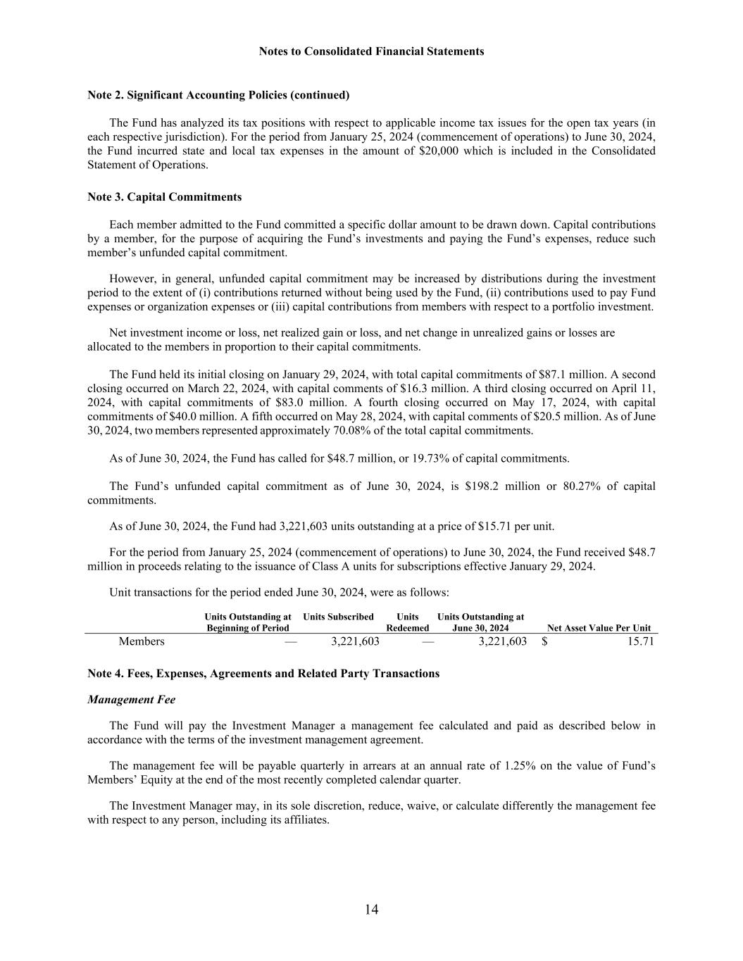 Notes to Consolidated Financial Statements 14 Note 2. Significant Accounting Policies (continued) The Fund has analyzed its tax positions with respect to applicable income tax issues for the open tax years (in each respective jurisdiction). For the period from January 25, 2024 (commencement of operations) to June 30, 2024, the Fund incurred state and local tax expenses in the amount of $20,000 which is included in the Consolidated Statement of Operations. Note 3. Capital Commitments Each member admitted to the Fund committed a specific dollar amount to be drawn down. Capital contributions by a member, for the purpose of acquiring the Fund’s investments and paying the Fund’s expenses, reduce such member’s unfunded capital commitment. However, in general, unfunded capital commitment may be increased by distributions during the investment period to the extent of (i) contributions returned without being used by the Fund, (ii) contributions used to pay Fund expenses or organization expenses or (iii) capital contributions from members with respect to a portfolio investment. Net investment income or loss, net realized gain or loss, and net change in unrealized gains or losses are allocated to the members in proportion to their capital commitments. The Fund held its initial closing on January 29, 2024, with total capital commitments of $87.1 million. A second closing occurred on March 22, 2024, with capital comments of $16.3 million. A third closing occurred on April 11, 2024, with capital commitments of $83.0 million. A fourth closing occurred on May 17, 2024, with capital commitments of $40.0 million. A fifth occurred on May 28, 2024, with capital comments of $20.5 million. As of June 30, 2024, two members represented approximately 70.08% of the total capital commitments. As of June 30, 2024, the Fund has called for $48.7 million, or 19.73% of capital commitments. The Fund’s unfunded capital commitment as of June 30, 2024, is $198.2 million or 80.27% of capital commitments. As of June 30, 2024, the Fund had 3,221,603 units outstanding at a price of $15.71 per unit. For the period from January 25, 2024 (commencement of operations) to June 30, 2024, the Fund received $48.7 million in proceeds relating to the issuance of Class A units for subscriptions effective January 29, 2024. Unit transactions for the period ended June 30, 2024, were as follows: Units Outstanding at Beginning of Period Units Subscribed Units Redeemed Units Outstanding at June 30, 2024 Net Asset Value Per Unit Members — 3,221,603 — 3,221,603 $ 15.71 Note 4. Fees, Expenses, Agreements and Related Party Transactions Management Fee The Fund will pay the Investment Manager a management fee calculated and paid as described below in accordance with the terms of the investment management agreement. The management fee will be payable quarterly in arrears at an annual rate of 1.25% on the value of Fund’s Members’ Equity at the end of the most recently completed calendar quarter. The Investment Manager may, in its sole discretion, reduce, waive, or calculate differently the management fee with respect to any person, including its affiliates.