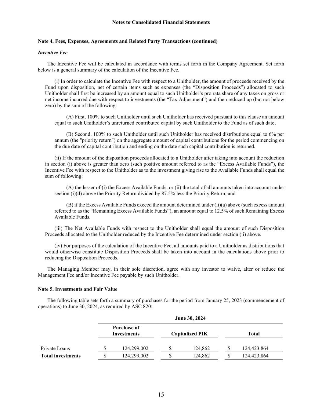 Notes to Consolidated Financial Statements 15 Note 4. Fees, Expenses, Agreements and Related Party Transactions (continued) Incentive Fee The Incentive Fee will be calculated in accordance with terms set forth in the Company Agreement. Set forth below is a general summary of the calculation of the Incentive Fee. (i) In order to calculate the Incentive Fee with respect to a Unitholder, the amount of proceeds received by the Fund upon disposition, net of certain items such as expenses (the “Disposition Proceeds”) allocated to such Unitholder shall first be increased by an amount equal to such Unitholder’s pro rata share of any taxes on gross or net income incurred due with respect to investments (the “Tax Adjustment”) and then reduced up (but not below zero) by the sum of the following: (A) First, 100% to such Unitholder until such Unitholder has received pursuant to this clause an amount equal to such Unitholder’s unreturned contributed capital by such Unitholder to the Fund as of such date; (B) Second, 100% to such Unitholder until such Unitholder has received distributions equal to 6% per annum (the "priority return") on the aggregate amount of capital contributions for the period commencing on the due date of capital contribution and ending on the date such capital contribution is returned. (ii) If the amount of the disposition proceeds allocated to a Unitholder after taking into account the reduction in section (i) above is greater than zero (such positive amount referred to as the “Excess Available Funds”), the Incentive Fee with respect to the Unitholder as to the investment giving rise to the Available Funds shall equal the sum of following: (A) the lesser of (i) the Excess Available Funds, or (ii) the total of all amounts taken into account under section (i)(d) above the Priority Return divided by 87.5% less the Priority Return; and (B) if the Excess Available Funds exceed the amount determined under (ii)(a) above (such excess amount referred to as the “Remaining Excess Available Funds”), an amount equal to 12.5% of such Remaining Excess Available Funds. (iii) The Net Available Funds with respect to the Unitholder shall equal the amount of such Disposition Proceeds allocated to the Unitholder reduced by the Incentive Fee determined under section (ii) above. (iv) For purposes of the calculation of the Incentive Fee, all amounts paid to a Unitholder as distributions that would otherwise constitute Disposition Proceeds shall be taken into account in the calculations above prior to reducing the Disposition Proceeds. The Managing Member may, in their sole discretion, agree with any investor to waive, alter or reduce the Management Fee and/or Incentive Fee payable by such Unitholder. Note 5. Investments and Fair Value The following table sets forth a summary of purchases for the period from January 25, 2023 (commencement of operations) to June 30, 2024, as required by ASC 820: June 30, 2024 Purchase of Investments Capitalized PIK Total Private Loans $ 124,299,002 $ 124,862 $ 124,423,864 Total investments $ 124,299,002 $ 124,862 $ 124,423,864