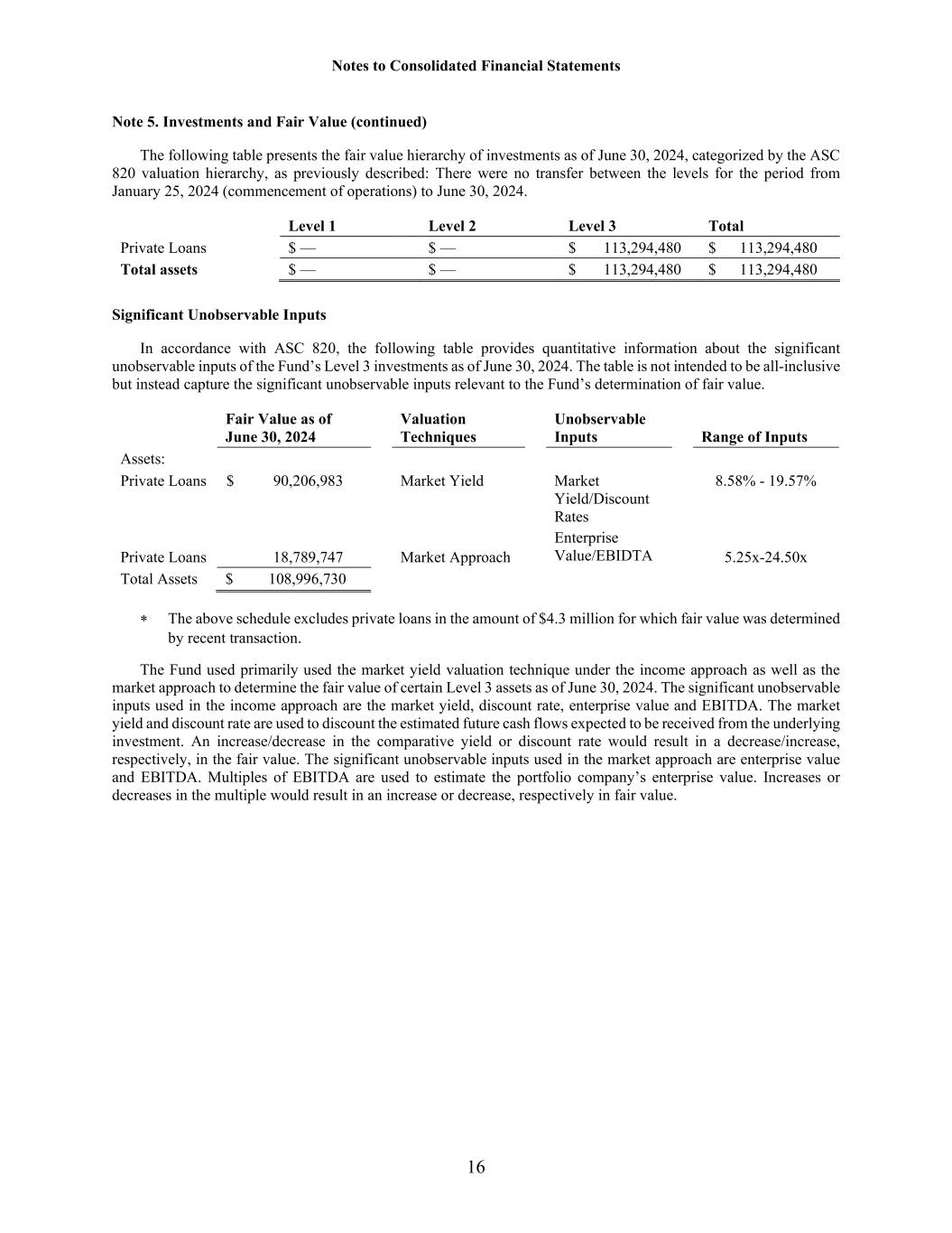 Notes to Consolidated Financial Statements 16 Note 5. Investments and Fair Value (continued) The following table presents the fair value hierarchy of investments as of June 30, 2024, categorized by the ASC 820 valuation hierarchy, as previously described: There were no transfer between the levels for the period from January 25, 2024 (commencement of operations) to June 30, 2024. Level 1 Level 2 Level 3 Total Private Loans $ — $ — $ 113,294,480 $ 113,294,480 Total assets $ — $ — $ 113,294,480 $ 113,294,480 Significant Unobservable Inputs In accordance with ASC 820, the following table provides quantitative information about the significant unobservable inputs of the Fund’s Level 3 investments as of June 30, 2024. The table is not intended to be all-inclusive but instead capture the significant unobservable inputs relevant to the Fund’s determination of fair value. Fair Value as of June 30, 2024 Valuation Techniques Unobservable Inputs Range of Inputs Assets: Private Loans $ 90,206,983 Market Yield Market Yield/Discount Rates 8.58% - 19.57% Private Loans 18,789,747 Market Approach Enterprise Value/EBIDTA 5.25x-24.50x Total Assets $ 108,996,730 ∗ The above schedule excludes private loans in the amount of $4.3 million for which fair value was determined by recent transaction. The Fund used primarily used the market yield valuation technique under the income approach as well as the market approach to determine the fair value of certain Level 3 assets as of June 30, 2024. The significant unobservable inputs used in the income approach are the market yield, discount rate, enterprise value and EBITDA. The market yield and discount rate are used to discount the estimated future cash flows expected to be received from the underlying investment. An increase/decrease in the comparative yield or discount rate would result in a decrease/increase, respectively, in the fair value. The significant unobservable inputs used in the market approach are enterprise value and EBITDA. Multiples of EBITDA are used to estimate the portfolio company’s enterprise value. Increases or decreases in the multiple would result in an increase or decrease, respectively in fair value.