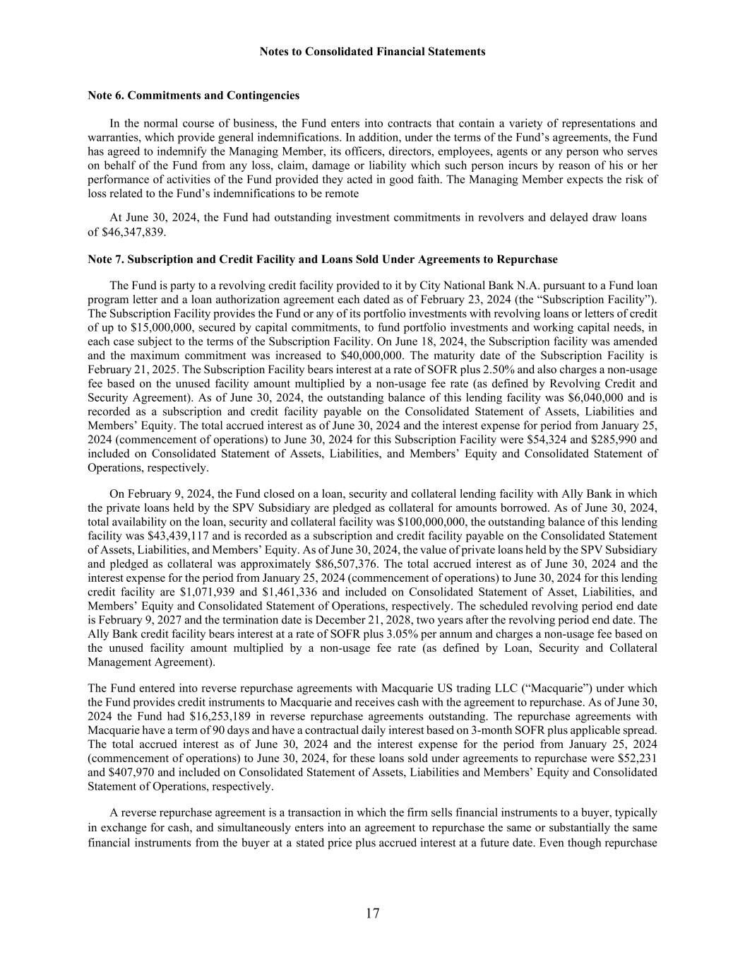 Notes to Consolidated Financial Statements 17 Note 6. Commitments and Contingencies In the normal course of business, the Fund enters into contracts that contain a variety of representations and warranties, which provide general indemnifications. In addition, under the terms of the Fund’s agreements, the Fund has agreed to indemnify the Managing Member, its officers, directors, employees, agents or any person who serves on behalf of the Fund from any loss, claim, damage or liability which such person incurs by reason of his or her performance of activities of the Fund provided they acted in good faith. The Managing Member expects the risk of loss related to the Fund’s indemnifications to be remote At June 30, 2024, the Fund had outstanding investment commitments in revolvers and delayed draw loans of $46,347,839. Note 7. Subscription and Credit Facility and Loans Sold Under Agreements to Repurchase The Fund is party to a revolving credit facility provided to it by City National Bank N.A. pursuant to a Fund loan program letter and a loan authorization agreement each dated as of February 23, 2024 (the “Subscription Facility”). The Subscription Facility provides the Fund or any of its portfolio investments with revolving loans or letters of credit of up to $15,000,000, secured by capital commitments, to fund portfolio investments and working capital needs, in each case subject to the terms of the Subscription Facility. On June 18, 2024, the Subscription facility was amended and the maximum commitment was increased to $40,000,000. The maturity date of the Subscription Facility is February 21, 2025. The Subscription Facility bears interest at a rate of SOFR plus 2.50% and also charges a non-usage fee based on the unused facility amount multiplied by a non-usage fee rate (as defined by Revolving Credit and Security Agreement). As of June 30, 2024, the outstanding balance of this lending facility was $6,040,000 and is recorded as a subscription and credit facility payable on the Consolidated Statement of Assets, Liabilities and Members’ Equity. The total accrued interest as of June 30, 2024 and the interest expense for period from January 25, 2024 (commencement of operations) to June 30, 2024 for this Subscription Facility were $54,324 and $285,990 and included on Consolidated Statement of Assets, Liabilities, and Members’ Equity and Consolidated Statement of Operations, respectively. On February 9, 2024, the Fund closed on a loan, security and collateral lending facility with Ally Bank in which the private loans held by the SPV Subsidiary are pledged as collateral for amounts borrowed. As of June 30, 2024, total availability on the loan, security and collateral facility was $100,000,000, the outstanding balance of this lending facility was $43,439,117 and is recorded as a subscription and credit facility payable on the Consolidated Statement of Assets, Liabilities, and Members’ Equity. As of June 30, 2024, the value of private loans held by the SPV Subsidiary and pledged as collateral was approximately $86,507,376. The total accrued interest as of June 30, 2024 and the interest expense for the period from January 25, 2024 (commencement of operations) to June 30, 2024 for this lending credit facility are $1,071,939 and $1,461,336 and included on Consolidated Statement of Asset, Liabilities, and Members’ Equity and Consolidated Statement of Operations, respectively. The scheduled revolving period end date is February 9, 2027 and the termination date is December 21, 2028, two years after the revolving period end date. The Ally Bank credit facility bears interest at a rate of SOFR plus 3.05% per annum and charges a non-usage fee based on the unused facility amount multiplied by a non-usage fee rate (as defined by Loan, Security and Collateral Management Agreement). The Fund entered into reverse repurchase agreements with Macquarie US trading LLC (“Macquarie”) under which the Fund provides credit instruments to Macquarie and receives cash with the agreement to repurchase. As of June 30, 2024 the Fund had $16,253,189 in reverse repurchase agreements outstanding. The repurchase agreements with Macquarie have a term of 90 days and have a contractual daily interest based on 3-month SOFR plus applicable spread. The total accrued interest as of June 30, 2024 and the interest expense for the period from January 25, 2024 (commencement of operations) to June 30, 2024, for these loans sold under agreements to repurchase were $52,231 and $407,970 and included on Consolidated Statement of Assets, Liabilities and Members’ Equity and Consolidated Statement of Operations, respectively. A reverse repurchase agreement is a transaction in which the firm sells financial instruments to a buyer, typically in exchange for cash, and simultaneously enters into an agreement to repurchase the same or substantially the same financial instruments from the buyer at a stated price plus accrued interest at a future date. Even though repurchase